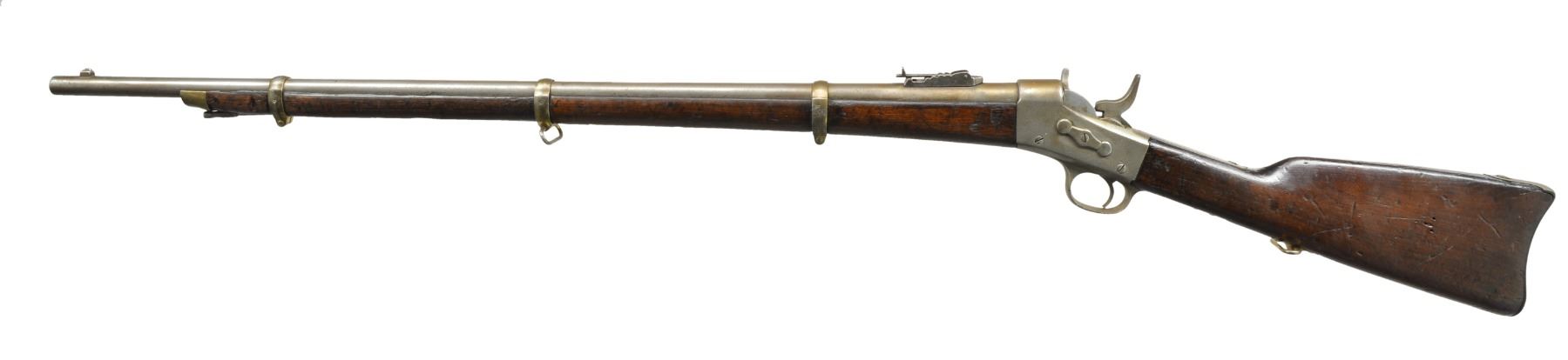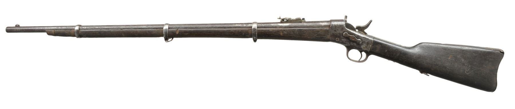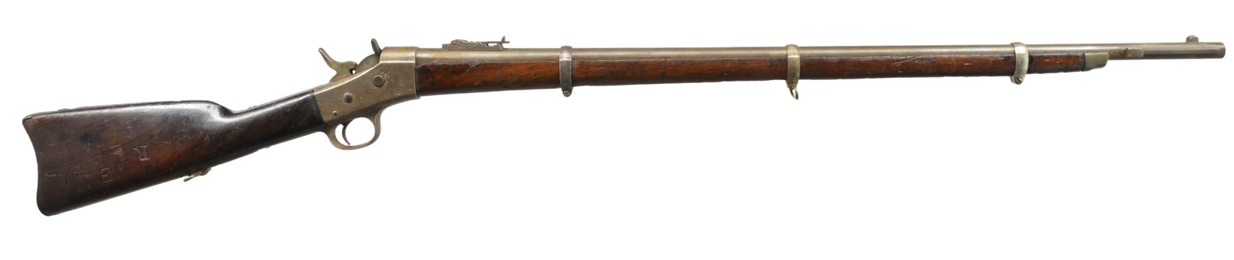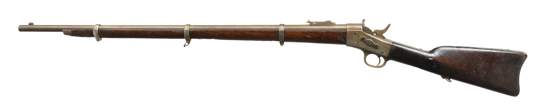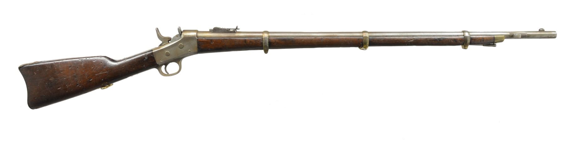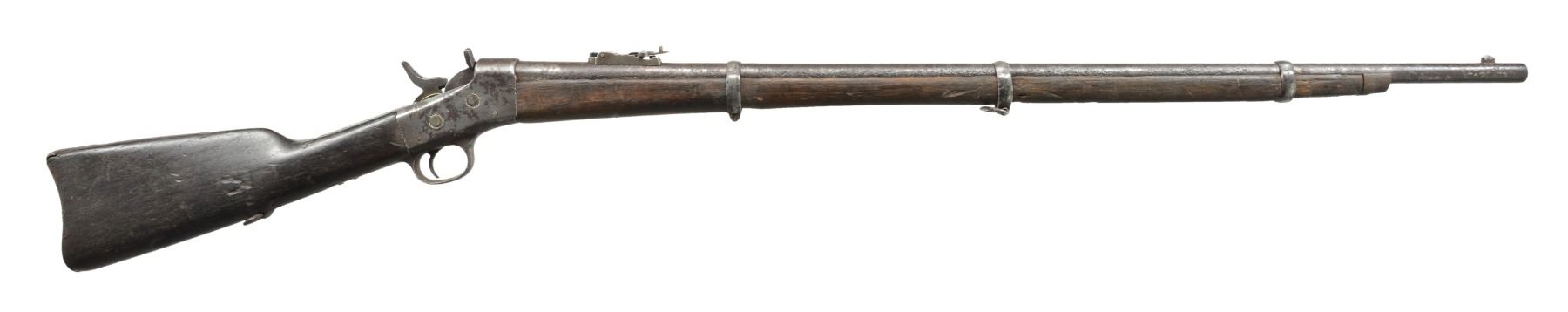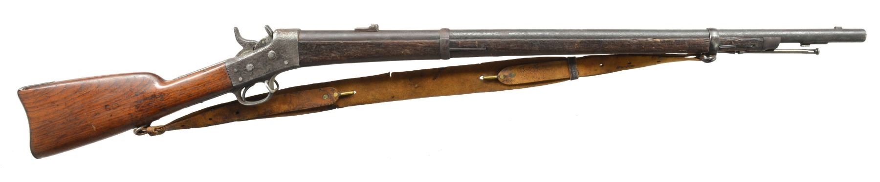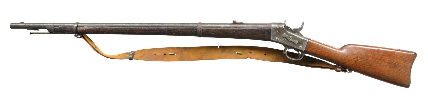 1) SPRINGFIELD 1870 US NAVY . Cal. 50-70 CF. NSN. Bbl. 30 1/2". Blade front sight & broken folding leaf rear sight. Right side of action is marked "USN / SPRINGFIELD / 1870". 2 Band forearm & walnut musket stock w/ steel buttplate. Right side of stock has obscured marking that appears to be "GO". Leather sling on original swivels. Button tipped slotted cleaning rod. CONDITION: metal has mottled gray coloration w/ heavy pitting that appears to be the result of exposure to heat or fire. Dark heavily worn forearm is missing lg. chips having deep dents & handling marks. Stock is heavily sanded & refinished showing dents & handling marks w/ sm. cracks at top tang & buttplate peak. Dark deeply pitted bore. (01-17632/DS). 2) REMINGTON NO. 1. Cal. 43 Spanish. NSN. Bbl. 33 7/8" w/ bayonet lug on right side. Blade front sight w/ military graduated leaf rear sight. Tang has 3 Line address, last patent date March 18, 1874. 3 Band forearm & musket walnut stock w/ steel buttplate & gold anodized sling swivels, bbl. bands & nose cap. Replacement slotted tip cleaning rod. CONDITION: metal has faded gray appearance showing general light pitting. Rear sight is missing slide. Stock & forearm have dark worn appearance w/ dents, heavy gouges & sm. chips. Bore is generally bright w/ worn rifling & sm. spots of pitting. (01-17633/DS). 3) REMINGTON NO.1. Cal. 43 Spanish. NSN. Bbl. 35" w/ blade front sight & graduated leaf military rear sight. 3 Band forearm & walnut musket stock w/ steel buttplate & sling swivels. CONDITION: bbl. & action are heavily pitted. Stock & forearm have age darkened appearance w/ heavy wear, deep dents having numerous cracks & chips around action, buttplate & ramrod channel. Cleaning rod is not present. Pitted bore w/ heavily worn rifling. (01-17638/DS). 4) REMINGTON NO. 1. Cal. 43 Spanish. NSN. Bbl. 33 3/4" w/ bayonet lug on right side. Blade front sight w/ graduated leaf military rear sight missing slide. Tang has partially visible 2 line address. 3 Band forearm & walnut musket stock w/ steel buttplate & sling swivels. Left side of stock has "G" in a circle marking. Right side of stock has hand cut initials "HE", "E", & "R". CONDITION: metal finish has faded to gray w./ light pitting & numerous sm. dents. Stock & forearm have age darkened worn appearance w/ heavy dents having chips around buttplate, bbl. channel & cleaning rod channel. Cleaning rod is not present. Dark heavily pitted bore. (01-17639/DS). ALL ANTIQUE. $800-1,200.
