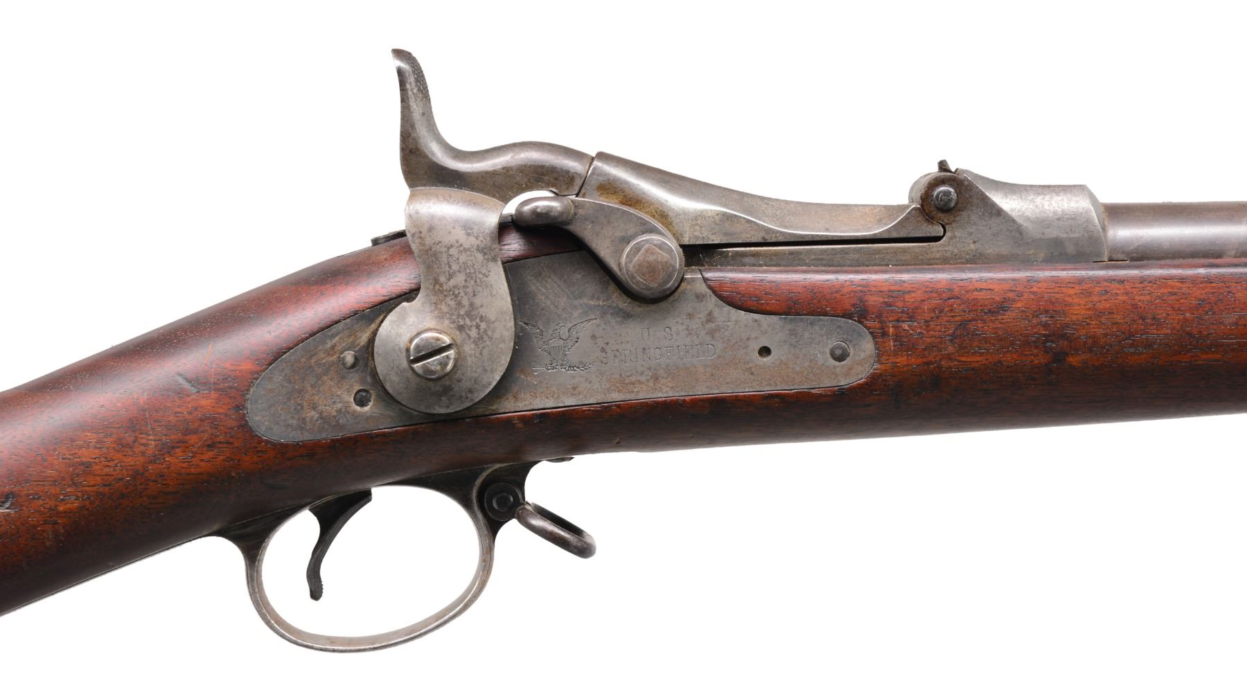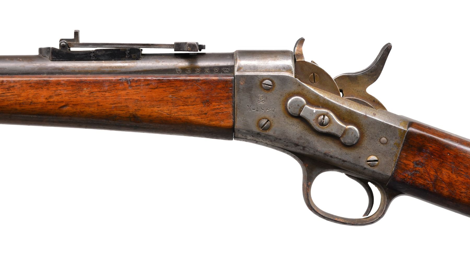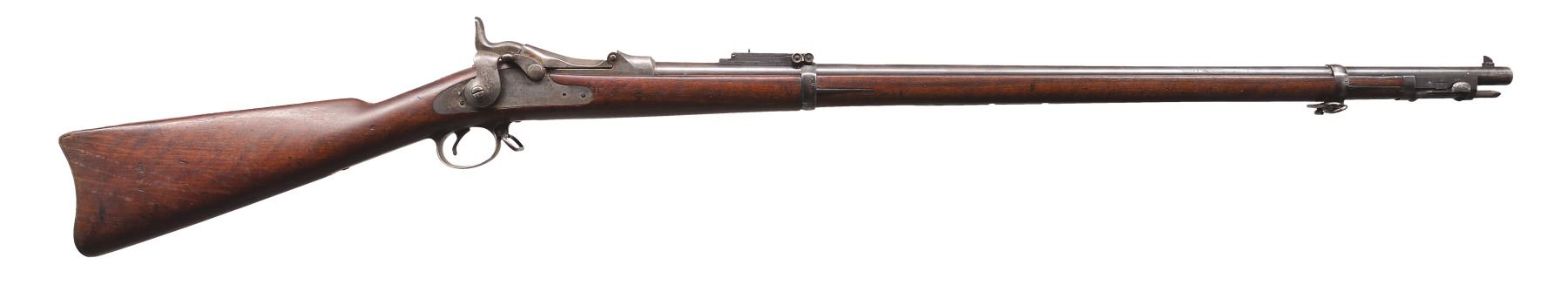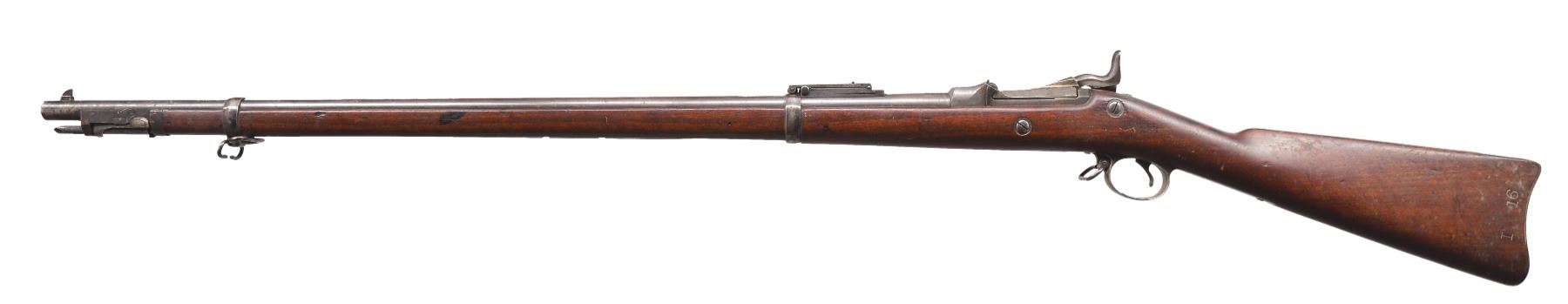 1) TRAPDOOR SPRINGFIELD WITH RAMROD BAYONET. Cal. 45-70. S# 546309. Bbl. 36". Among the last of the trapdoor Springfield rifles, this example conforms w/ "1884" dated breech & "U.S. SPRINGFIELD" marked lock. Cartouche opposite lock has inspector's initials "SWP" (Samuel W. Porter) & "date 1892". Buffington rear sight. CONDITION: very good overall. Retains traces of finish on bbl., breech & lock. Stock is sound w/ good cartouche & rack #s stamped in stock. There is also a circle "P" cartouche on bottom of comb, complete & original. Fine mechanics w/ bright shiny bore. (01-17306/JS). 2) DANISH MODEL 1867 ROLLING BLOCK RIFLE. Cal. 11.7x51R Danish. S# 63252. Bbl. 37 1/2". "Kjobenhavns Toihuus 1882" stamped on rear tang. Standard configuration w/ front blade on pedestal front sight & adj. rear sight, iron mounted. CONDITION: very good overall. Traces of original finish on bbl., metal overall mixed smooth patinas. Mechanics are fine w/ crisp bright bore. PROVENANCE: Estate Collection of Dan Poppen. (01-17307/JS). BOTH ANTIQUE. $800-1,200.