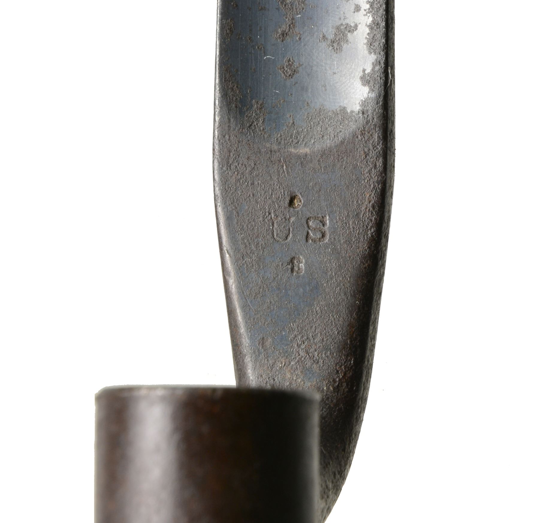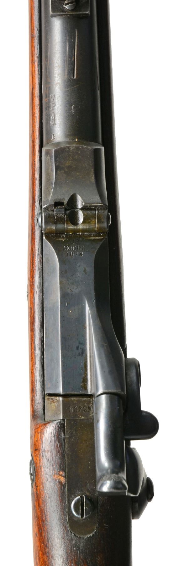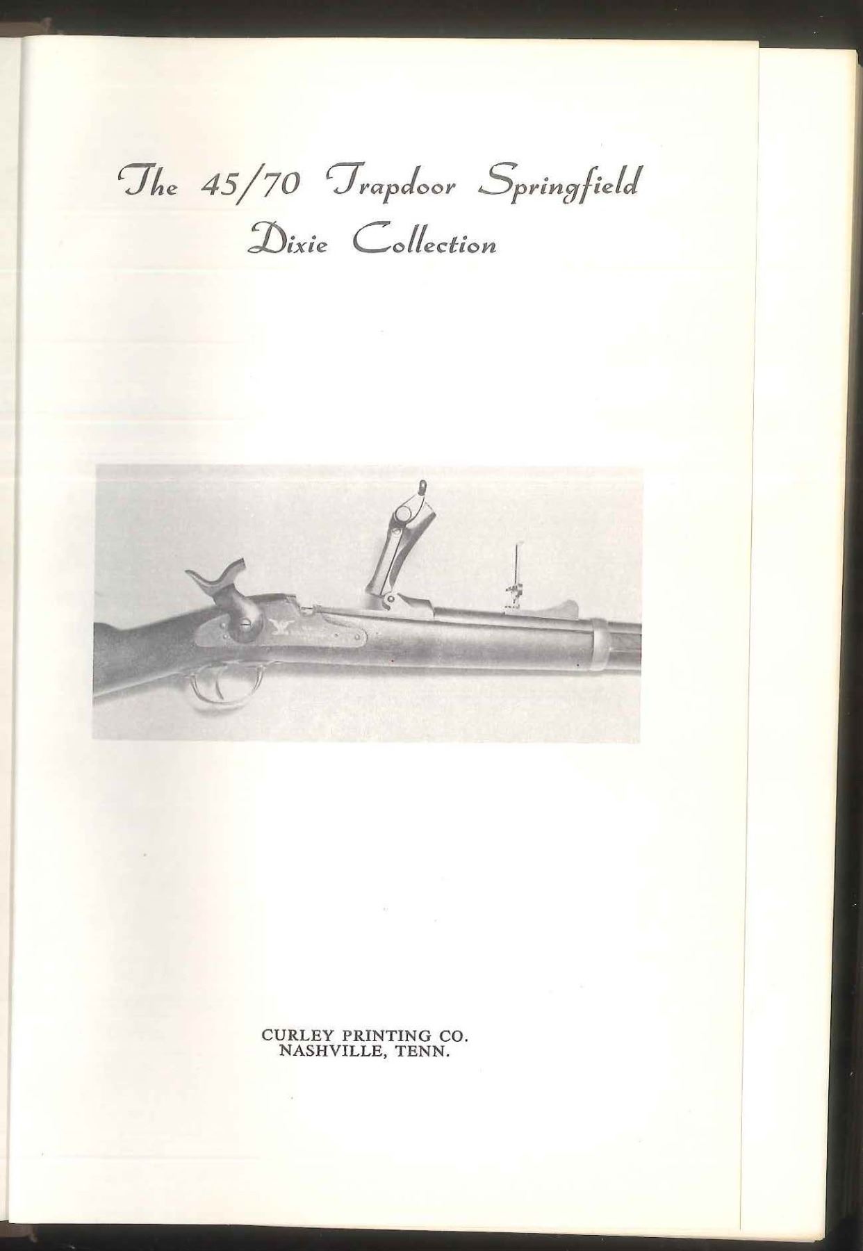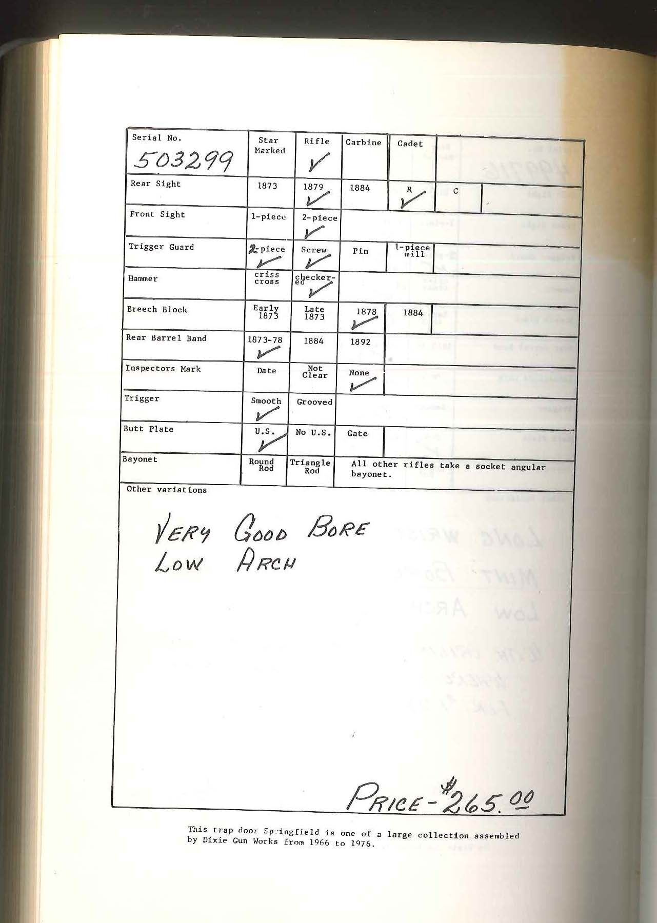 Cal. 45-70. S# 503299. Standard configuration. Bbl. 36" rnd. w/ "VP" eagle head proofs. Breech dated "1873". One of several hundred in published 1975 "45/70 TRAPDOOR SPRINGFIELDS-DIXIE COLLECTION". Has a full page in book which a hard cover copy is included, telling of its configuration. UNATTACHED ACCESSORIES: bayonet & book. CONDITION: fine overall. Metal retains much of its original blue finish. Stock is sound, though refinished w/ no cartouche. Mechanics are crisp & bore is sharp & shiny. Bayonet has approx. 50% of its blue finish w/ balance brown patina w/ rust & pitting. (01-17224/JS). ANTIQUE. $400-600.