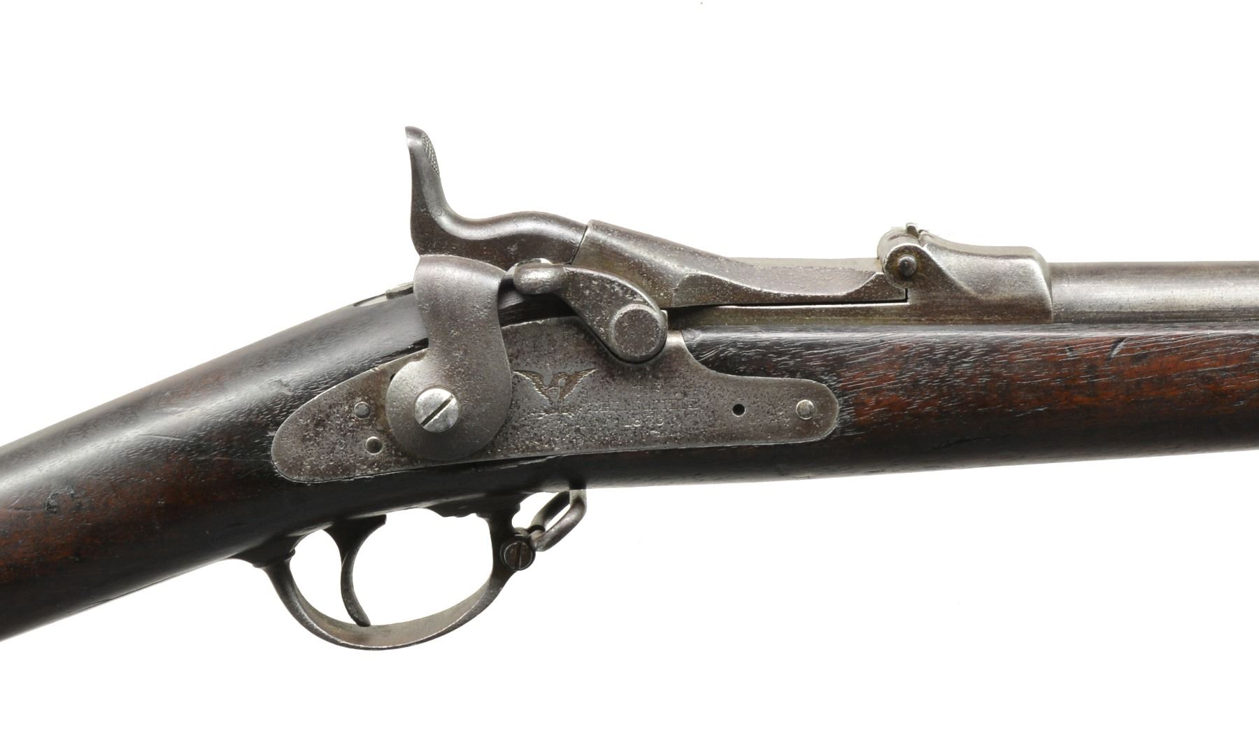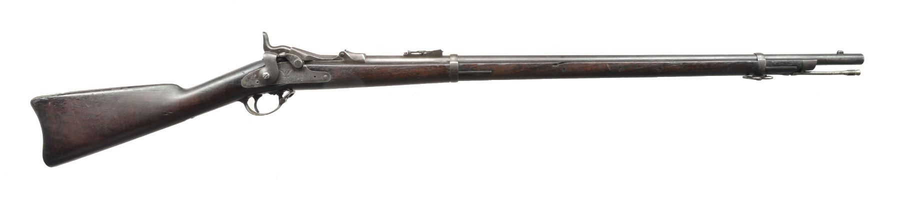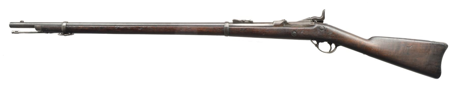 Cal. 45-70. S# 70068. Bbl. 32 1/2”. Correct Model 1873 rear sight graduated to 1,100 yds.; this sight was not marked either “R” or “C”. Rear sight installed w/ unslotted screws. Solid stud front sight. High arch breech block dated 1873. 2 Position tumbler. Flat type lockplate. 2 Piece trigger guard. Correct 1873 type ramrod. Walnut stock. Inspectors cartouche on left side is mostly illegible. Circle script “P” proof behind trigger guard. CONDITION: original finish stock has moderate wear, dents, scratches & staining throughout. Missing chip & crack on right side of forend approx. 6” ahead of lower band. Missing chips behind nose cap. Metal has turned overall gray & patina w/ wear & fine pitting throughout. Dark oxidized bore w/ scattered pitting. (01-17439/RW). ANTIQUE. $300-500.