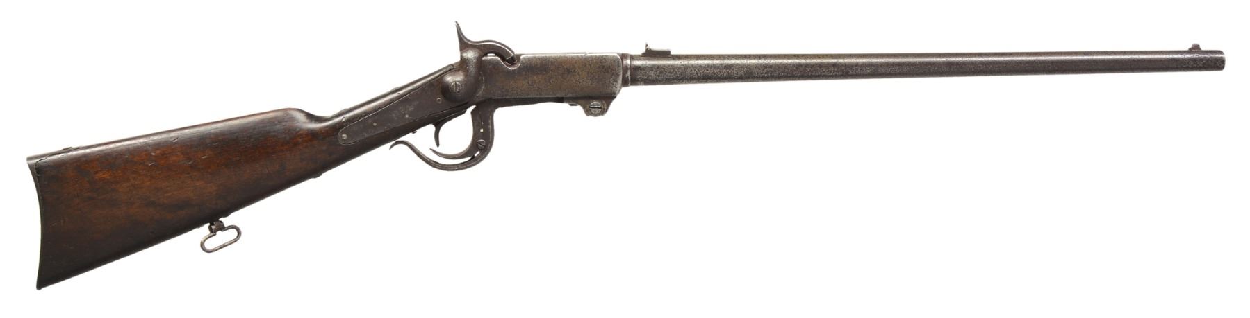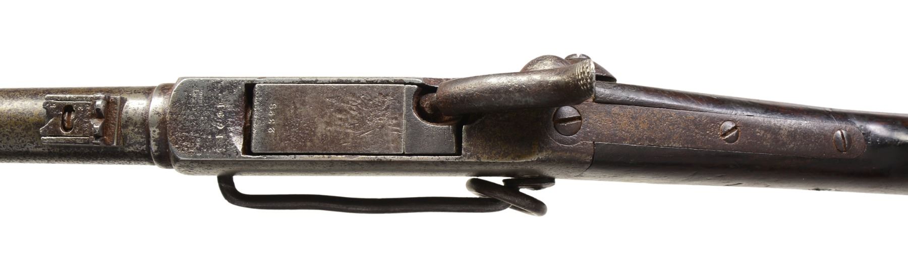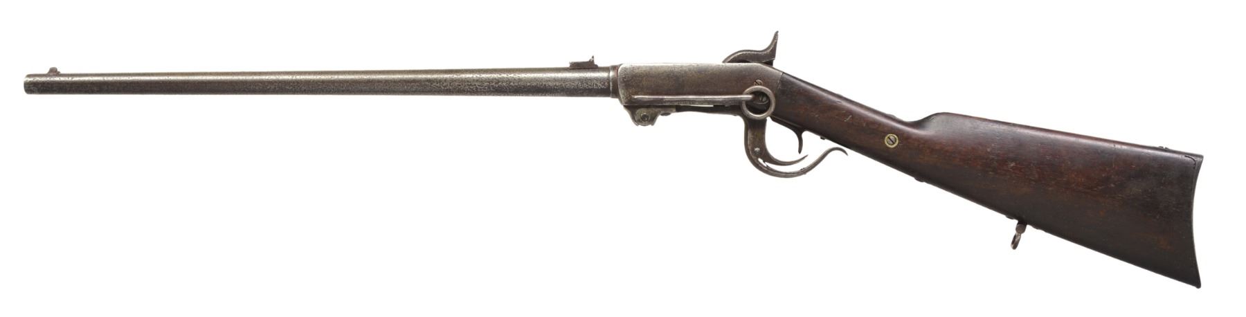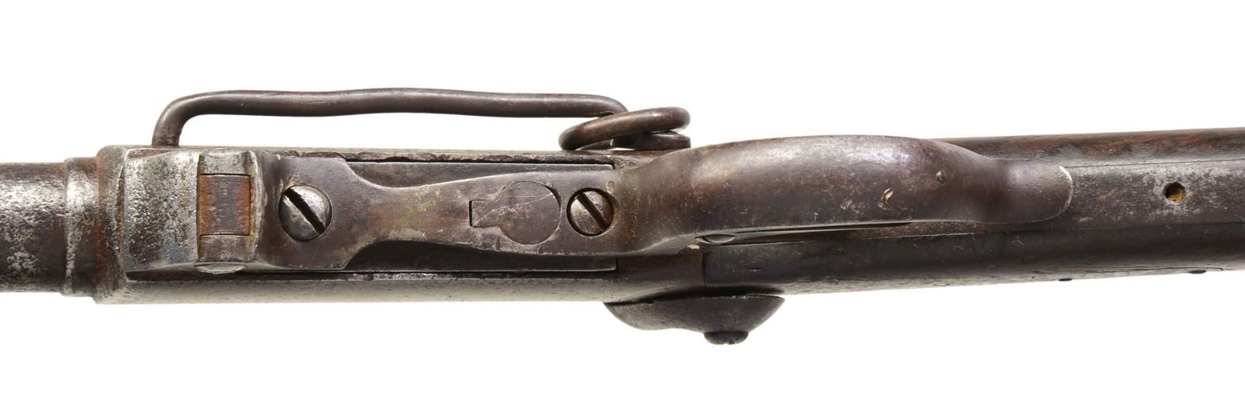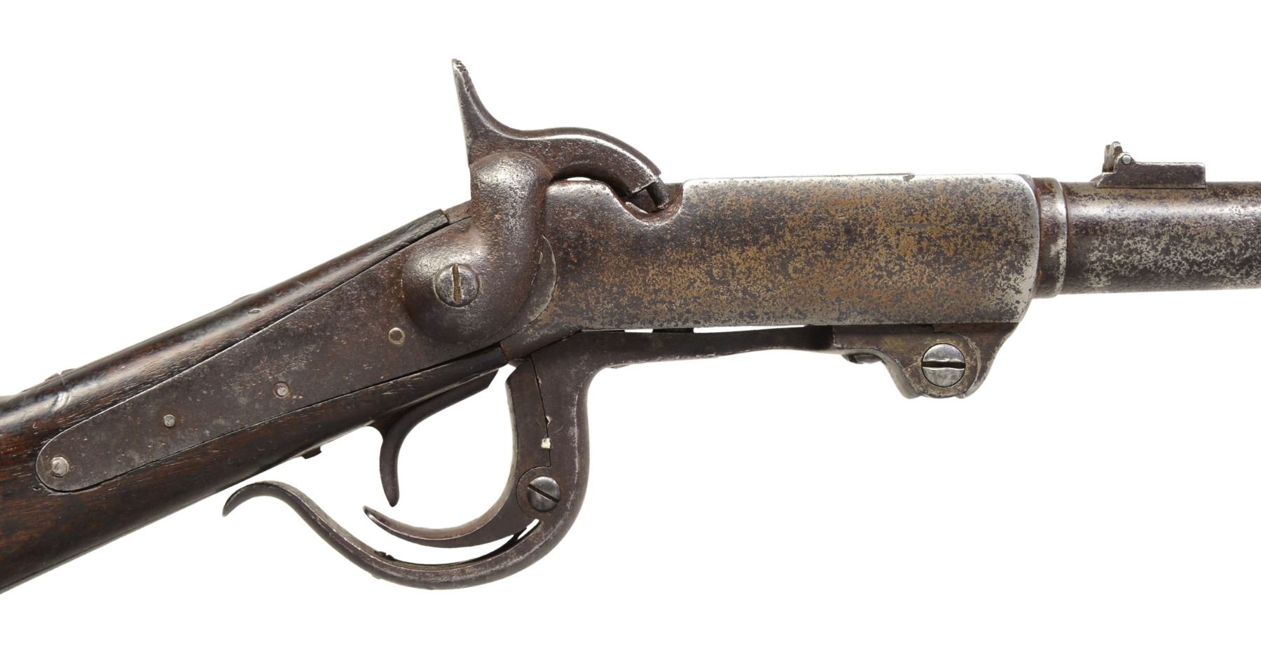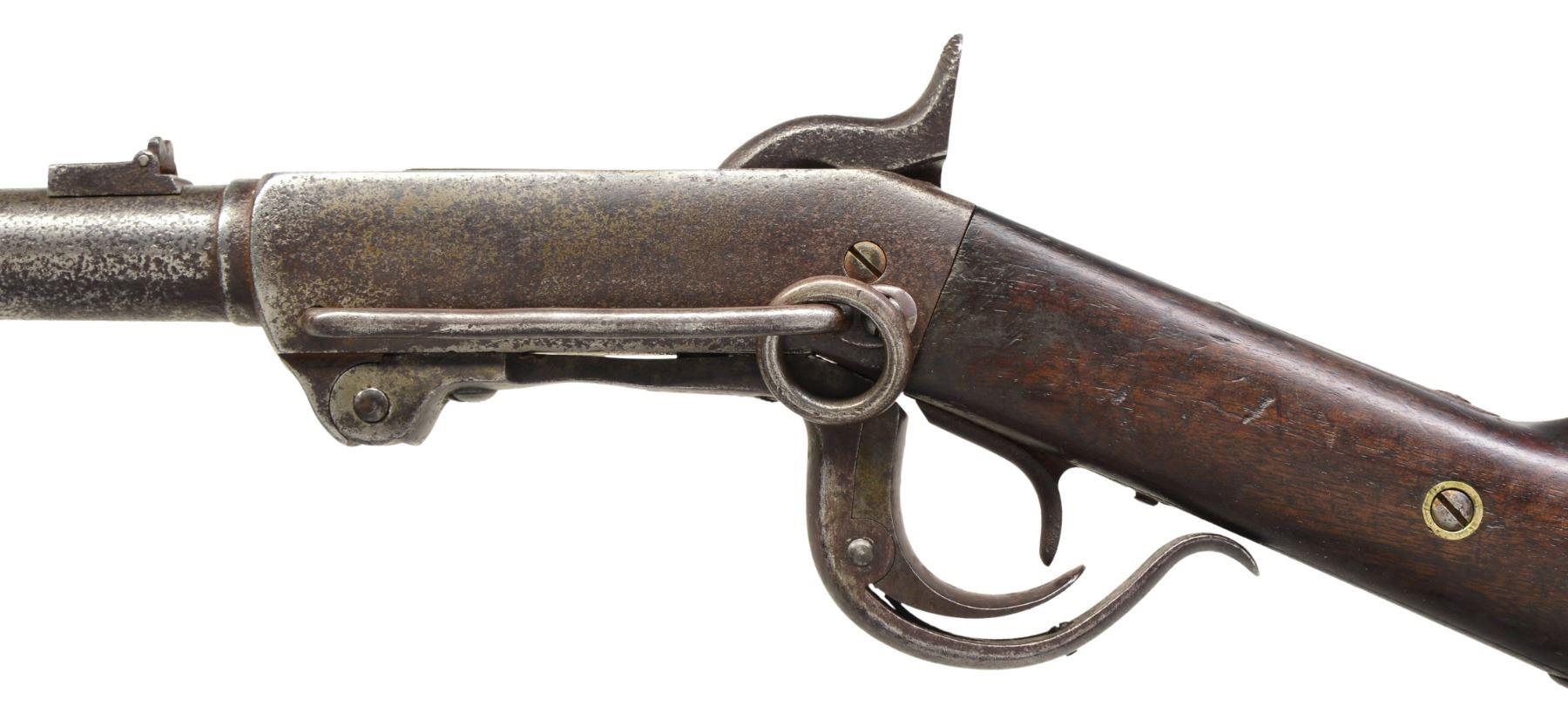 BREECHLOADING CARBINE. Cal. 50. S# 1681 / 2398. About 2,000 of these Burnsides made w/out forestock were produced 1861-1862. Generally they saw action in the 1st NJ Cavalry, 1st Maine Cav., 1st PA Cav. & 1st US Cav. This gun has seen hard service, but has survived in original complete condition. CONDITION: good overall. Metal is dark, cleaned & pitted though most markings are discernable. Patent markings on top of frame are only partially discernable. Bbl. & frame are S# "1681". Breech block is S# "2398". Stock is sound & solid w/ hand worn patina w/ no visible cartouche. Mechanics need attention, strong discernable rifling & pitted bore. PROVENANCE: Herbert "Bert" Murch Collection. (01-16380/JS). ANTIQUE. $2,000-2,500.