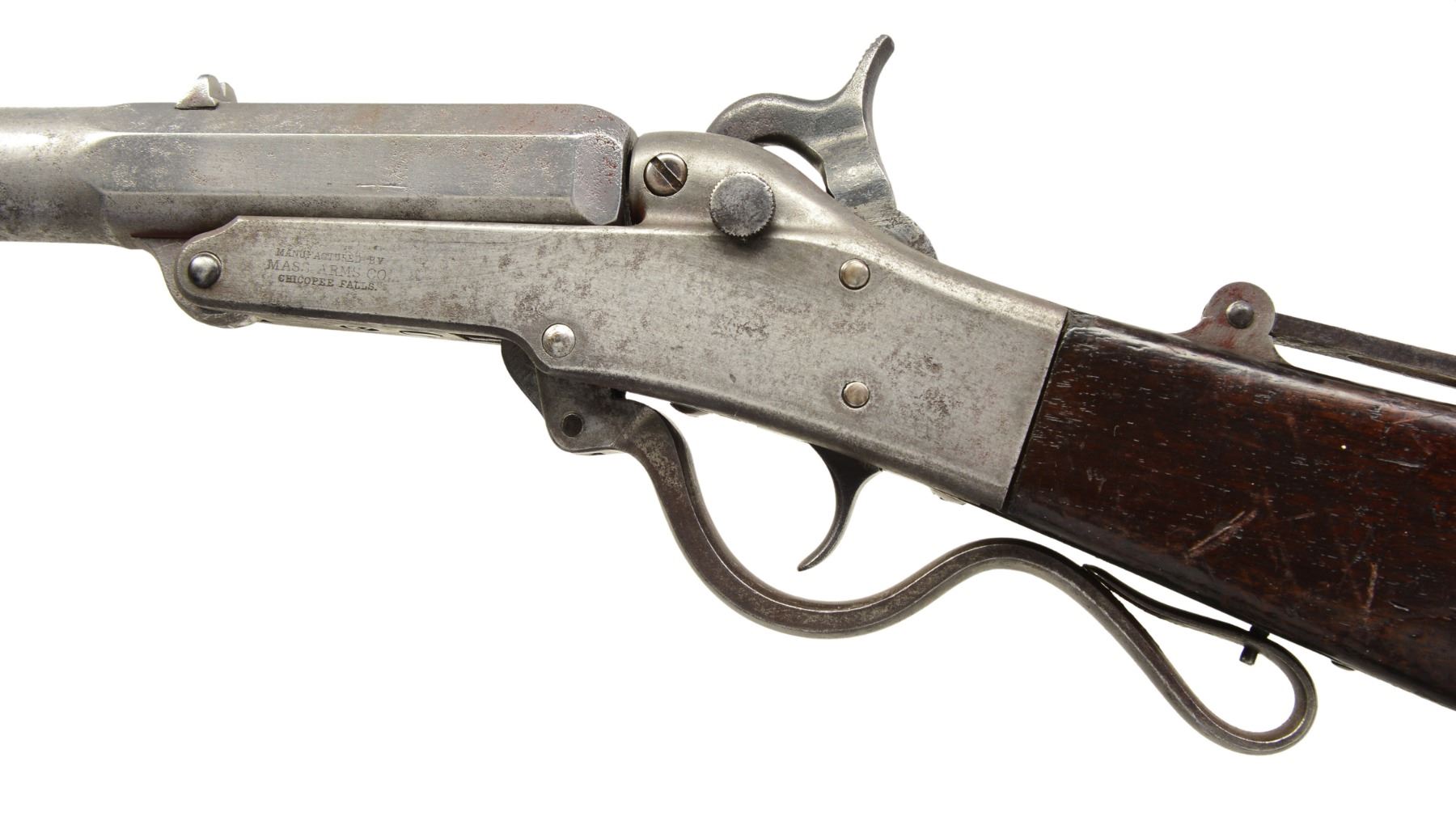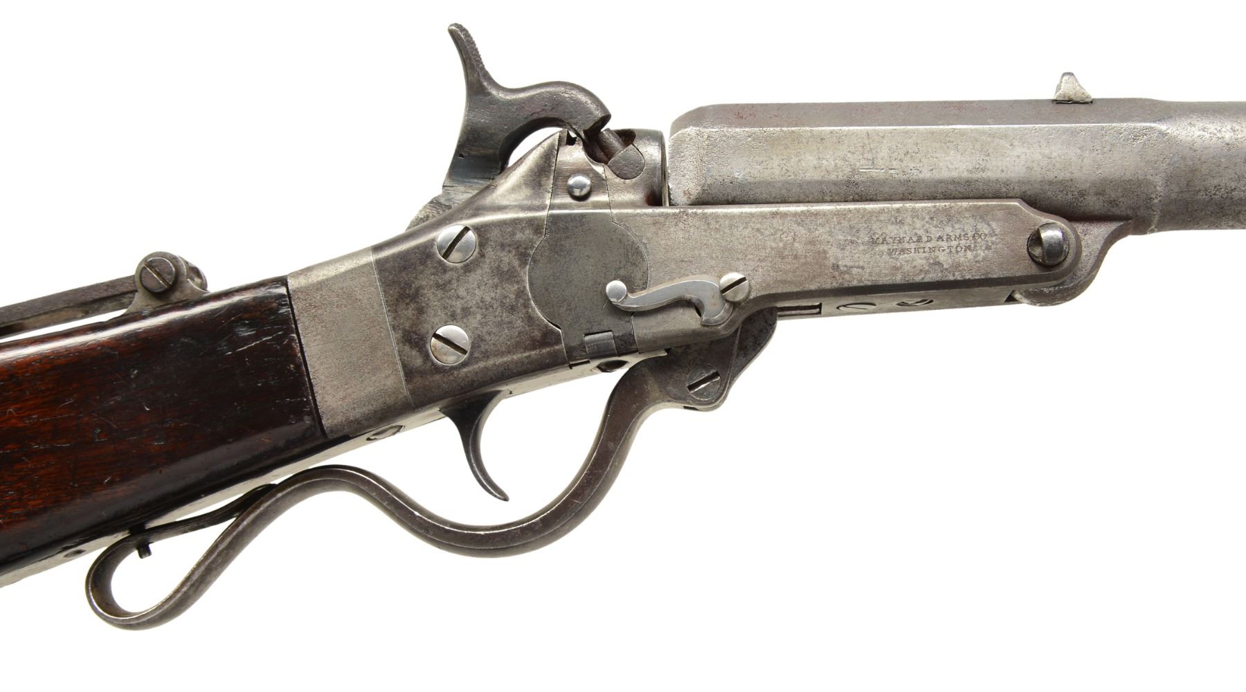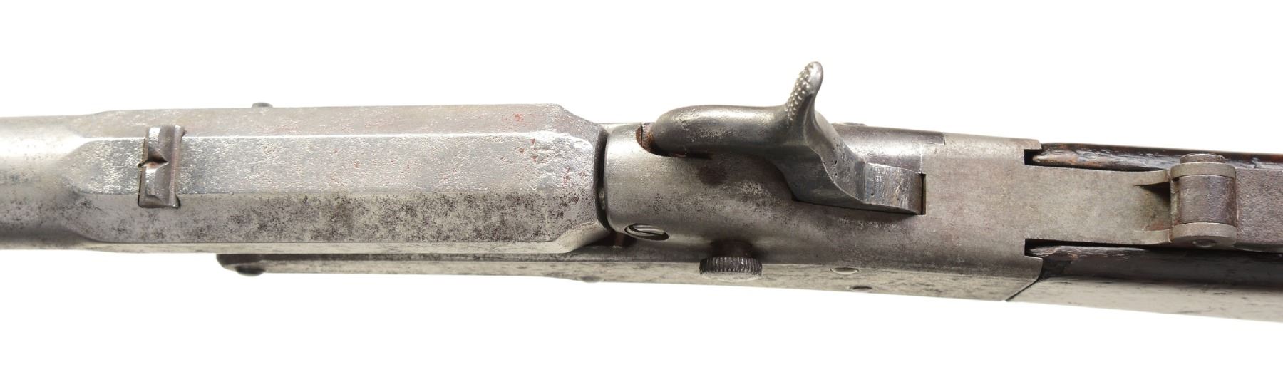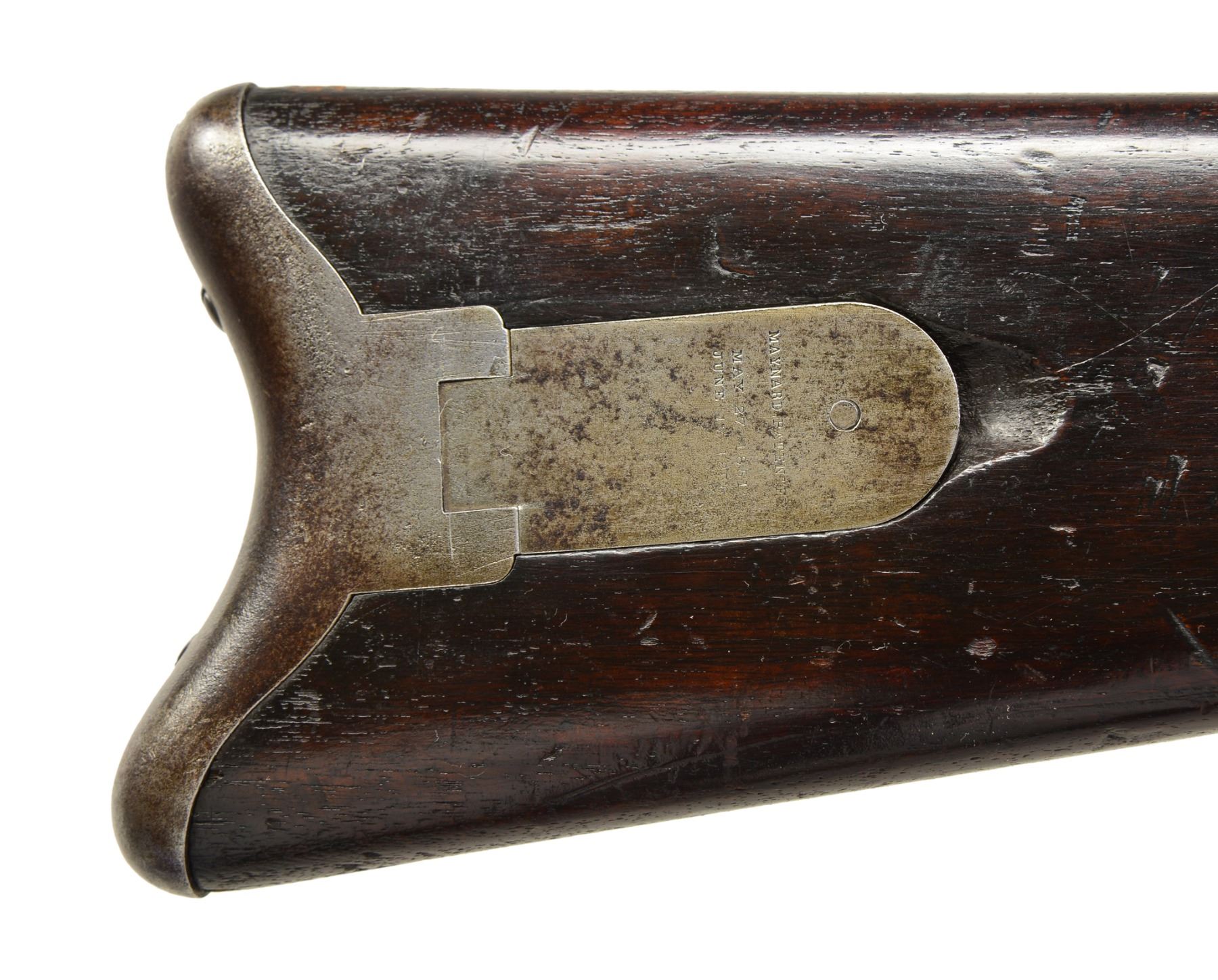 Cal. 35. S# 4085 / 704. This was a popular military arm more in the South than in the North, especially in 35 cal. Howard Madaus in his article "The Maynard Rifle & Carbine in the Confederate Service" (ASAC Bulletin 52, pages 66-79) state that "as many as 2000-2600 1st Model carbines were purchased by the states of Mississippi, Georgia & Florida". He also notes that archeological evidence shows that Maynards issued to Florida troops along the Applachicola River were using 35 cal. cartridges. This gun confirms to other 1st model carbines, iron mounted, tape primer system, patent information & manufacturer stamped on either side of frame, 20" 2 stage bbl. w/ fixed rear sight, front blade sight & adj. long rare rear sight. CONDITION: very good overall. Bbl. has been cleaned & is gray/bright w/ pitting. Frame is gray w/ good markings. Maynard tape door may be replaced as it's S# 704 is different than rest of gun. PROVENANCE: Herbert "Bert" Murch Collection. (01-16392/JS). ANTIQUE. $2,400-2,900.