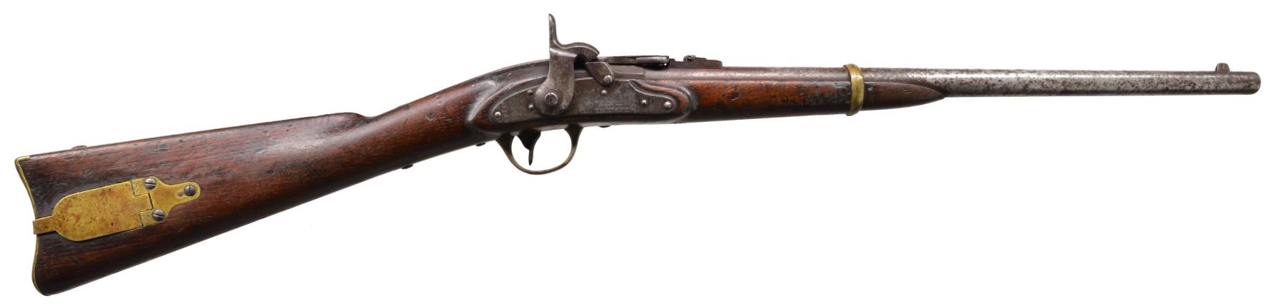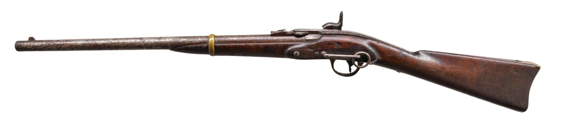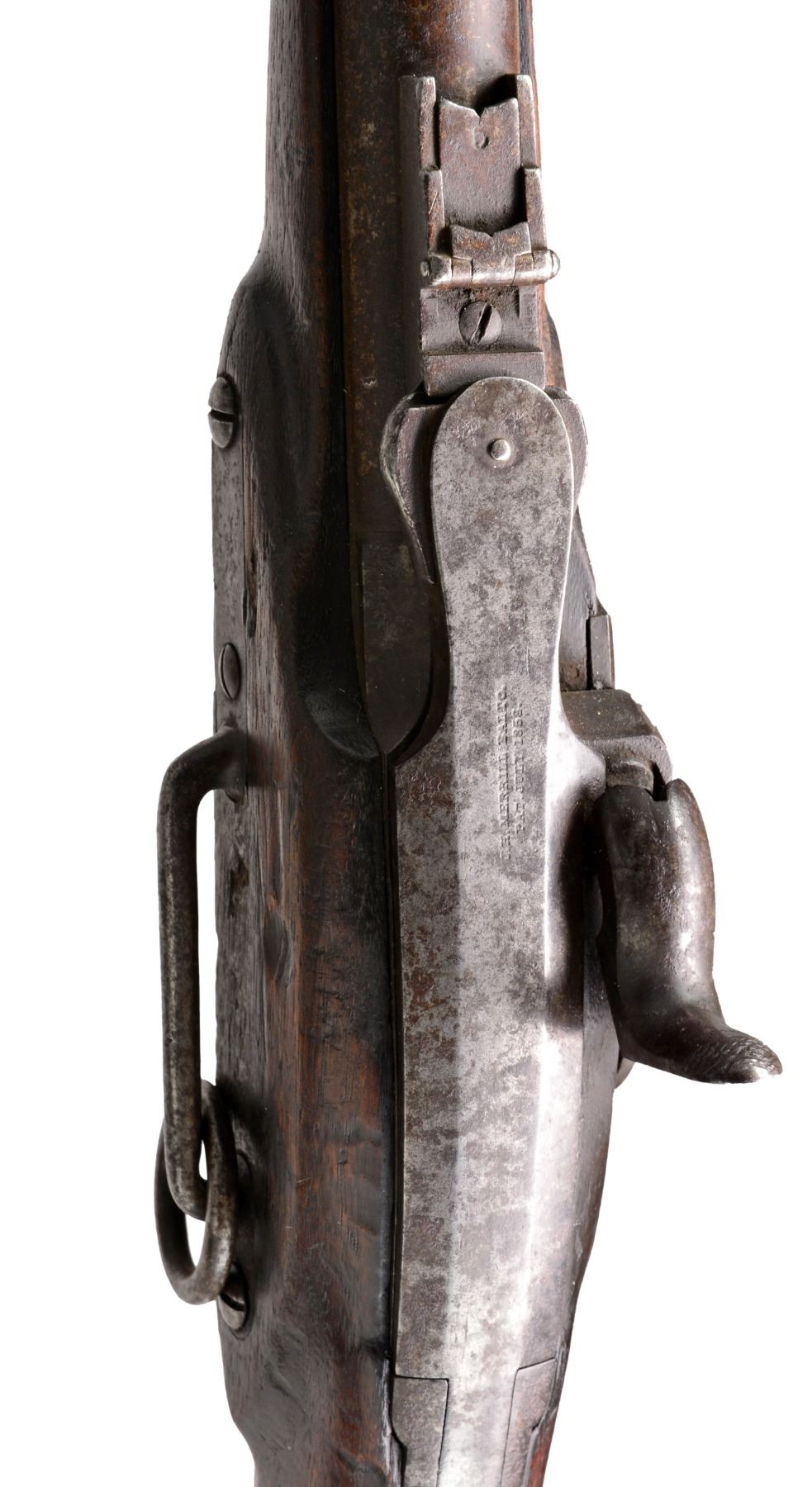 Cal. 54. S# 7382/7655. Merrill carbines came out early in the Civil War & were made famous by Grierson's Cavalry in the western theatre. John Wayne's role in "The Horse Soldiers" was based on Grierson, though John Wayne's men did not carry Merrills in the movie. Standard configuration w/ 22 1/8" bbl., brass mounted. Unique lever activated breech marked "J.H MERRILL BALTO. / PAT. JULY 1858". Breech has S# "7655". Lock is marked "J.H. MERRILL BALTO. / PAT. JULY 1858 / APL. 9 MAY 21-28-61". Lock is S# "7382". Even though S#s do not match, the gun appears to have been in this configuration since the war w/ matching fit, color & patina. CONDITION: good to very good overall, complete & original. Metal is overall mixed gray/brown patinas. Brass has dark mustard patinas. Stock is sound & solid w/ numerous cosmetic blemishes. 1 Cartouche can be discerned in outline. Mechanically functional w/ discernable rifling & dark bore. (01-17088/JS). ANTIQUE. $1,500-2,000.