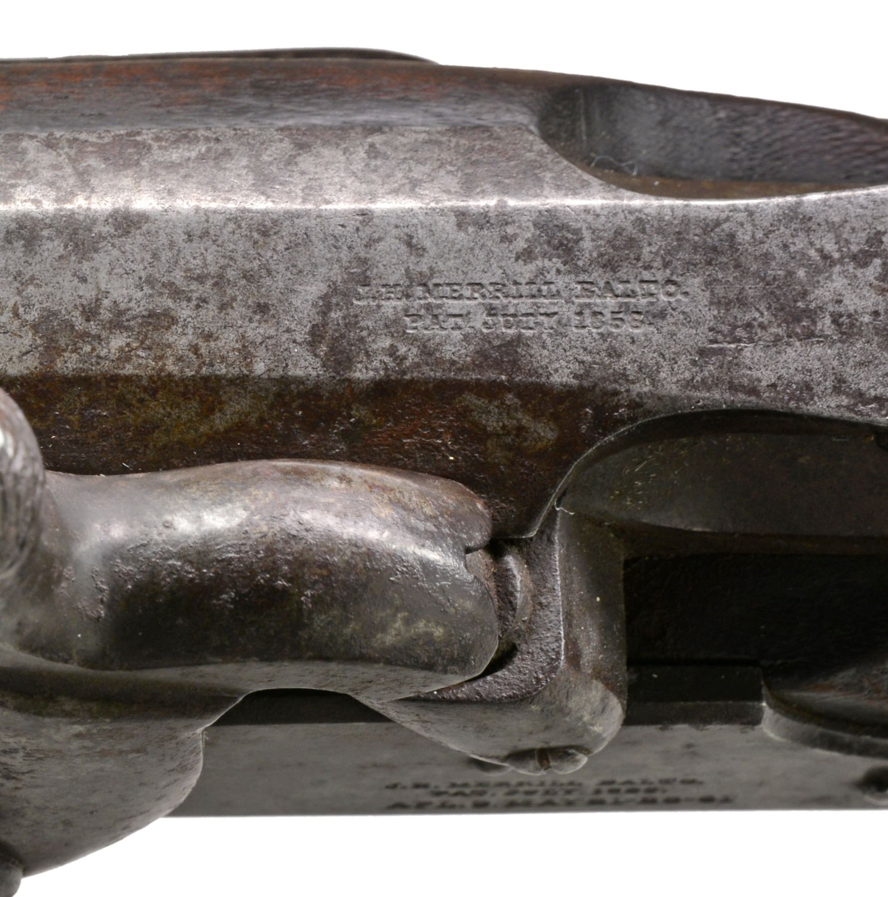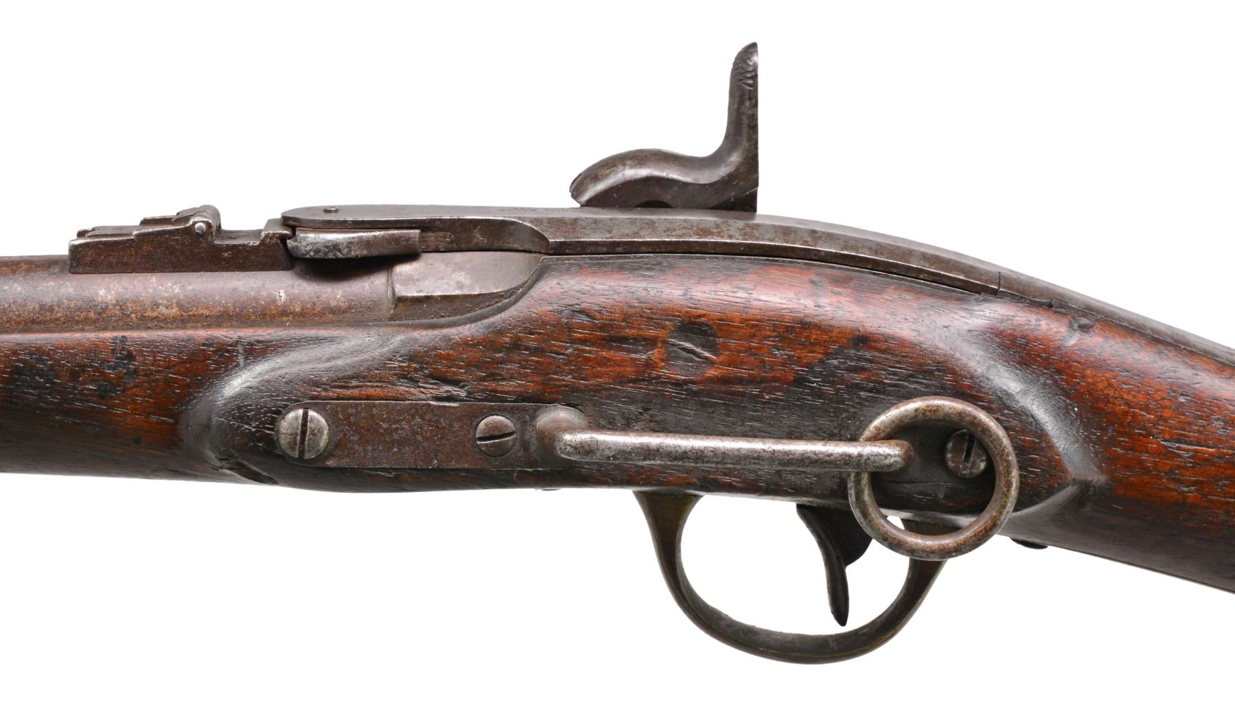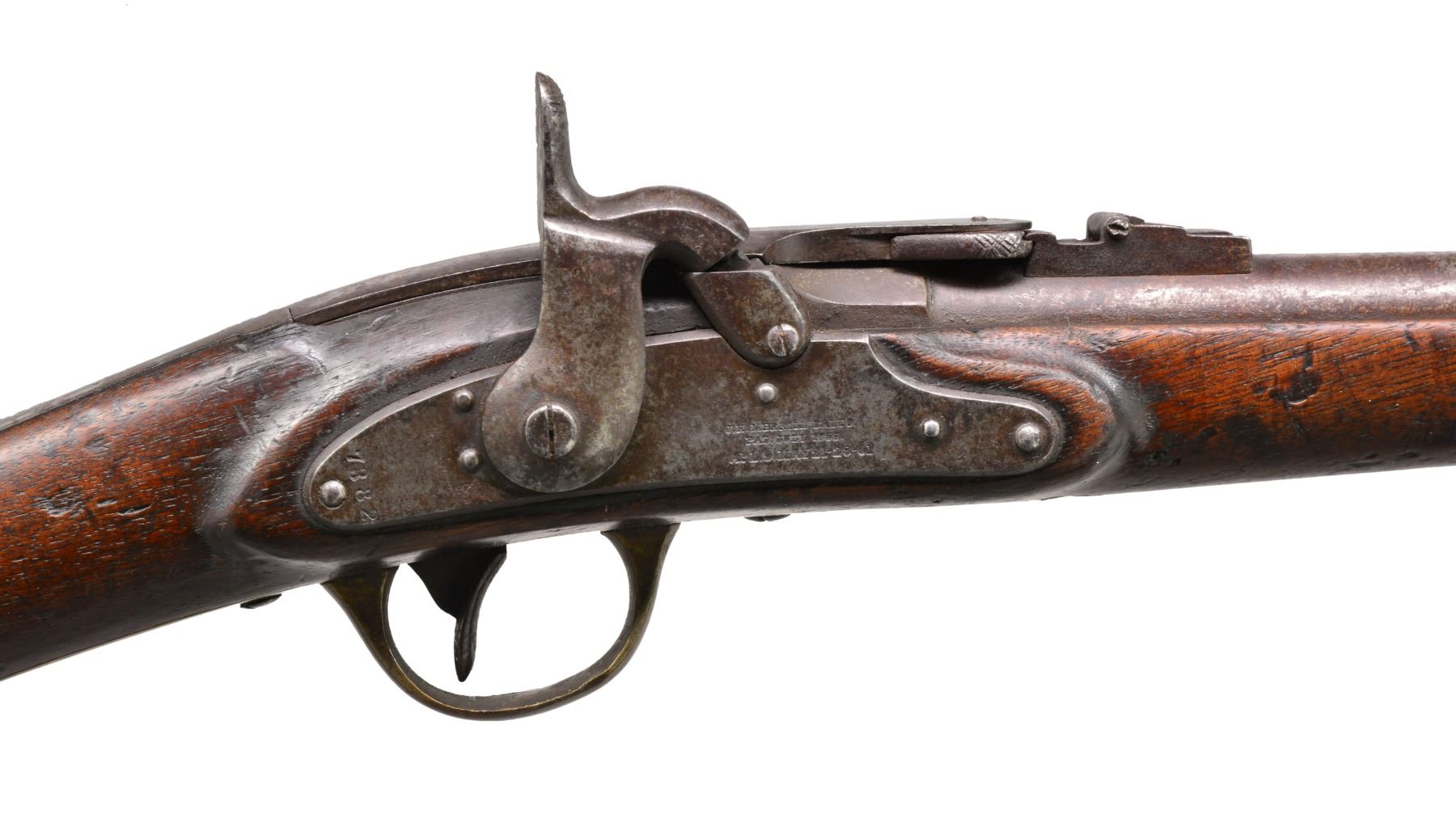 Cal. 54. S# 7382/7655. Merrill carbines came out early in the Civil War & were made famous by Grierson's Cavalry in the western theatre. John Wayne's role in "The Horse Soldiers" was based on Grierson, though John Wayne's men did not carry Merrills in the movie. Standard configuration w/ 22 1/8" bbl., brass mounted. Unique lever activated breech marked "J.H MERRILL BALTO. / PAT. JULY 1858". Breech has S# "7655". Lock is marked "J.H. MERRILL BALTO. / PAT. JULY 1858 / APL. 9 MAY 21-28-61". Lock is S# "7382". Even though S#s do not match, the gun appears to have been in this configuration since the war w/ matching fit, color & patina. CONDITION: good to very good overall, complete & original. Metal is overall mixed gray/brown patinas. Brass has dark mustard patinas. Stock is sound & solid w/ numerous cosmetic blemishes. 1 Cartouche can be discerned in outline. Mechanically functional w/ discernable rifling & dark bore. (01-17088/JS). ANTIQUE. $1,500-2,000.