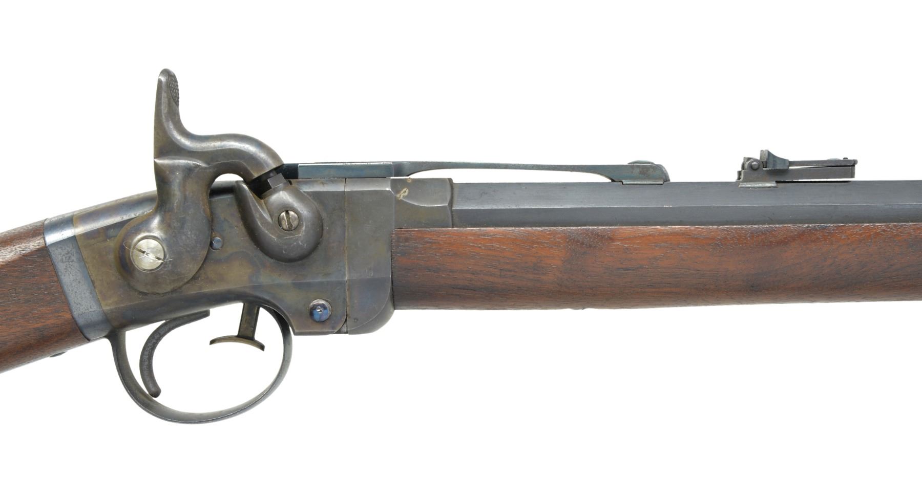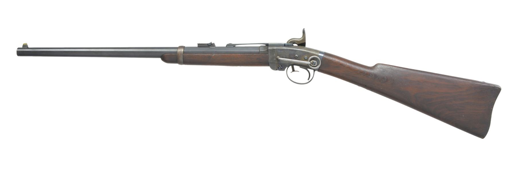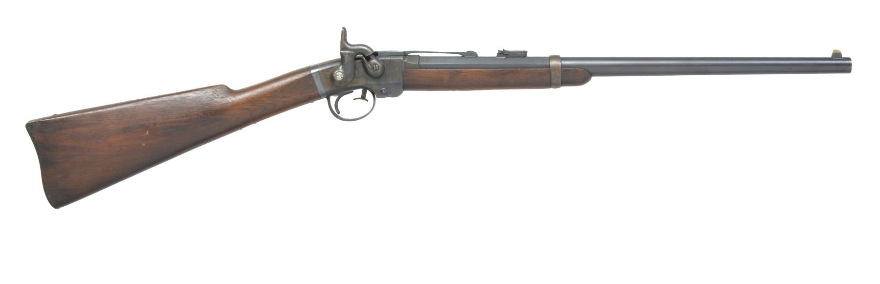 CARBINE. Cal. 50. S# 1292. Bbl. 21 1/2" oct. to rnd. German silver blade front sight w/ folding leaf carbine rear sight. Action is operated w/ release lever in front of trigger guard & tips down for loading. Case colored action w/ hammer mounted on right side having saddle ring & bar on left side. Left side of bbl. & right side of stock have "B" US inspection mark. Left ear of stock has "G.P" inspection mark. Band fastened walnut forearm & straight grip stock w/ steel carbine buttplate. Estimated quantity 30,000 mfg. 1861-1865. CONDITION: very fine. 90% Dull lightly faded blue showing spots of freckling & muzzle wear. Action retains 90% dark lightly faded case colors showing spots of freckling. Wood finish finish shows scattered scratches & marks. Bore is bright w/ strong rifling showing a few sm. spots of very light pitting. (01-17066/DS). ANTIQUE. $1,500-2,250.