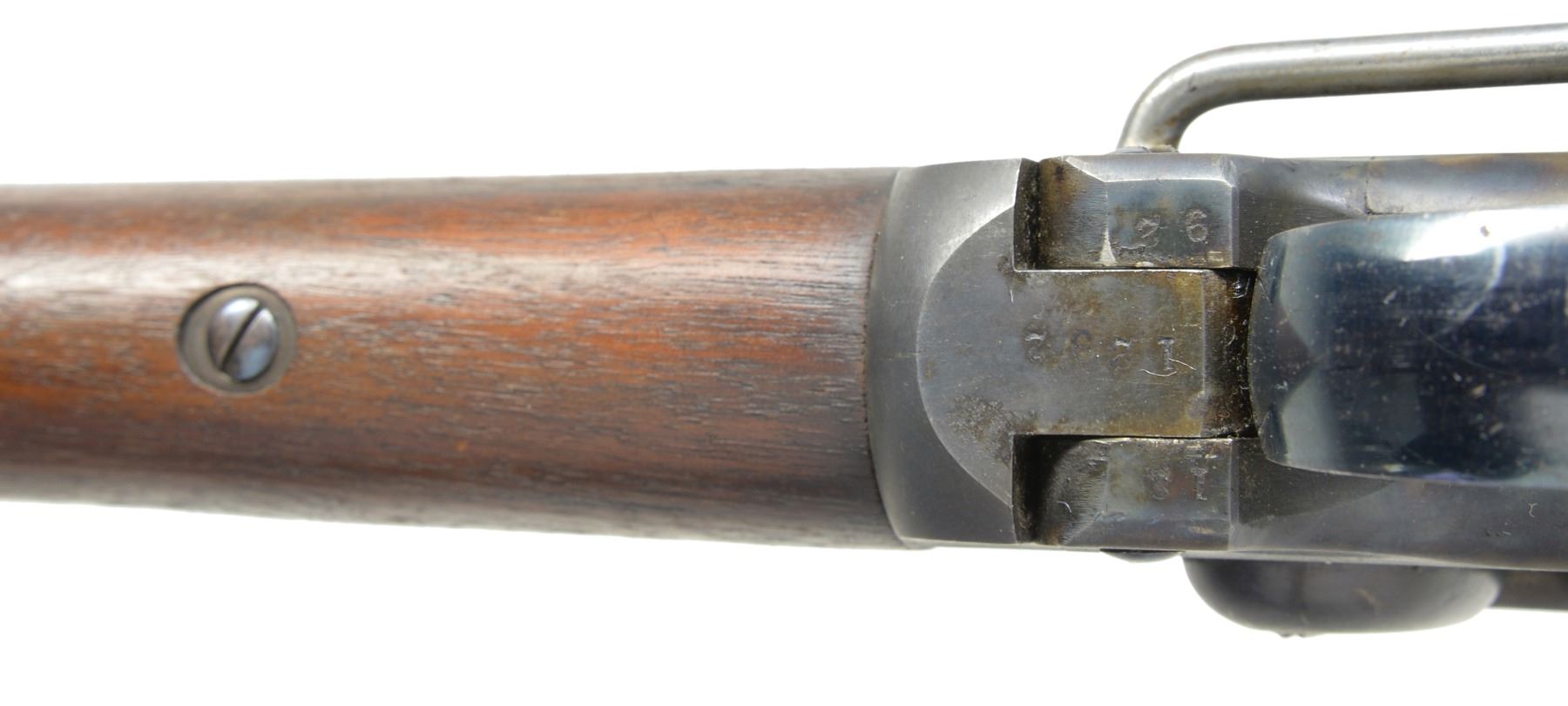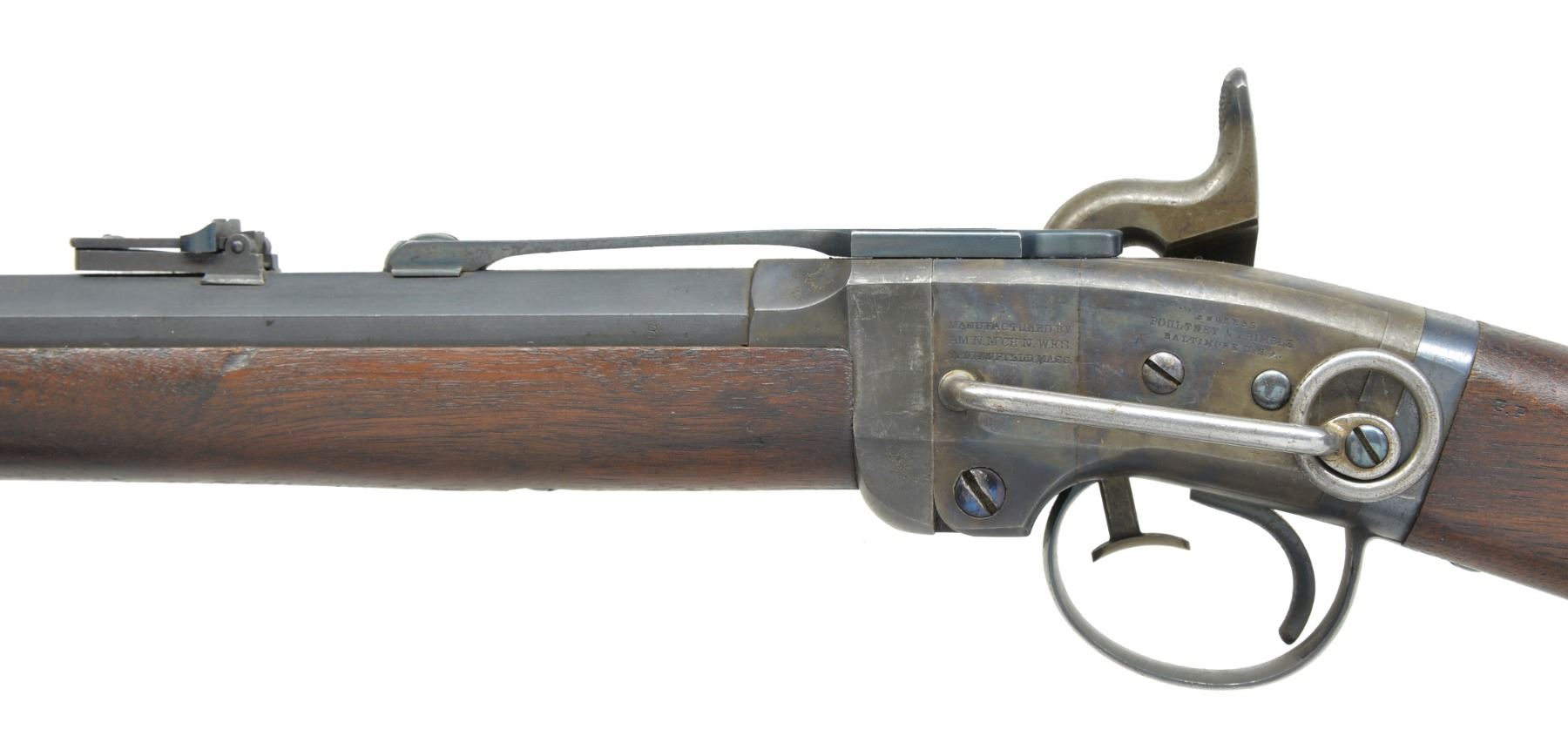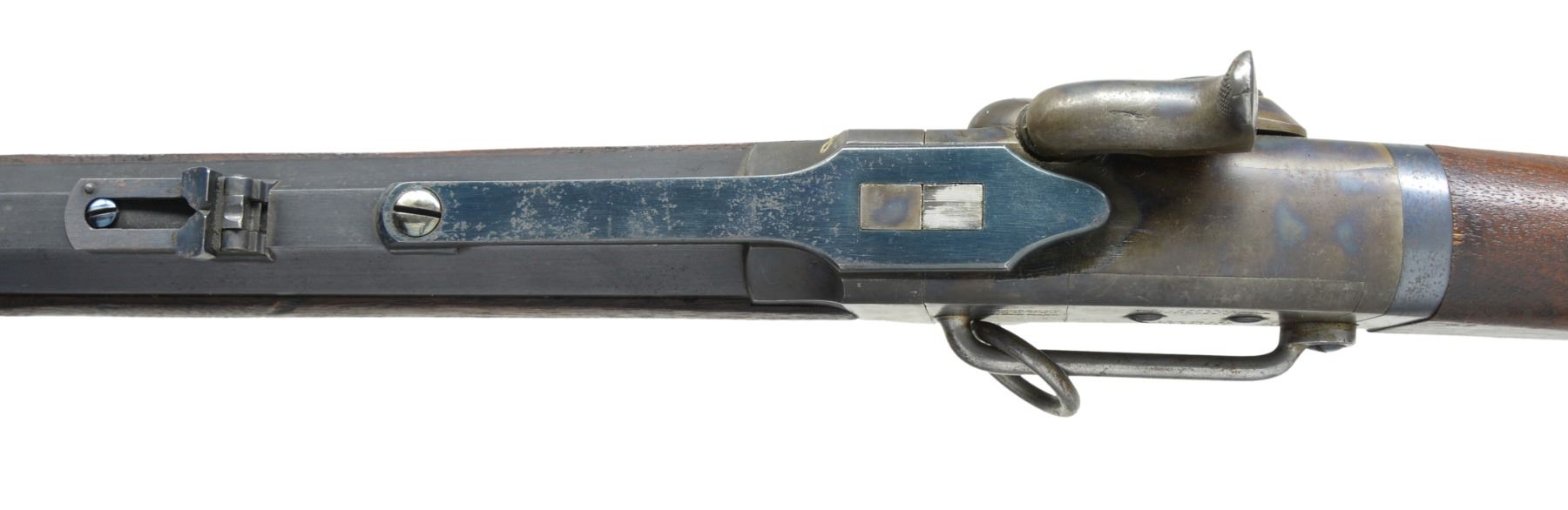 CARBINE. Cal. 50. S# 1292. Bbl. 21 1/2" oct. to rnd. German silver blade front sight w/ folding leaf carbine rear sight. Action is operated w/ release lever in front of trigger guard & tips down for loading. Case colored action w/ hammer mounted on right side having saddle ring & bar on left side. Left side of bbl. & right side of stock have "B" US inspection mark. Left ear of stock has "G.P" inspection mark. Band fastened walnut forearm & straight grip stock w/ steel carbine buttplate. Estimated quantity 30,000 mfg. 1861-1865. CONDITION: very fine. 90% Dull lightly faded blue showing spots of freckling & muzzle wear. Action retains 90% dark lightly faded case colors showing spots of freckling. Wood finish finish shows scattered scratches & marks. Bore is bright w/ strong rifling showing a few sm. spots of very light pitting. (01-17066/DS). ANTIQUE. $1,500-2,250.