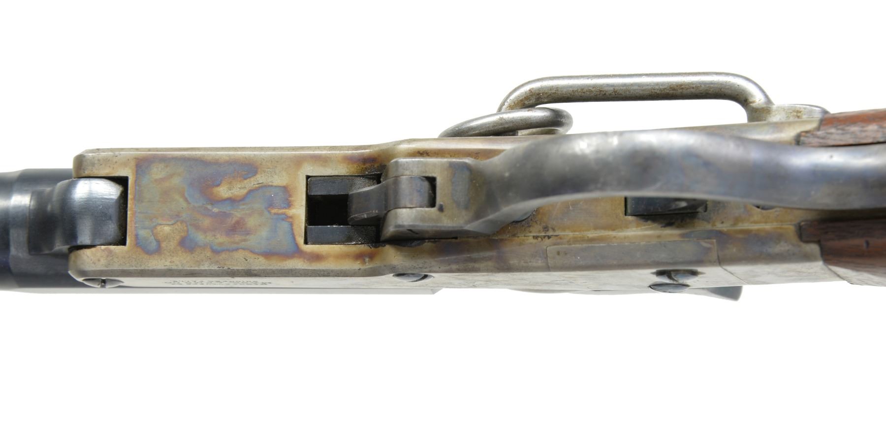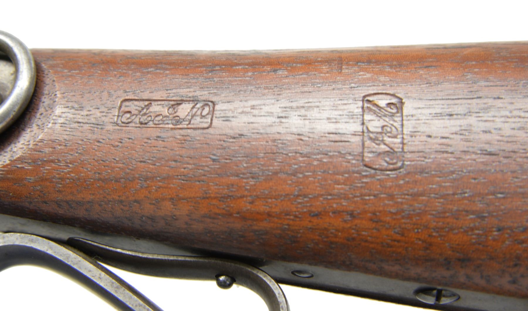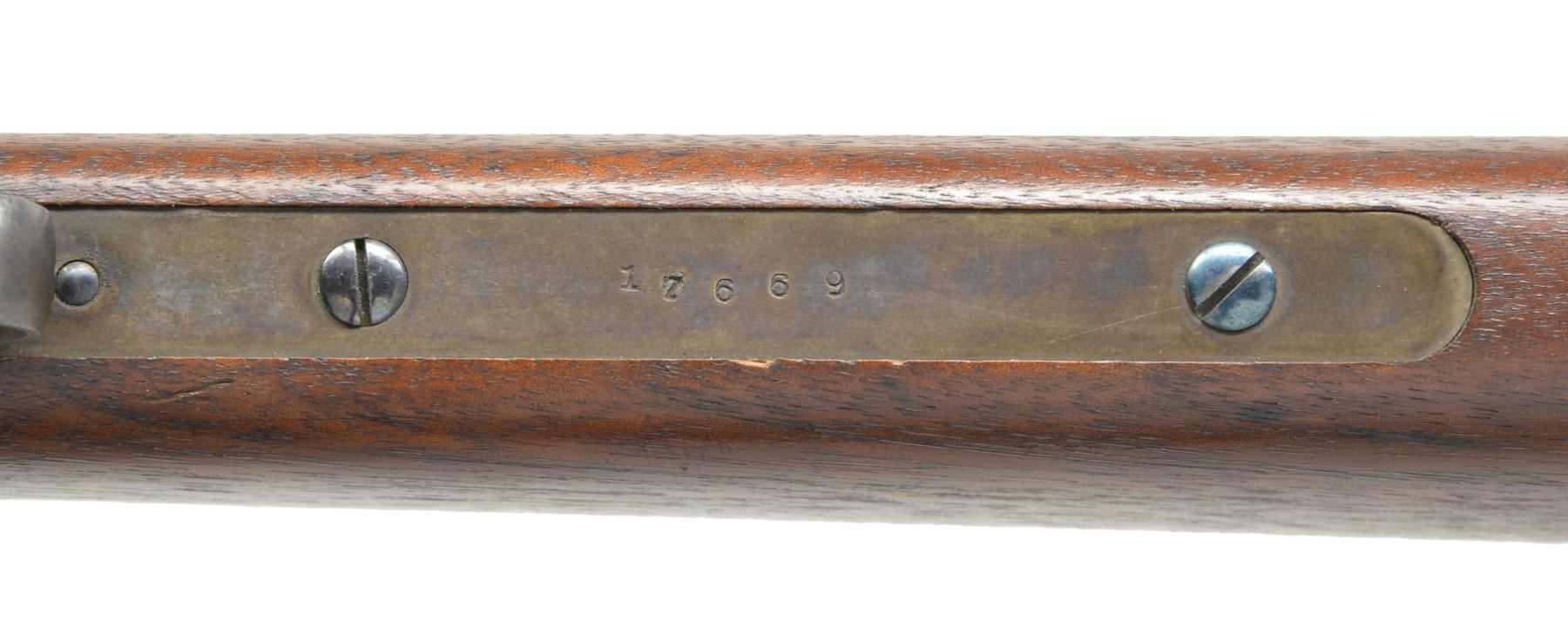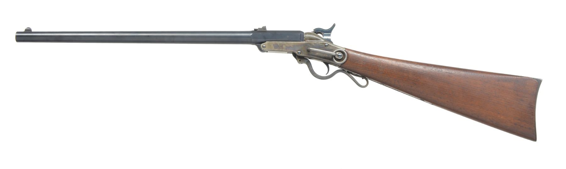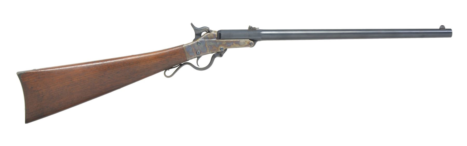 PERCUSSION CARBINE. Cal. 50. S# 17669. Bbl. 20" rnd. w/ oct. shank. Semi circular front sight w/ 2 leaf folding rear sight. Single shot action, lever operated bbl. tips down for loading. Case colored action w/ center mounted blued hammer & trigger. Left side has saddle ring & bar. Bbl. & saddle ring bar have "S" US inspection marks. Straight grip walnut stock w/ steel buttplate. Left side of stock has sharp cartouches. Total of 20,202 mfg. 1863-1865. CONDITION: near excellent. 98% Lightly faded bbl. blue showing spots of freckling. Action retains 80% case colors w/ spots of freckling. Stock has very good finish w/ crisp cartouches. Bore is clean & bright w/ near excellent rifling. (01-17068/DS). ANTIQUE. $1,750-2,500.