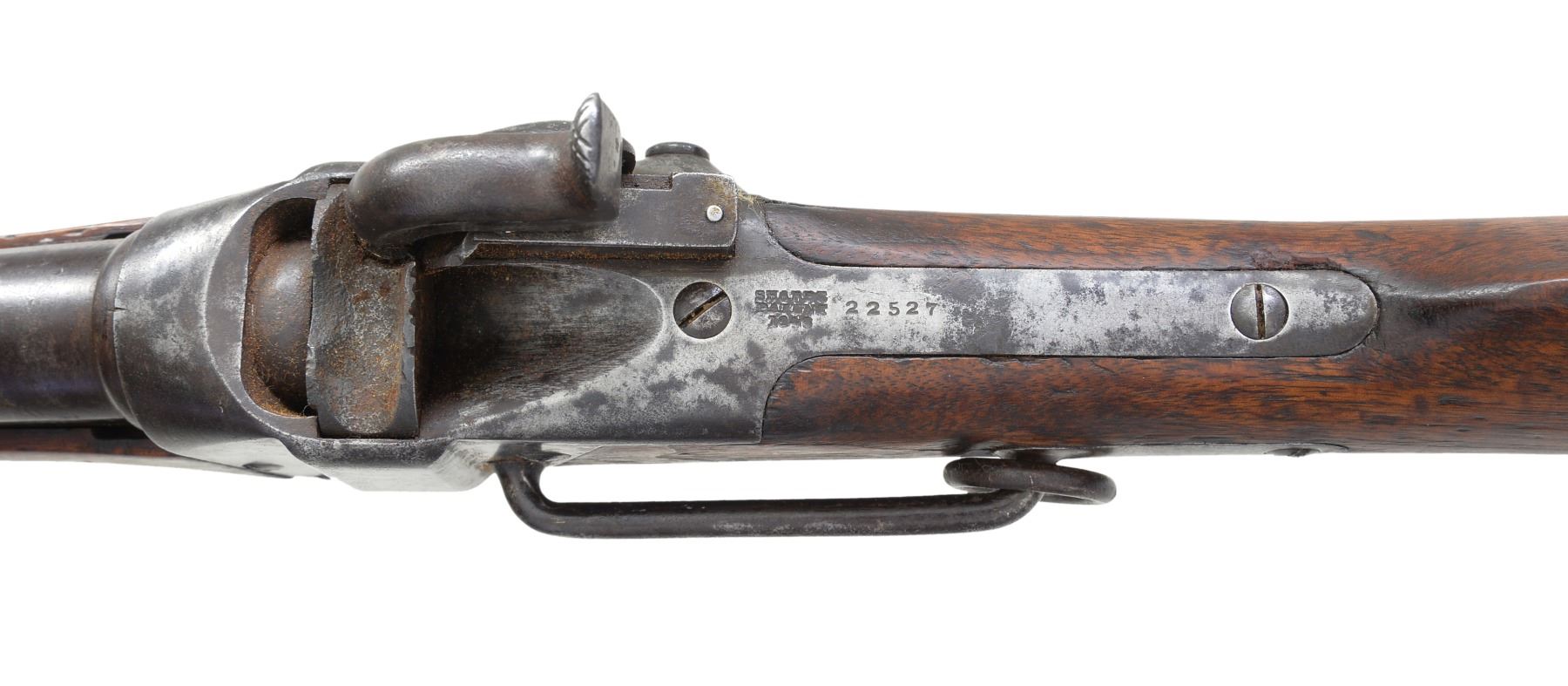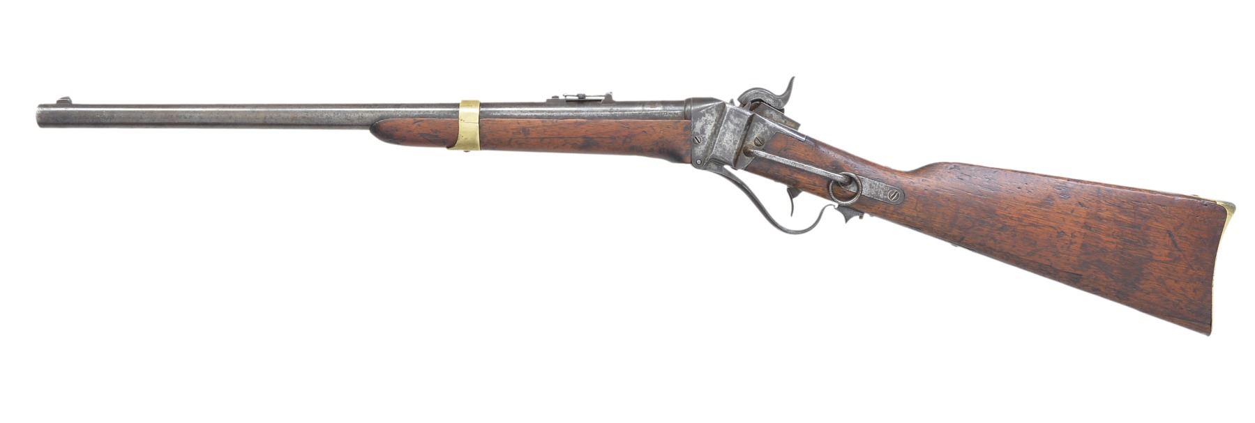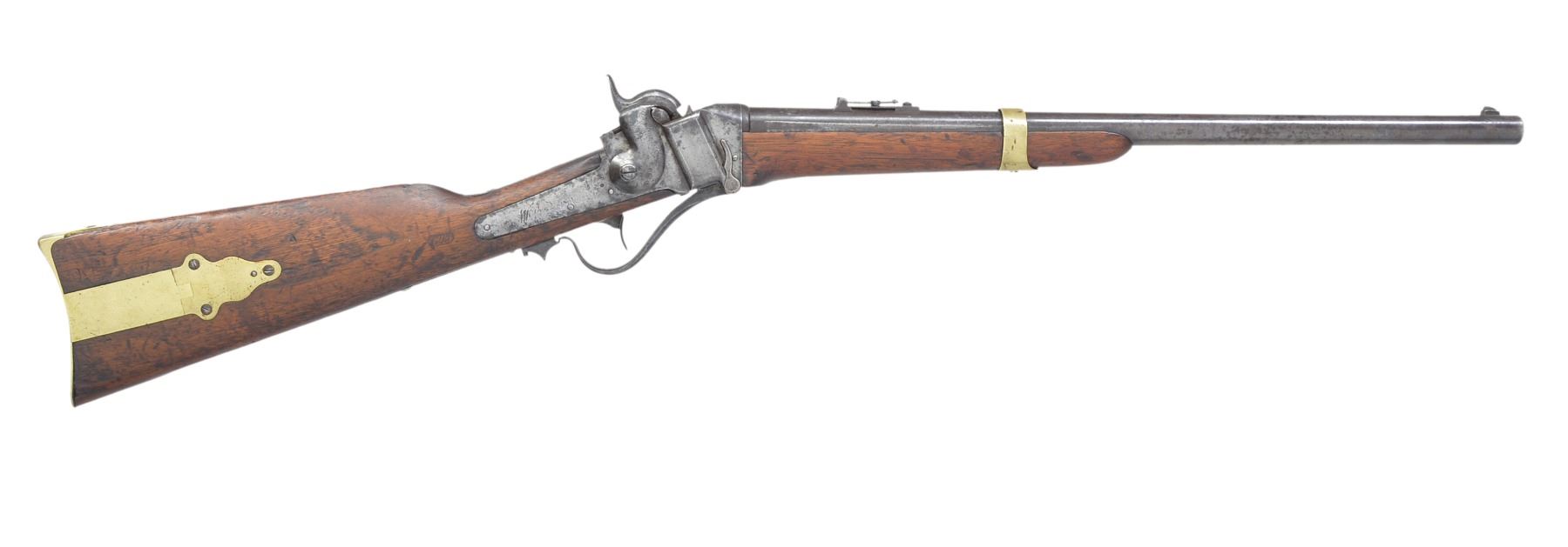 BREECH SRC WITH INSPECTOR’S CARTOUCHE. Cal 52. S# 22527. Standard brass mounted configuration of a very scarce US purchased carbine and among the highest serial numbers noted. Many earlier examples were bought by state militias and John Brown infamously purchased these “Beecher Bibles” for his 1959 raid on Harper’s Ferry. This example has the “updated” configuration requested by Ordnance Department late in 1858 with many model 1859 features. These include 21.5” round barrel with 3-line address forward of rear sight which is marked only “R S LAWRENCE” in tiny letters. This spring loaded ladder sight (unlike the normally seen rear folding model 1852 or the improved 3-line patent Lawrence sight), iron musket style front sight like on model 1859 (instead of earlier brass blades), 3” sling rod like on model 1859 extending back (instead of 9” which extended forward to rear band), Inspector cartouche on both sides of stock, and “T” sub inspector on left barrel breech. The lock is not marked, but standard 3-line patent on breech tang. CONDITION: good overall, all original and matching, honest well used example showing heavy saddle wear with discernible markings including discernible “WAT” (William A. Thornton) cartouche on right side of stock rear of lock stamped upside down and a 2nd cartouche on left side of stock just rear of saddle ring bar which can only be seen in outline. Iron overall is mottled gray patina, bright original blue on bottom of barrel protected by forestock with good markings, brass cleaned with light mustard patina, stocks sound and complete, forestock has glued repair, band spring removed and wood inset in mortise, screw retained band, 2.5” inset at bottom toe of buttstock. Mechanics are fine with good discernible rifling. (01-17372/JS). ANTIQUE. $2,500-3,500.