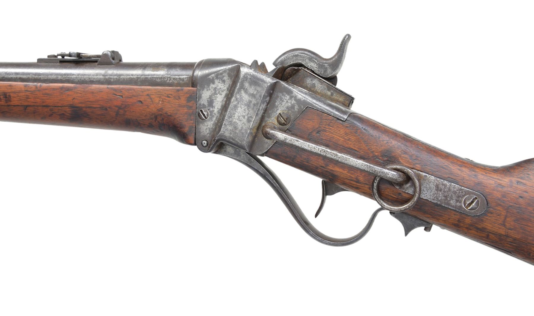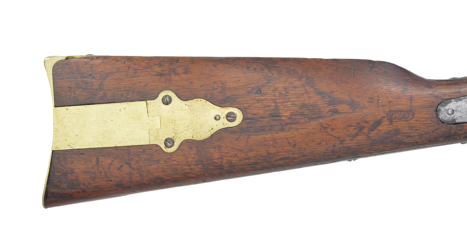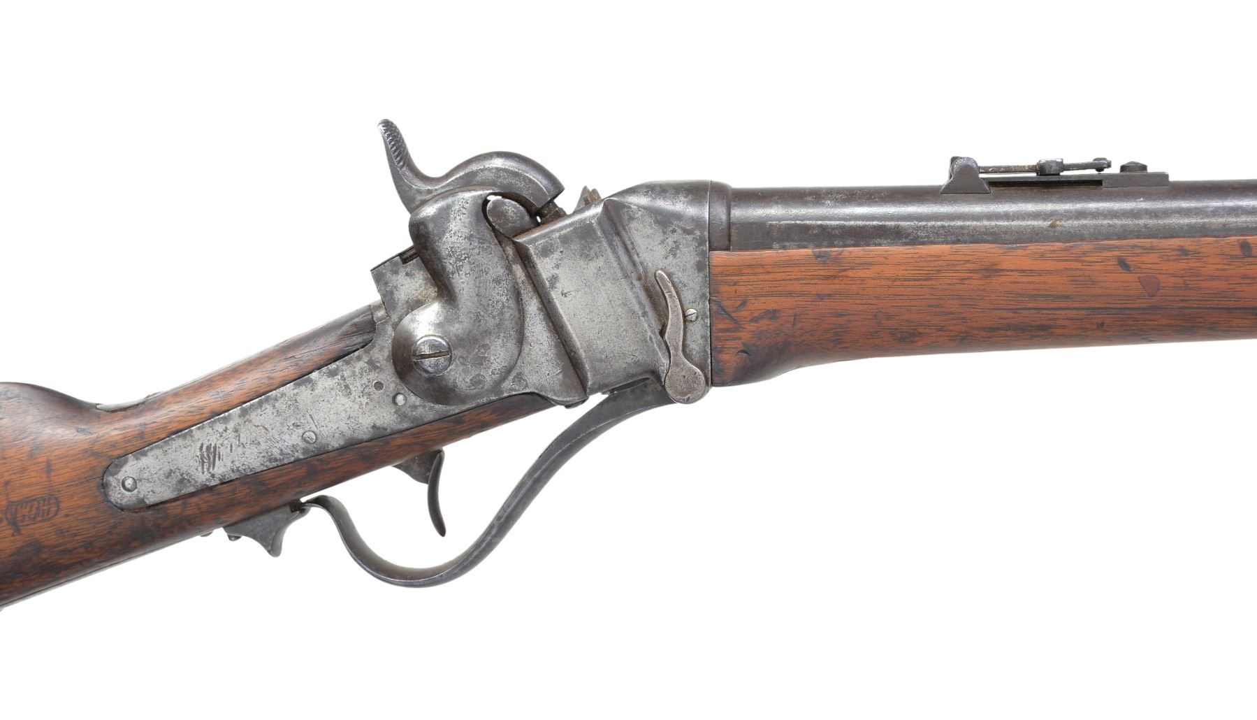 BREECH SRC WITH INSPECTOR’S CARTOUCHE. Cal 52. S# 22527. Standard brass mounted configuration of a very scarce US purchased carbine and among the highest serial numbers noted. Many earlier examples were bought by state militias and John Brown infamously purchased these “Beecher Bibles” for his 1959 raid on Harper’s Ferry. This example has the “updated” configuration requested by Ordnance Department late in 1858 with many model 1859 features. These include 21.5” round barrel with 3-line address forward of rear sight which is marked only “R S LAWRENCE” in tiny letters. This spring loaded ladder sight (unlike the normally seen rear folding model 1852 or the improved 3-line patent Lawrence sight), iron musket style front sight like on model 1859 (instead of earlier brass blades), 3” sling rod like on model 1859 extending back (instead of 9” which extended forward to rear band), Inspector cartouche on both sides of stock, and “T” sub inspector on left barrel breech. The lock is not marked, but standard 3-line patent on breech tang. CONDITION: good overall, all original and matching, honest well used example showing heavy saddle wear with discernible markings including discernible “WAT” (William A. Thornton) cartouche on right side of stock rear of lock stamped upside down and a 2nd cartouche on left side of stock just rear of saddle ring bar which can only be seen in outline. Iron overall is mottled gray patina, bright original blue on bottom of barrel protected by forestock with good markings, brass cleaned with light mustard patina, stocks sound and complete, forestock has glued repair, band spring removed and wood inset in mortise, screw retained band, 2.5” inset at bottom toe of buttstock. Mechanics are fine with good discernible rifling. (01-17372/JS). ANTIQUE. $2,500-3,500.
