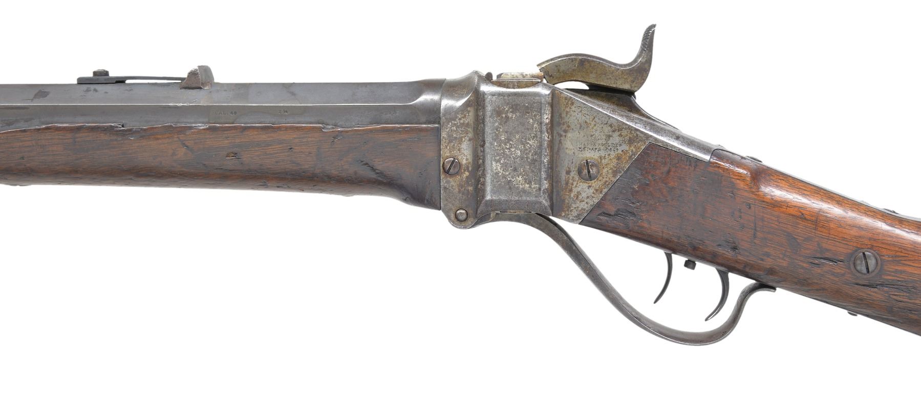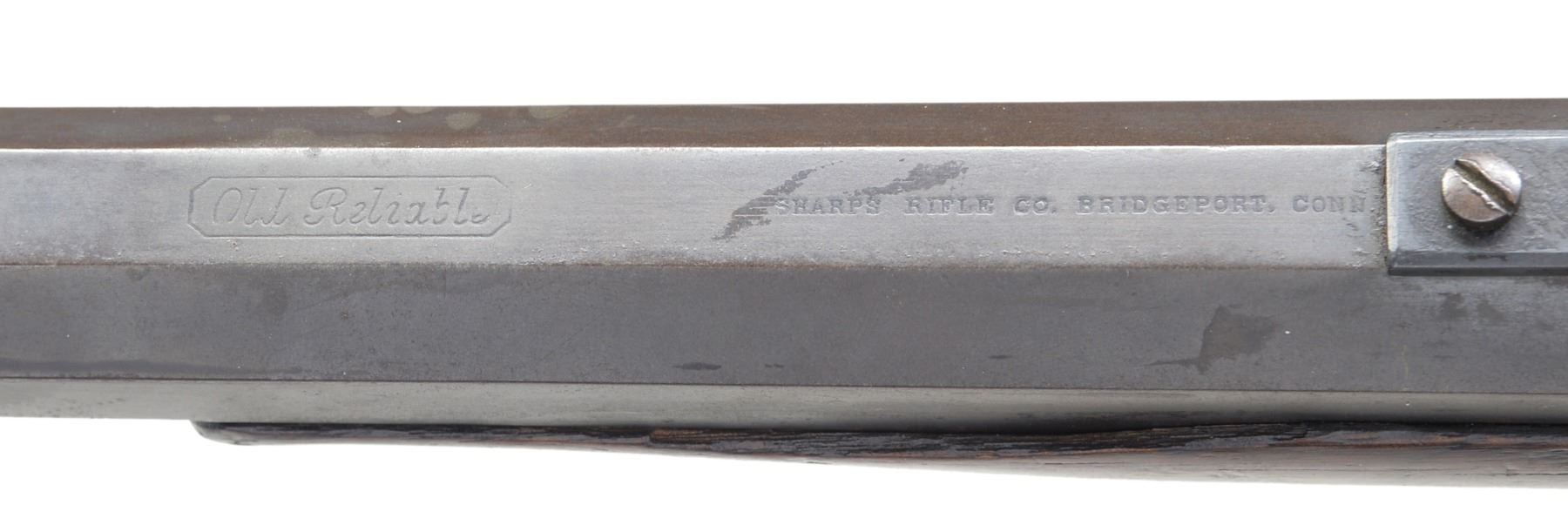 Cal. 40-90 Sharps Necked. S# 155251. Bbl. 30” medium weight oct. marked “Old Reliable” & “SHARPS RIFLE CO. BRIDGEPORT. CONN." on top flat & “CAL. 40 2 5/8” (40 90 Bottle neck) on left flat. Bottom is stamped w/ S# which matches action in all respects. Rifle is sighted w/ single very fine notch rear & tall brass blade front. Casehardened action w/ right hand lock & w/ Bridgeport hammer is fitted w/ dbl. set triggers, one of the most popular extra cost items. Buttstock of plain American walnut has crescent steel buttplate. Forend is of a later schnabeled type. WEIGHT: 12 lbs. 6 oz. CONDITION: good, original “as found”. This rifle has certainly “been there” exhibiting hard usage in outdoor environment but still w/ traces of original blue on bbl. under what is mostly dark brown patina. Action & lock retain a considerable amount of their casehardening color, mostly found on lock where protected by hammer, on action & other areas where protected. Stocks do not appear to have ever been refinished but show considerable wear, most likely due to being ridden through sage brush, etc. Some marks are quite deep & it appears that right side of butt got too close to a campfire one night & is somewhat scorched. Two tacks are driven into toeline of butt near buttplate. Forend shows considerable wood loss at front bbl. channel, again w/ considerable deep marks w/ subsequent wear, mostly on right side. Although the exterior condition is a bit rough, bore was obviously well cared for & is quite shiny w/ strong rifling throughout w/ scattered light pitting at breech end. The 40-90 Necked Sharps was introduced in 1873 & “became one of the more popular cartridges. The hollow point express bullets made by Sharps were designed to accept a 22 rimfire blank which was supposed to provide explosive expansion & better "knock down". (Per CARTRIDGES OF THE WORLD). A great old Sharps rifle. (01-17445/MGM92). ANTIQUE. $5,500-8,500.