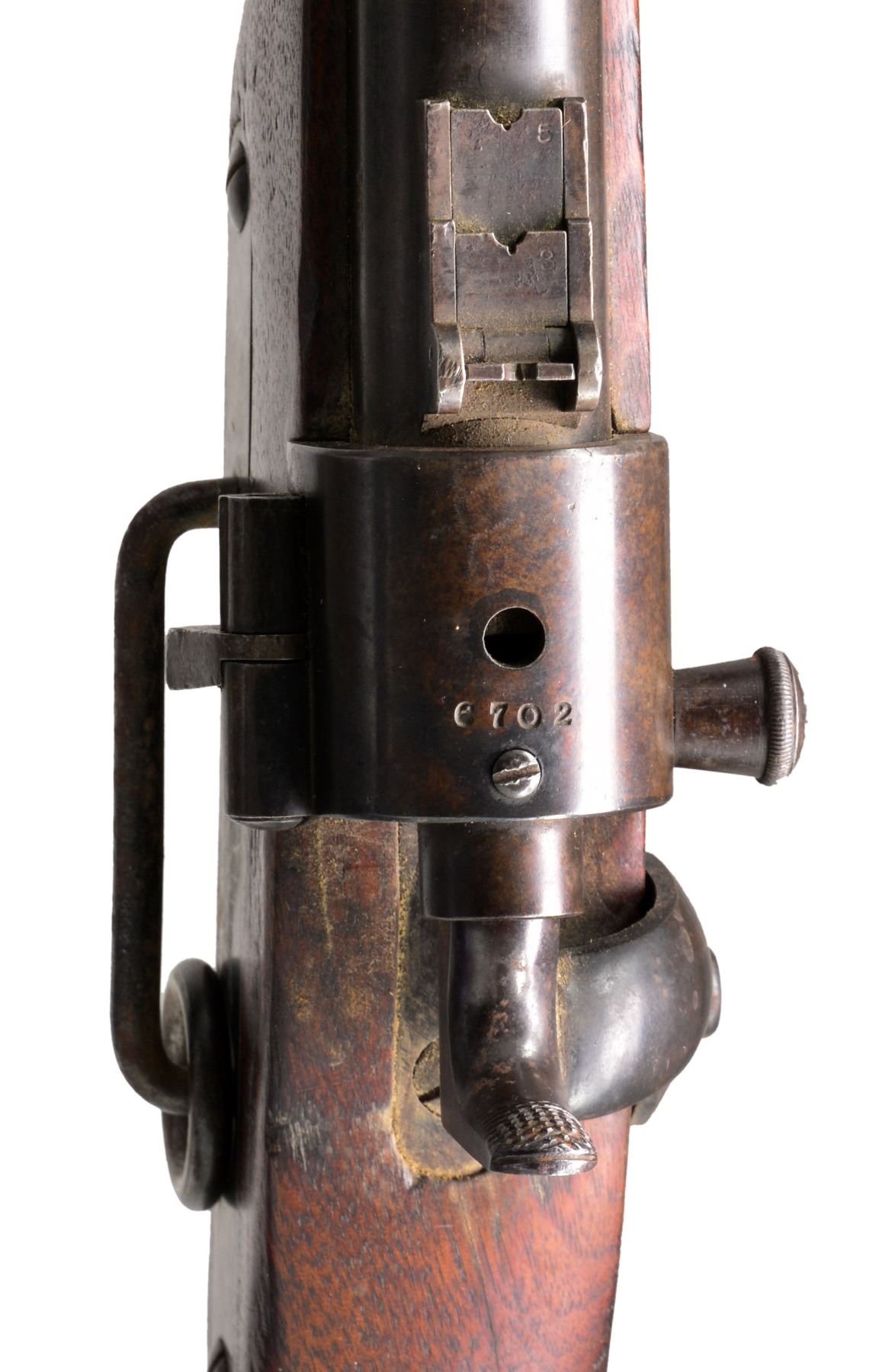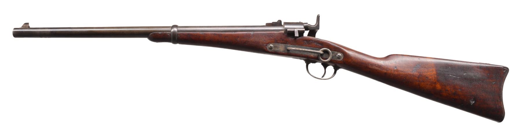 Cal. 56-50. S# 6702. Bbl. 22" rnd. Standard configuration. This is a well made carbine that shot Spencer ammunition & was introduced late in the war. This is an honest example. Spring loaded bolt breech mechanism. Lock marked in 3 lines "JOSLYN FIREARMS CO / STONINGTON CONN / 1864". Breech & bbl. tang both S# "6702". CONDITION: very good overall. Markings are sharp. Breech retains traces of finish. Lock, hammer & trigger guard retain strong traces of case colors. Stock is sound, refinished w/ cosmetic blemishes & no visible inspector's cartouches. Mechanics are crisp w/ crisp rifled bore. PROVENANCE: Estate Collection of Dan Poppen. (01-17315/JS). ANTIQUE. $700-900.