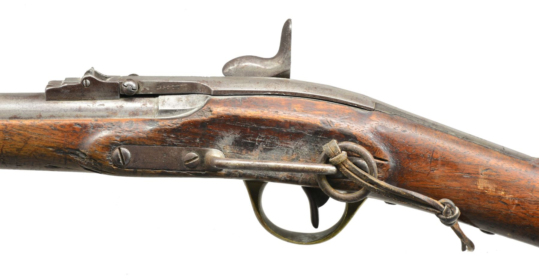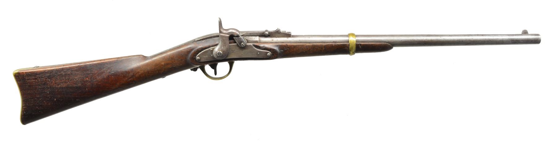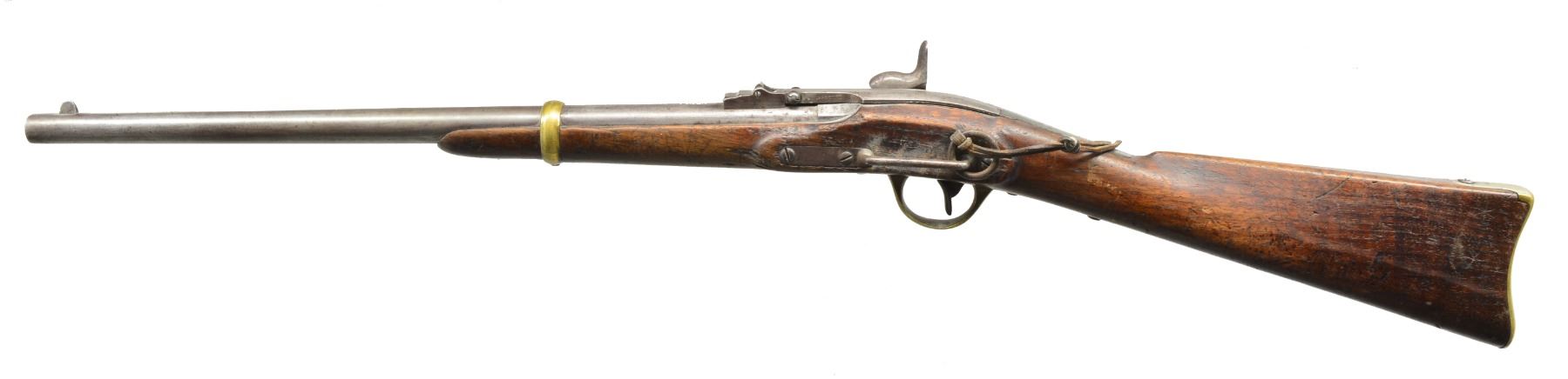 Cal. 54. S# 14203. Bbl. 22 1/8”. Merrill carbines came out early in the Civil War, 1st models w/ patchbox & later 2nd types w/out. Standard configuration w/ 22 1/8" bbl., brass mounted. Unique lever activated breech marked "J.H MERRILL BALTO. / PAT. JULY 1858". Breech has S# "14208". Lock is marked "J.H. MERRILL BALTO. / PAT. JULY 1858 / APL. 9 MAY 21-28-61" below sm. eagle & "1863” on tail w/ matching S#. This carbine shows honest saddle wear w/ good inspector’s cartouche. CONDITION: good to very good overall, complete & original. Metal is overall mottled gray patina. Brass has medium mustard patina. Stock is sound & solid w/ numerous sm. storage blemishes, cartouche is clear under saddle ring bar. Mechanically fine w/ pitted rifling in bore. (01-17664/JS). ANTIQUE. $800-1,200.