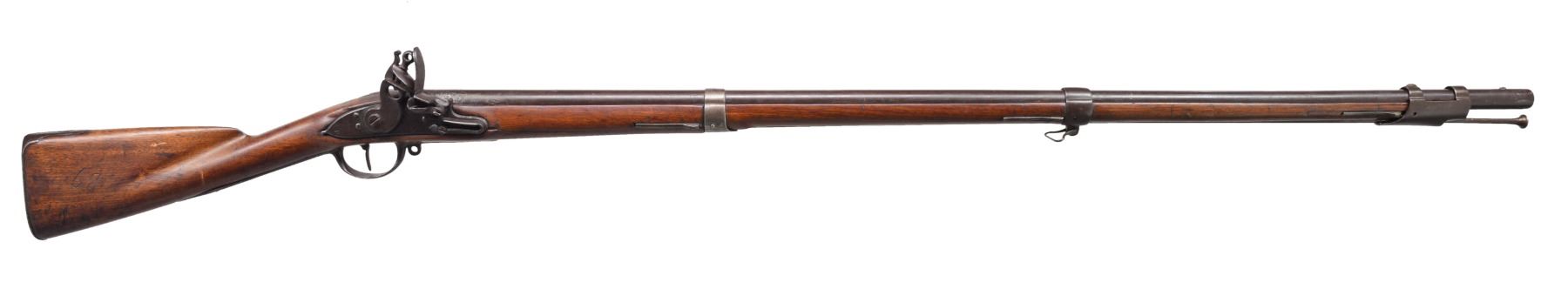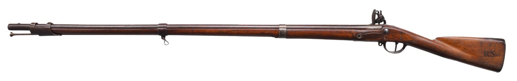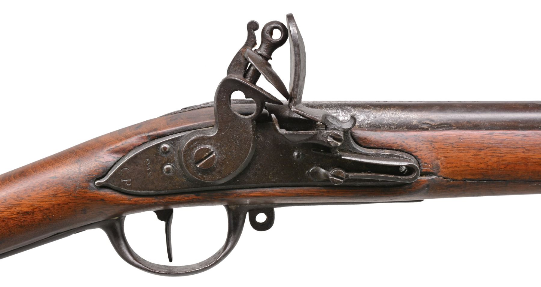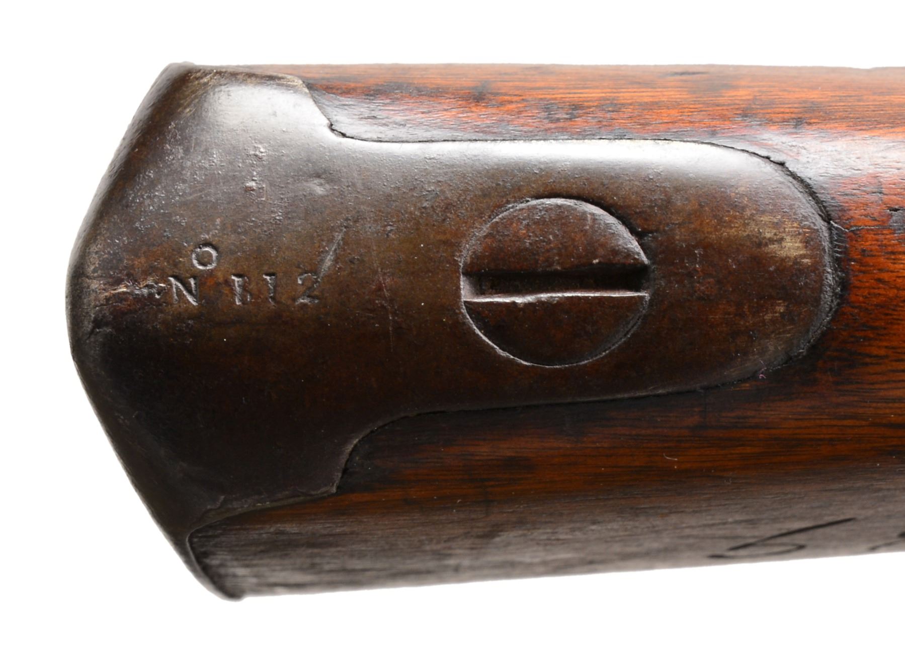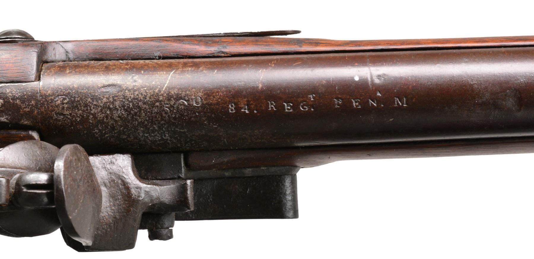 CONTRACT FLINTLOCK MUSKET, REGIMENTALLY MARKED. Cal.70. S# 112. Bbl. 44". Under the Militia Act of 1797, Pennsylvania contracted for muskets, Owen Evans had contract for 1,200 guns which were all delivered by 1801, marked "No. 112" on top of buttplate. Bbl. proofs at breech only partially discernible but unit marking further down reads "5 Co 84. REGt. PENa. M". CONDITION: good overall, appears mostly original incl. flint configuration & complete other than missing rear sling swivel, front & rear bands appear replaced w/ different color & poor fit of front band. Bbl. has sm. added front sight in addition to one on front band. Stock refinished & front band spring mortise filled & spring moved. Metal mixed mostly dark patina, rear band is gray. Mechanics are fine w/ period relined frizzen, clear pitted smooth bore. (01-17222/JS). ANTIQUE. $2,000-3,000.