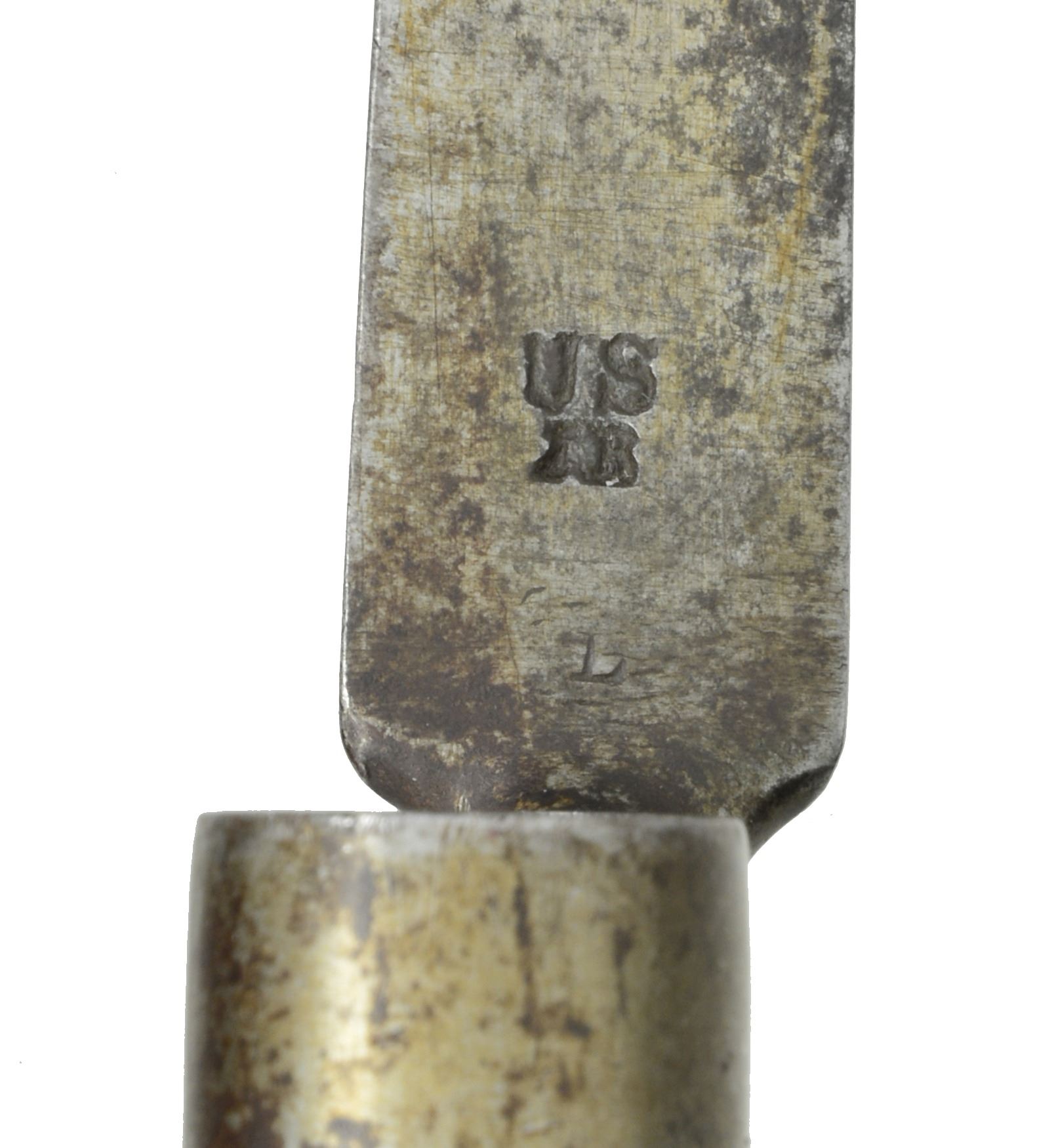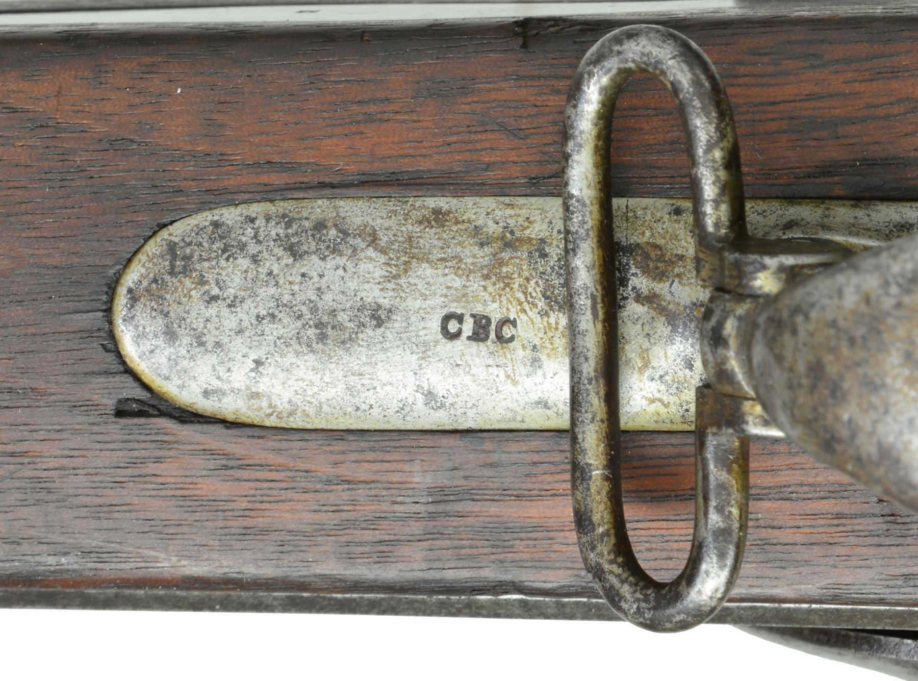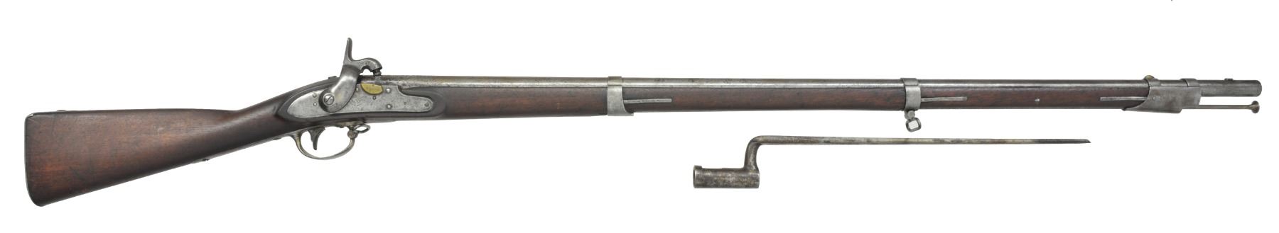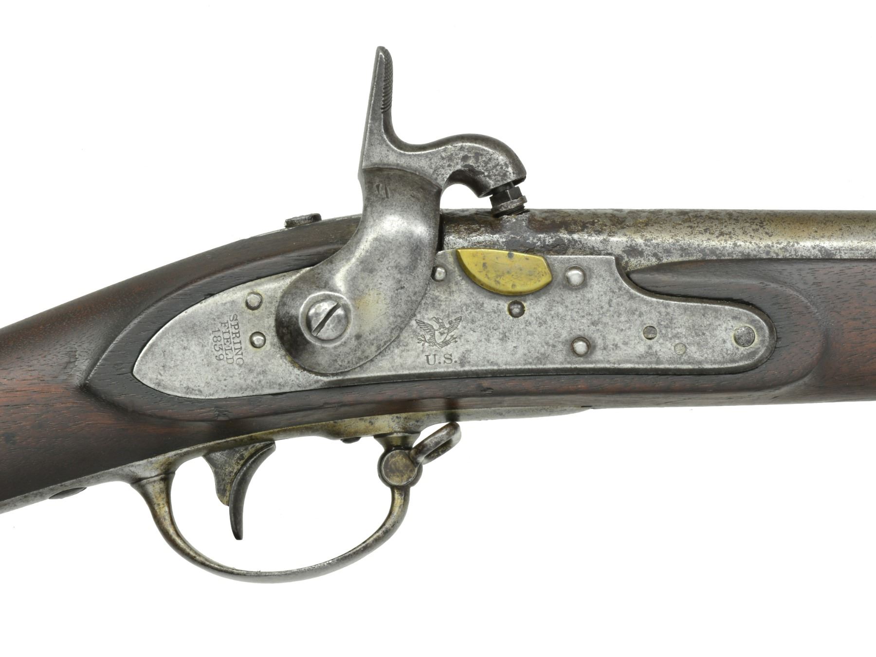 PERCUSSION CONVERSION W/ BAYONET. Cal. 69. NSN. At the beginning of the Civil War state armories were full of similar conversion muskets which were armory alterations. This is a nice survivor in original complete condition. Standard configuration w/ 42" rnd. bbl. Lock is nicely marked w/ eagle over "U.S." forward of hammer & "SPRING" / "FIELD / 1839" rear of hammer. 2 Inspector cartouches are found in flat opposite lock. UNATTACHED ACCESSORIES: bayonet. CONDITION: good overall. Appears original & complete w/ exception of reproduction ramrod. Metal is a mottled gray patina. Stock is well fit w/ scattered cosmetic blemishes & good inspection marks on belly & flat opposite lock. Mechanics functionable w/ clear smooth bore. Bayonet is U.S. surcharged & inspected. It is darker than gun but fits fairly well w/ gray patina having staining & pitting. (01-17223/JS). ANTIQUE. $600-800.