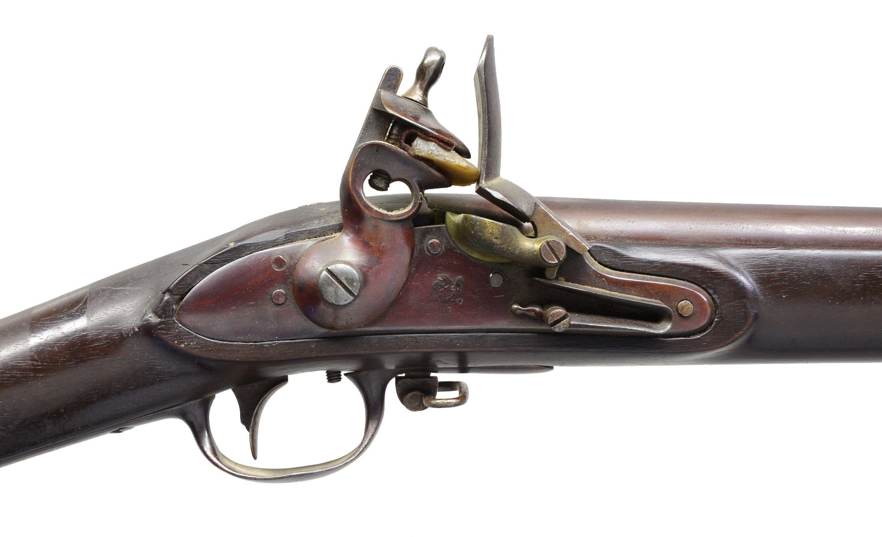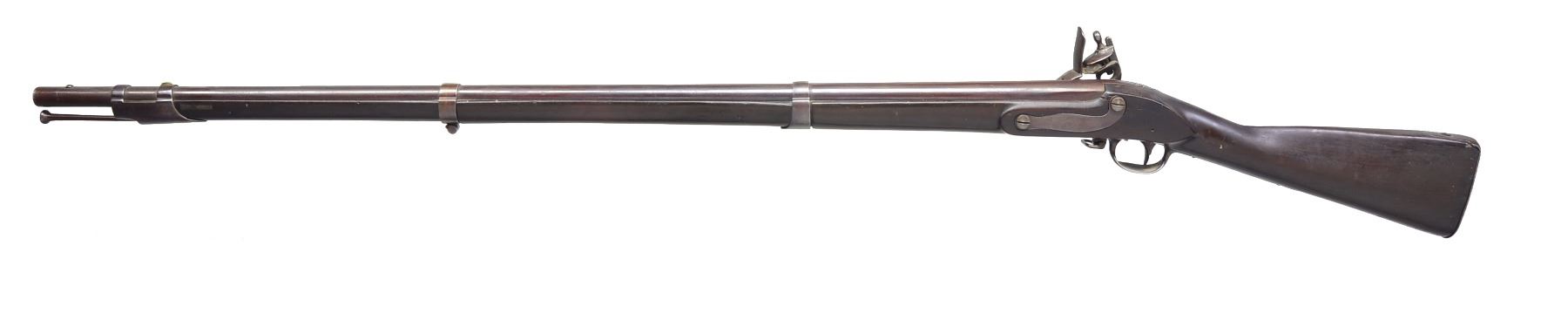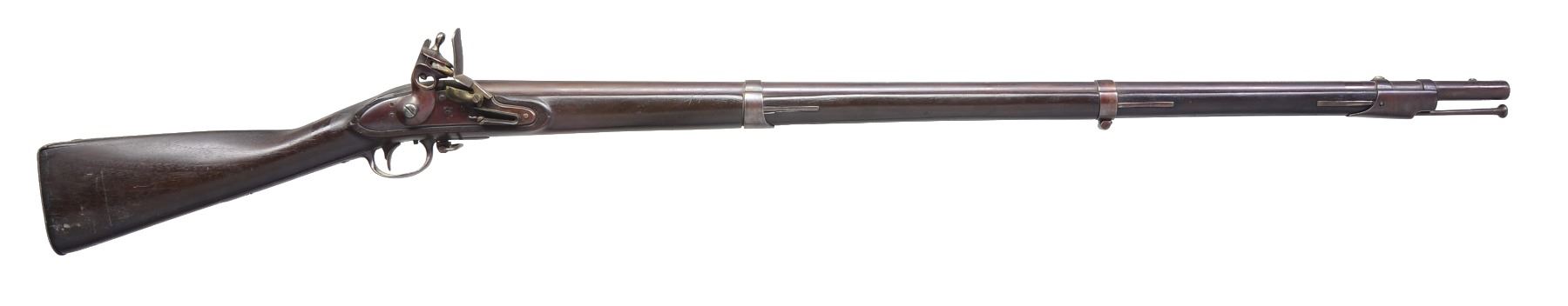 Cal. 69. NSN. Solid representative circa 1830 military flintlock musket. Bbl. 42", unmarked other than eagle over “US” on lock under brass pan. CONDITION: very good as refinished, metal retains most of rebrowned surface, stock is sound & refinished w/ crack repair above lock. Missing front sling swivel. Mechanics are crisp & clear dark smooth bore. PROVENANCE: Estate Collection of Dan Poppen. (01-17296/JS). ANTIQUE. $600-800.