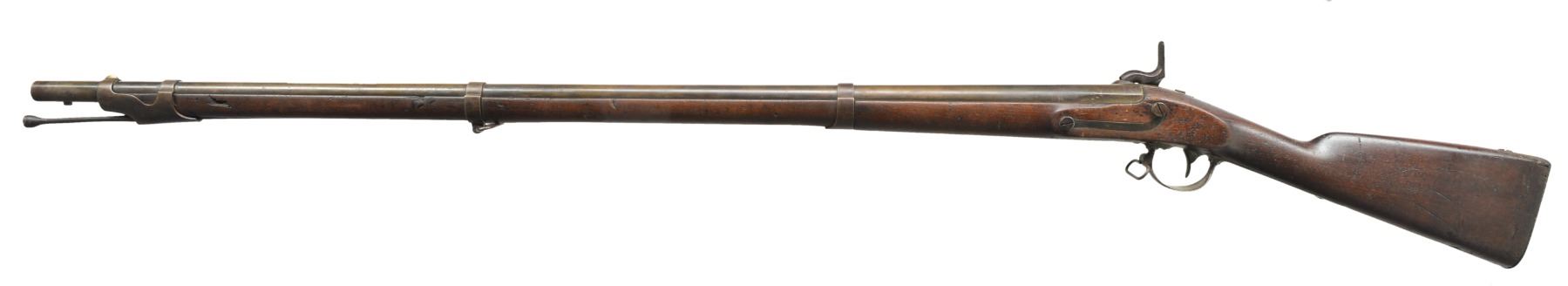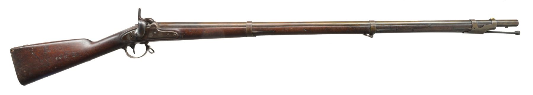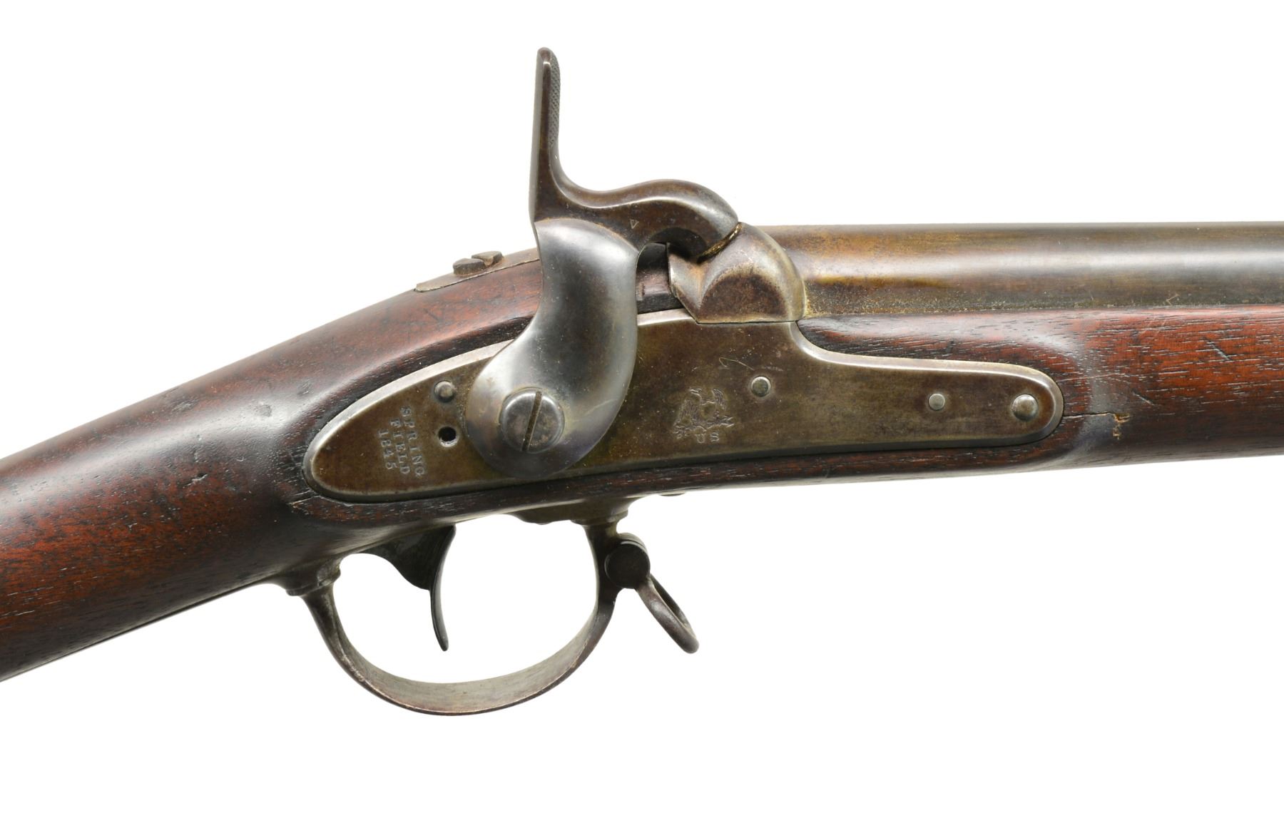 Cal. 69. NSN. Standard configuration, 42” rnd. bbl. w/ “V P” eagle head proofs, dated 1849 on tang. Lock is marked “Springfield 1845”, rear of hammer & an eagle w/ “U.S.” forward. CONDITION: metal is a mixed gray patina, discernable bbl. & lock markings. Stock is sound w/ one sm. cartouche. About 4” crack on right side of forestock between front bands. Ramrod is cut & swelled type for Model 1861. Mechanically fine though nipple is broken. Clear, smooth bore. (01-17466/JS). ANTIQUE. $600-800.