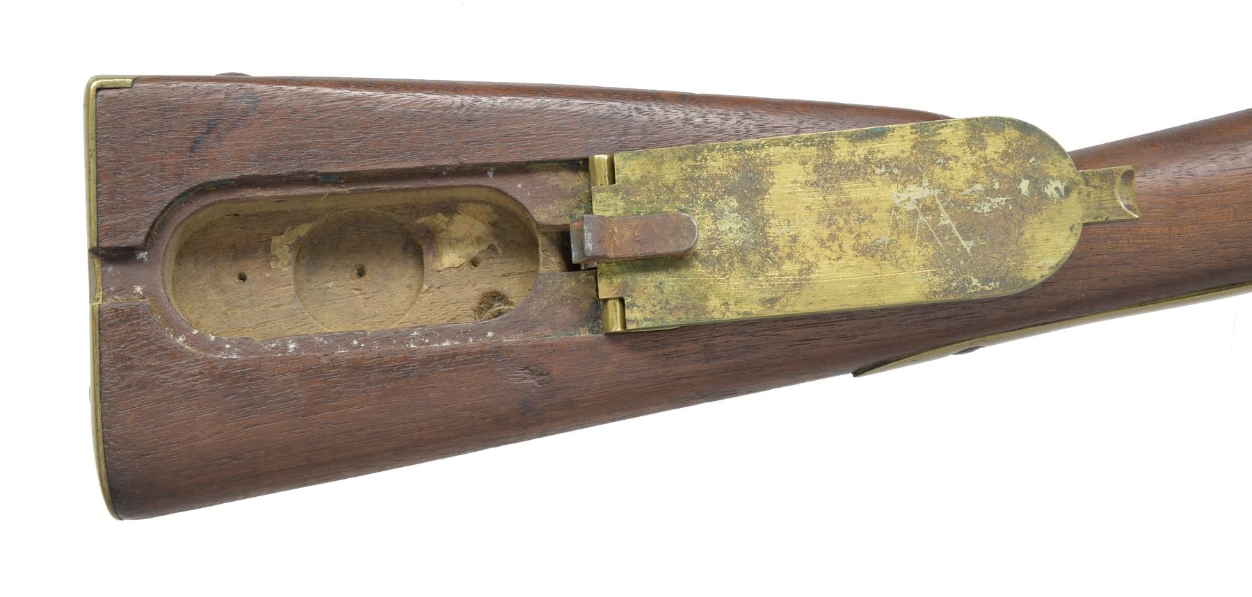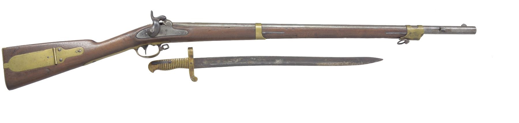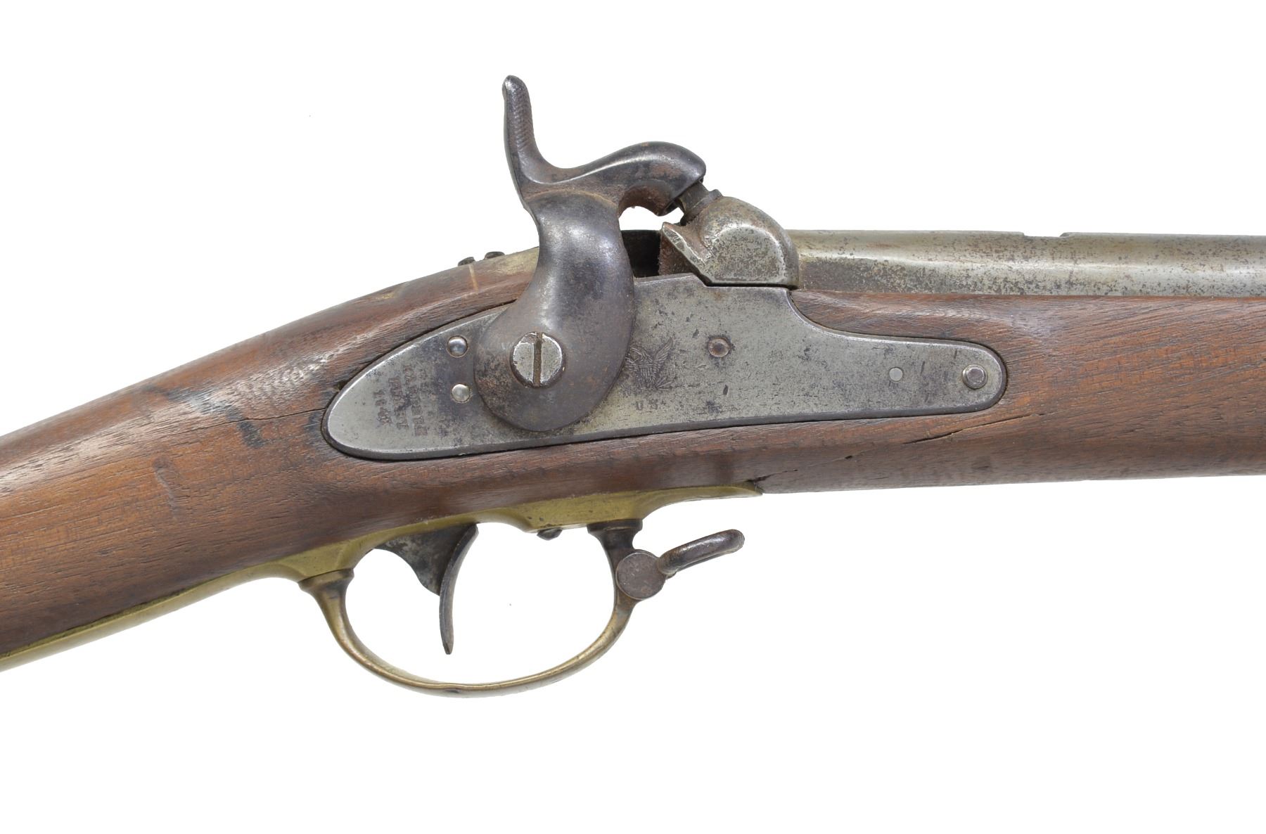 CONVERSION TO 58 CALIBER WITH BAYONET. Cal. 58. NSN. Standard configuration. Bbl. 33" w/ saber bayonet lug. Front band has been arsenal trimmed. Bayonet marked "COLLINS & CO / HARTFORD / 1861". UNATTACHED ACCESSORIES: bayonet. CONDITION: good overall, appears complete & original, though lacking ramrod. Metal is cleaned, mixed gray patina, brass cleaned w/ medium mustard patina. Lock markings discerned. Bbl. proofs light & partially discernable. Stock refinished w/ approx. 7" crack repair on right side under forward portion of lock. Stock has several hairlines, chips & overall eroded surface. Worn dark lightly pitted bore. Bayonet numbered "91" & only fits part way, but does not lock. Mechanically fine & crisp rifled bore. PROVENANCE: Estate Collection of Dan Poppen. (01-17295/JS). ANTIQUE. $1,200-1,500.