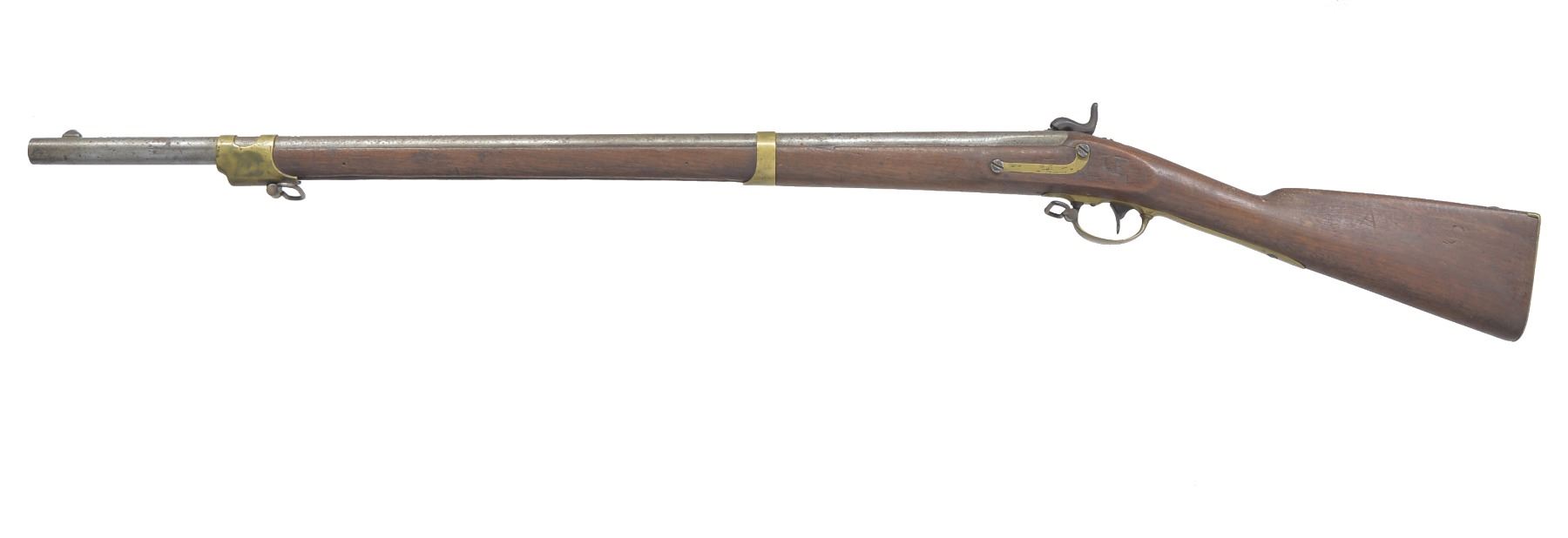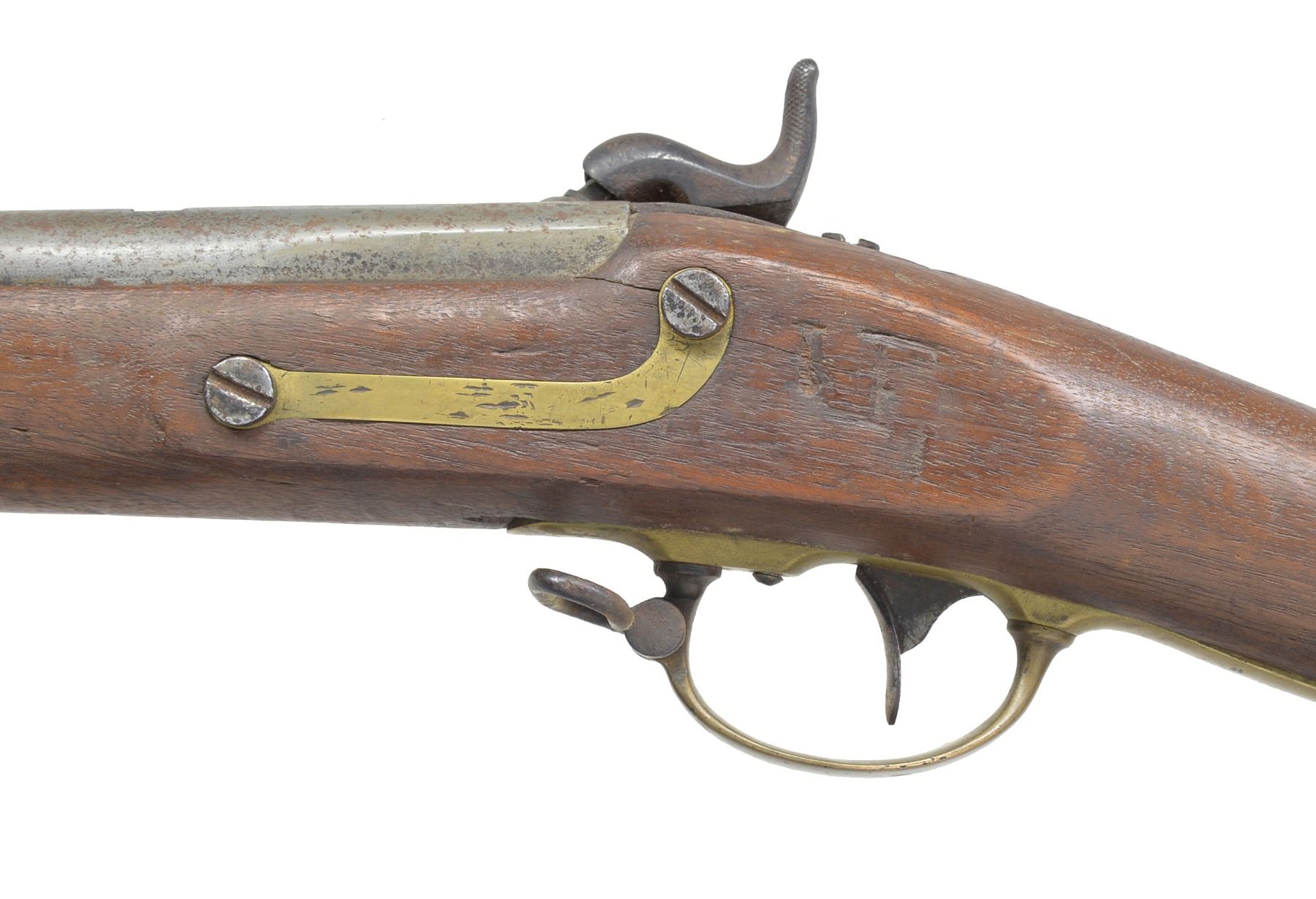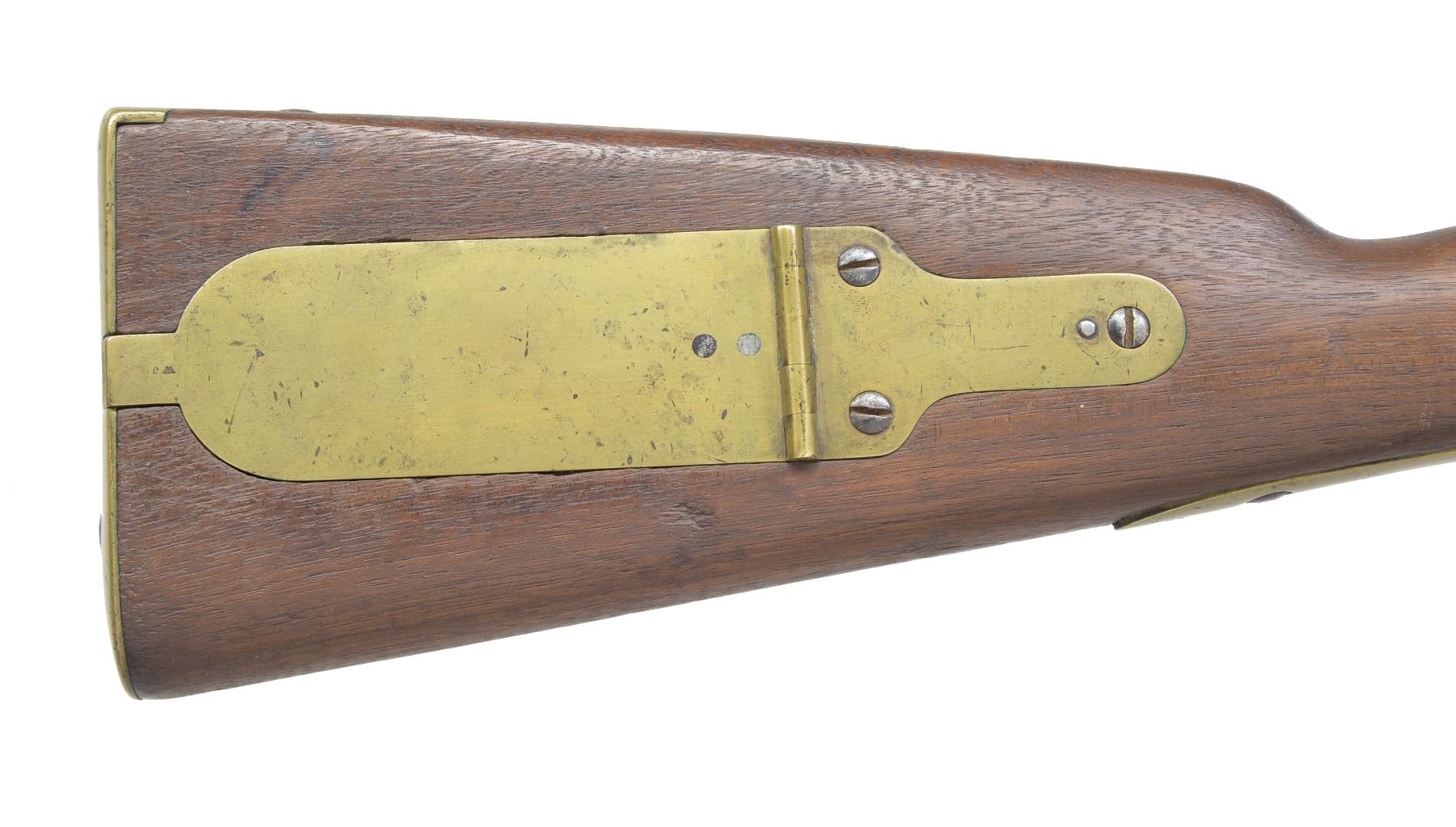 CONVERSION TO 58 CALIBER WITH BAYONET. Cal. 58. NSN. Standard configuration. Bbl. 33" w/ saber bayonet lug. Front band has been arsenal trimmed. Bayonet marked "COLLINS & CO / HARTFORD / 1861". UNATTACHED ACCESSORIES: bayonet. CONDITION: good overall, appears complete & original, though lacking ramrod. Metal is cleaned, mixed gray patina, brass cleaned w/ medium mustard patina. Lock markings discerned. Bbl. proofs light & partially discernable. Stock refinished w/ approx. 7" crack repair on right side under forward portion of lock. Stock has several hairlines, chips & overall eroded surface. Worn dark lightly pitted bore. Bayonet numbered "91" & only fits part way, but does not lock. Mechanically fine & crisp rifled bore. PROVENANCE: Estate Collection of Dan Poppen. (01-17295/JS). ANTIQUE. $1,200-1,500.