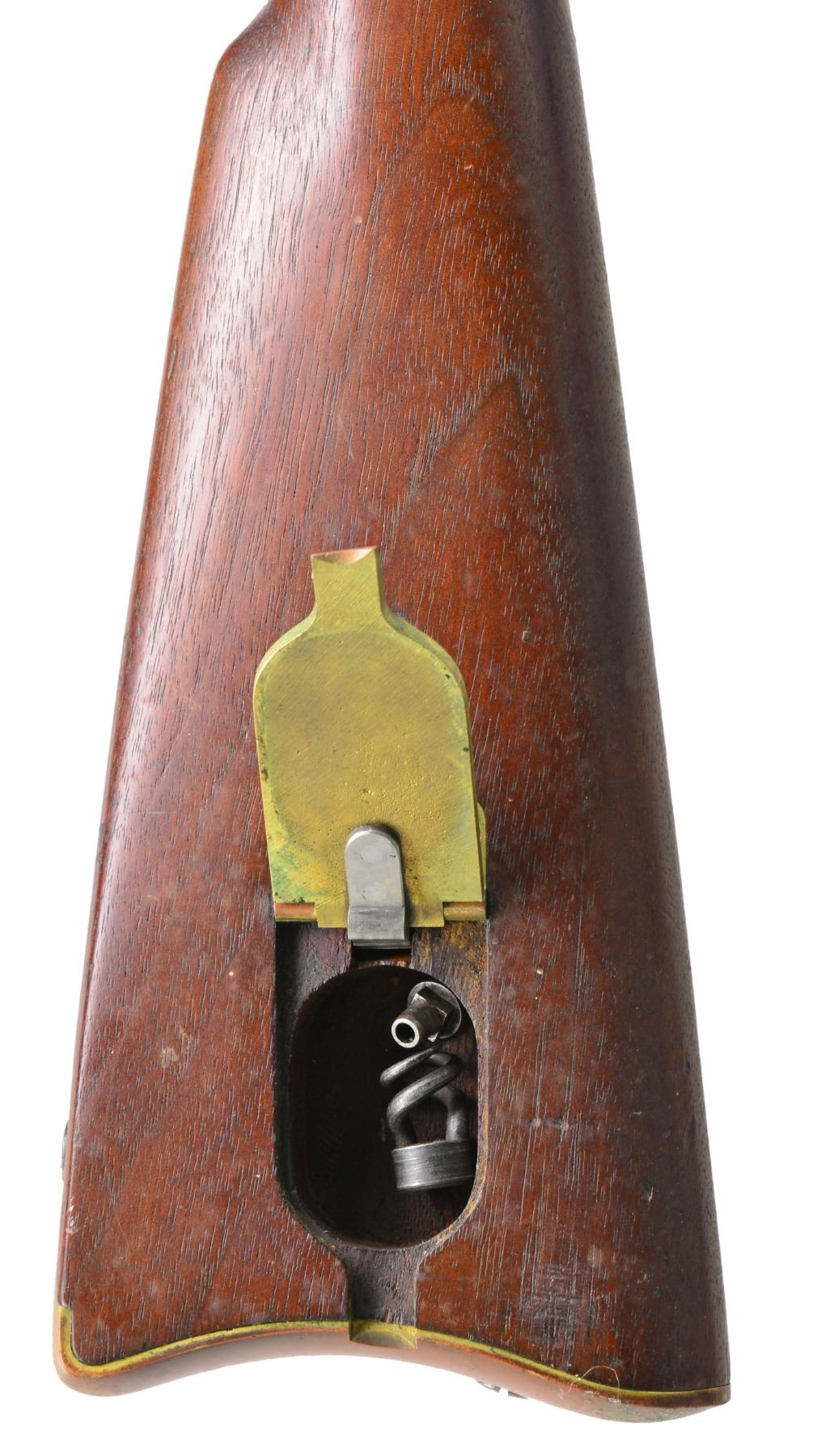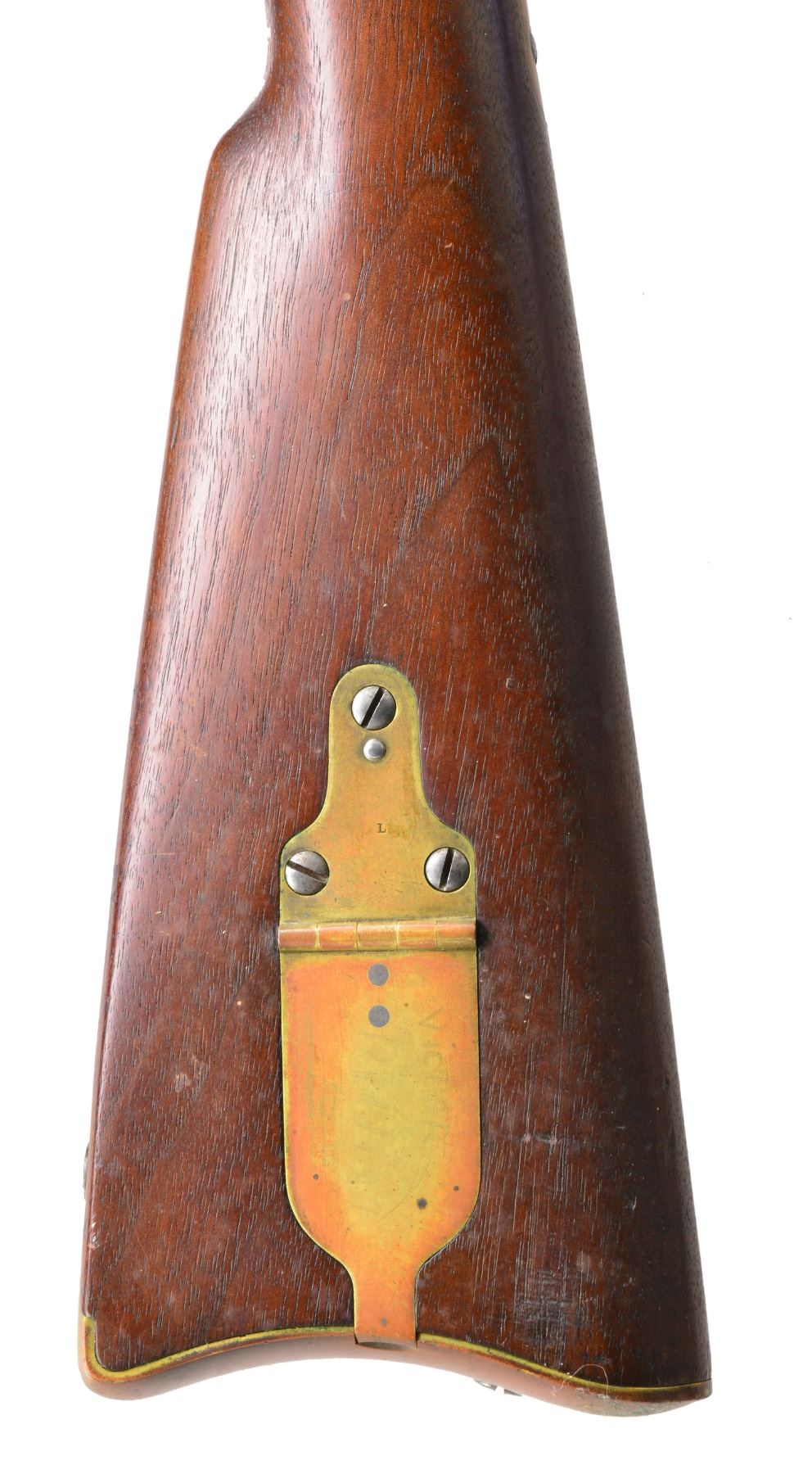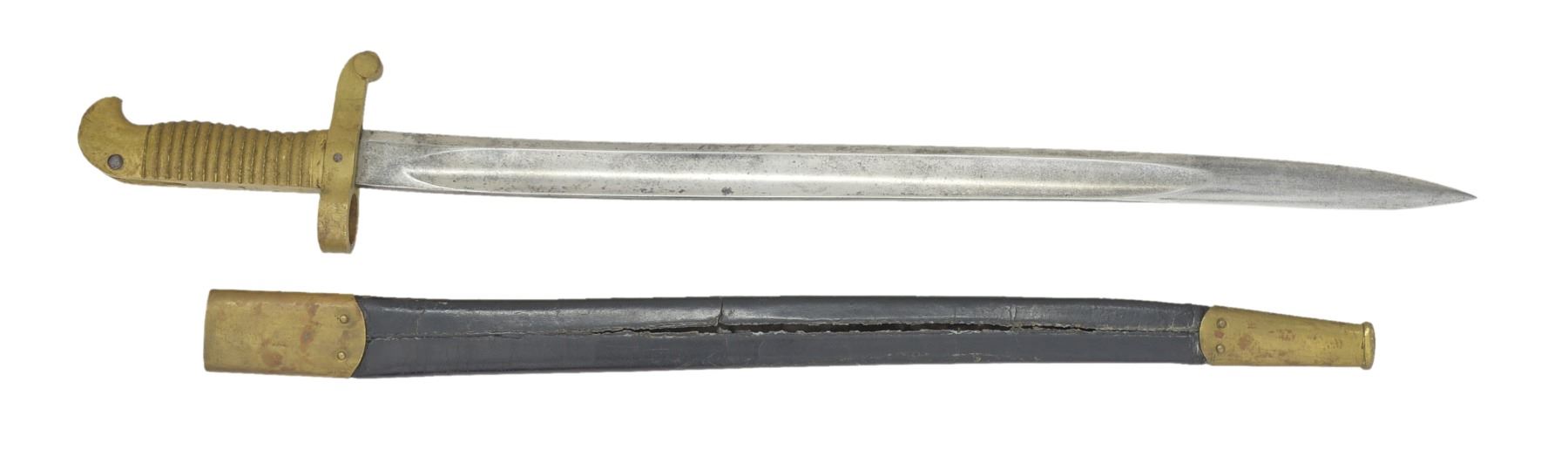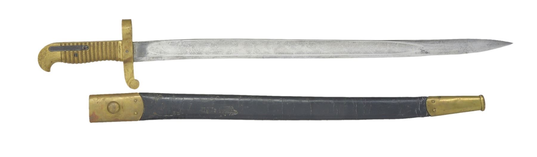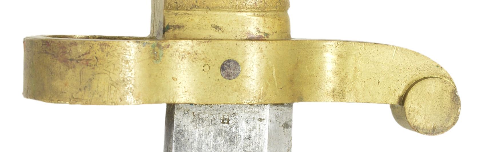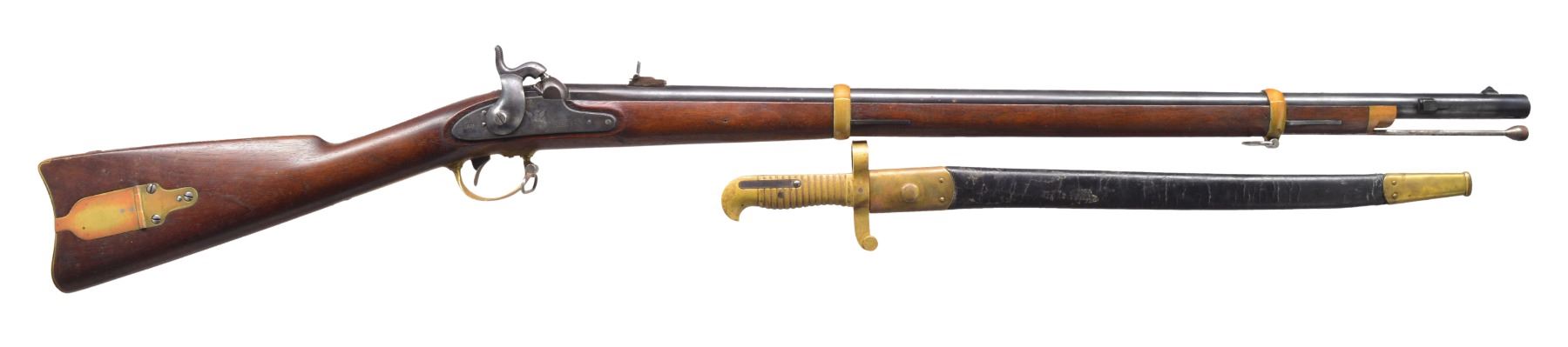 PERCUSSION RIFLE WITH BAYONET AND SCABBARD. Cal. 58. NSN. Standard configuration of popular Civil War brass mounted rifle w/ 33" rnd. bbl. having "VP"/eagle head proofs & "1863" date on bbl. tang, two cartouches on stock "BH" (Benjamin Hannis) & "HDJ" (Henry D. Jennings) & inspector marks found on most every metal piece, bbl. inspected "RDA" (Renick K. Arnold). UNATTACHED ACCESSORIES: complete, original in every regard w/ fine matching bayonet & scabbard, bayonet also inspected by “BH” (Benjamin Hannis). CONDITION: fine to very fine overall. Bbl. retains over 90% original blue w/ light pitting at breech. Bore has crisp rifling w/ pitting. Lock & hammer retain approx. 50% of their muted case colors w/ balance a pitted silver/gray. Brass is smooth & very good overall w/ mixed mustard colored patina. Stock is sound & solid, sharp edges & good cartouches, scattered cosmetic blemishes. Mechanics are fine. Bayonet is fine overall w/ mostly bright blade w/ staining, scabbard is solid w/ most original black finish, seam unsewn & 1/2" crack. PROVENANCE: Estate Collection of Dan Poppen. (01-17303/JS). ANTIQUE. $2,000-2,500.