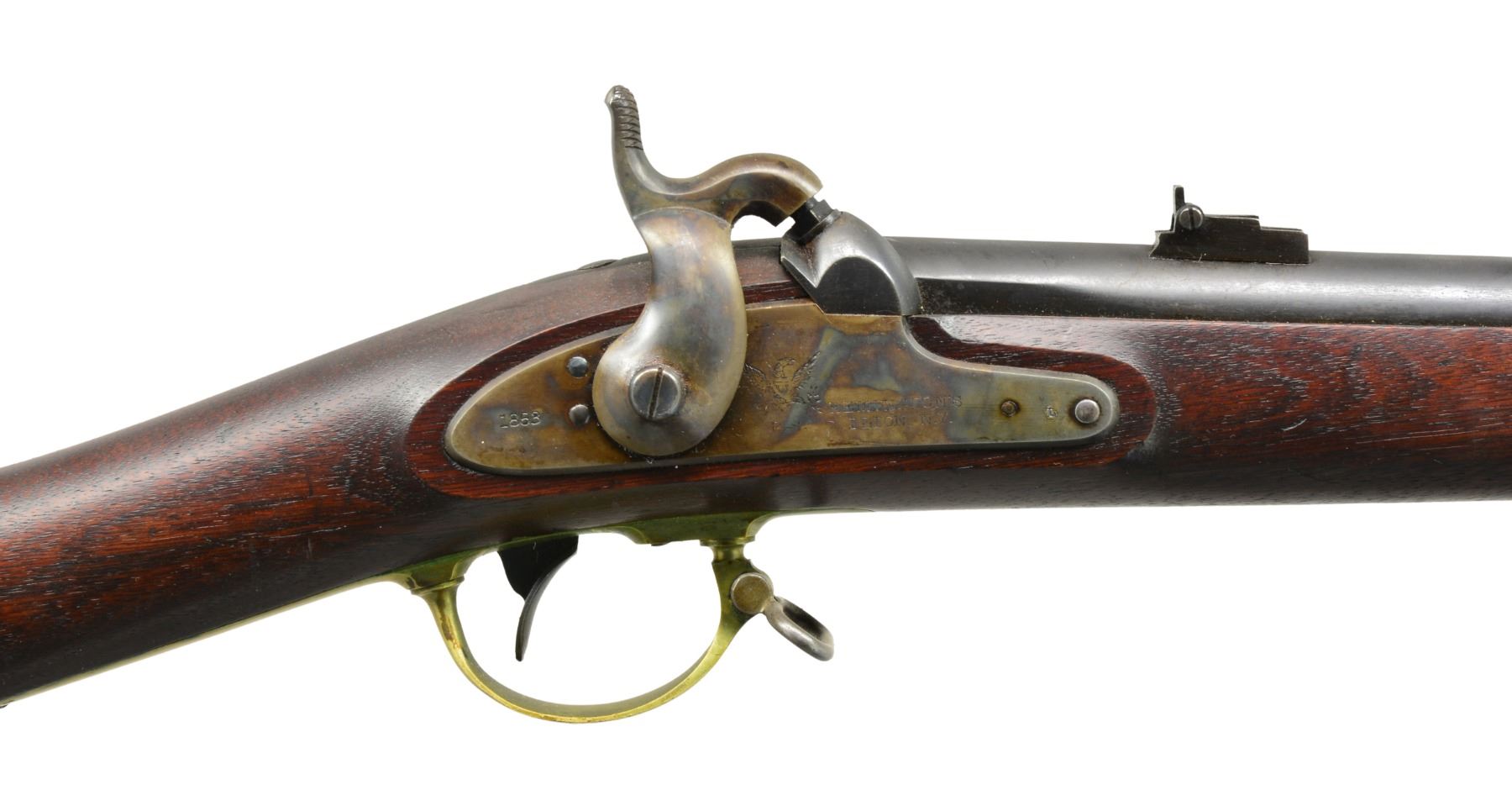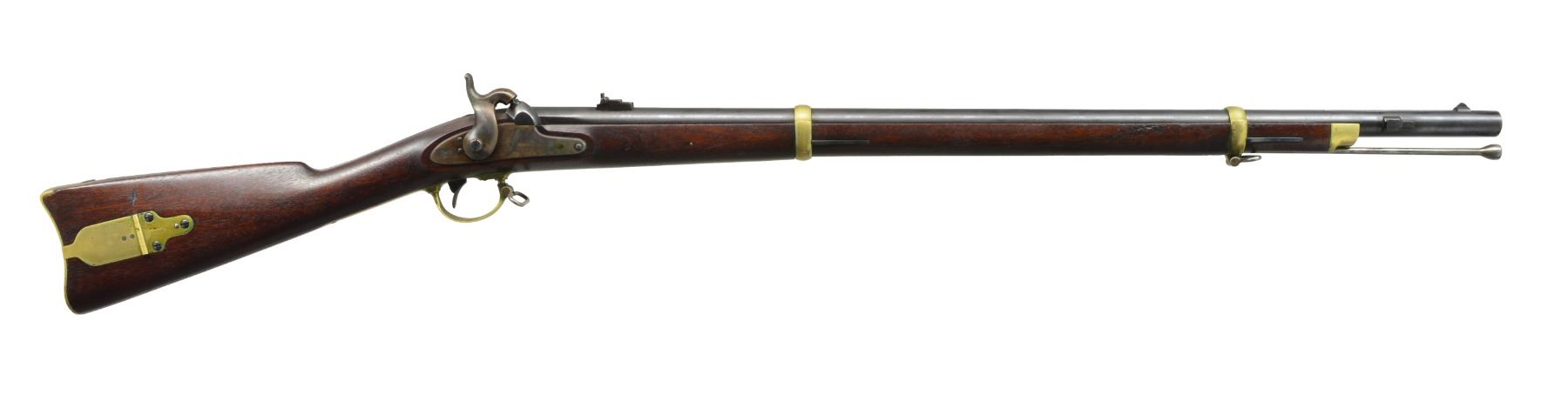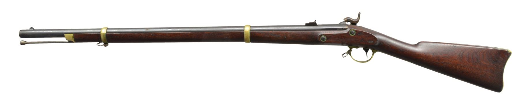 PERCUSSION RIFLE. Cal. 58. NSN. Standard configuration of popular Civil War brass mounted rifle w/ 33" rnd. bbl. having "VP"/eagle head proofs & "1863" date on bbl. tang, two cartouches on stock "BH" (Benjamin Hannis) & "HDJ" (Henry D. Jennings) plus sub inspector marks found on most every metal piece. Bbl. inspected "RDA" (Renick K. Arnold) & marked “STEEL”. CONDITION: very fine overall. Bbl. retains 95% original thinning blue. Lock & hammer retain approx. 80% of their muted case colors w/ balance silver/gray. Brass is smooth & very good overall w/ light mustard patina. Stock is sound & solid, sharp edges & crisp cartouches, scattered sm. storage dents & dings. Mechanics are excellent w/ bright shiny crisp rifled bore. (01-17448/JS). ANTIQUE. $3,000-4,000.