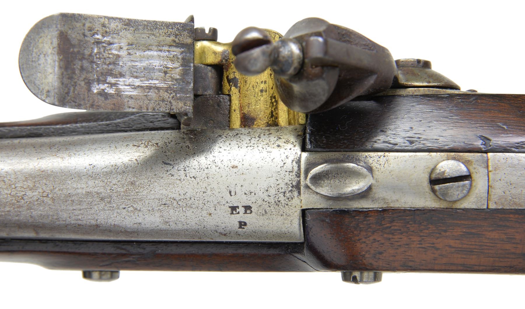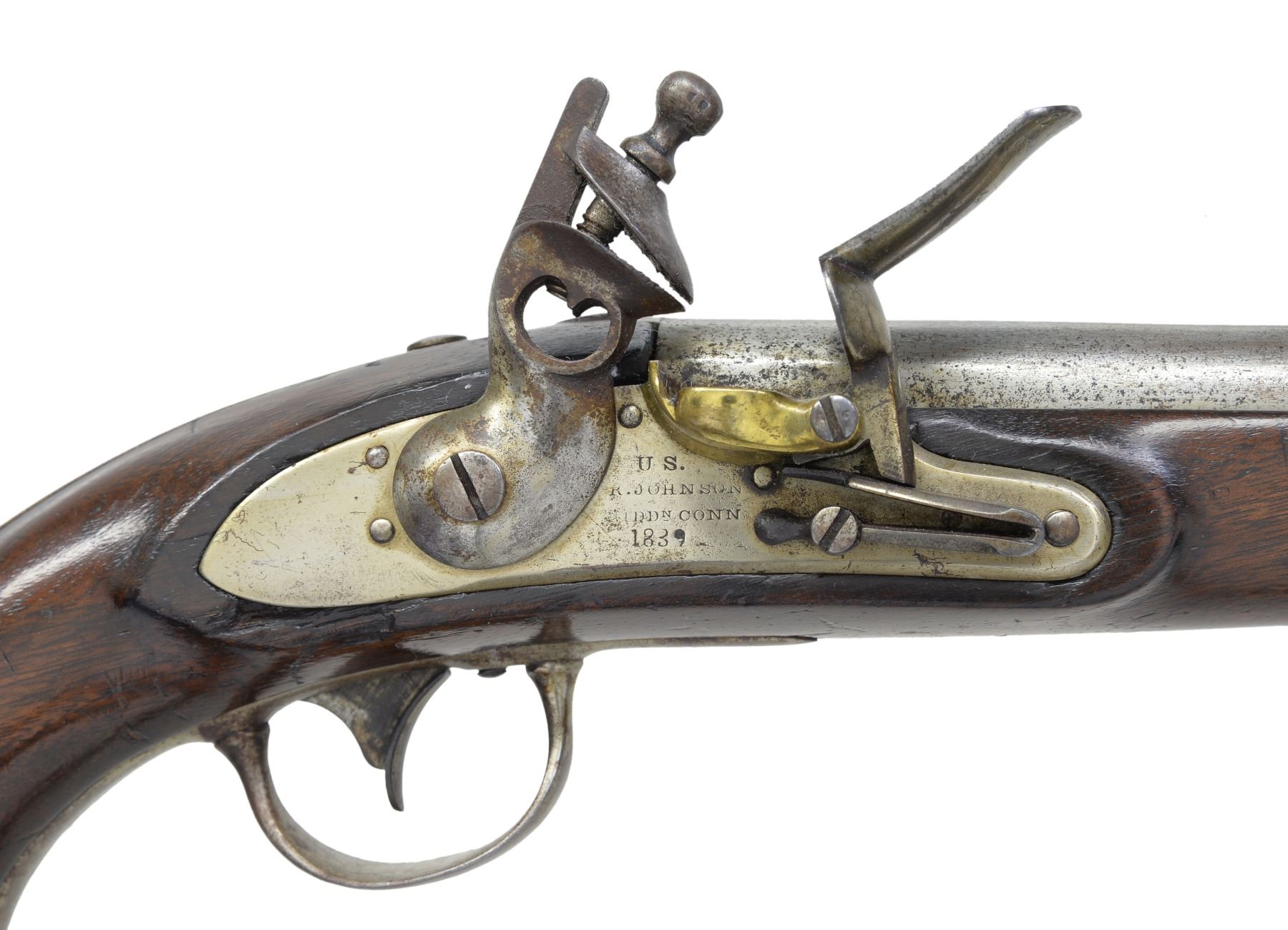 Cal. 54. NSN. This is an honest example of "1839" dated R. Johnson contract pistol made in Middleton Connecticut in standard configuration w/ 8 1/2" rnd. bbl. & swivel ramrod. CONDITION: good-very good overall, all original. Metal is overall gray w/ areas of staining & pitting. Bbl. proofs, lock markings & cartouches are all discernable. Mechanically fine w/ good smooth bore. (01-17240/JS). ANTIQUE. $1,200-1,500.