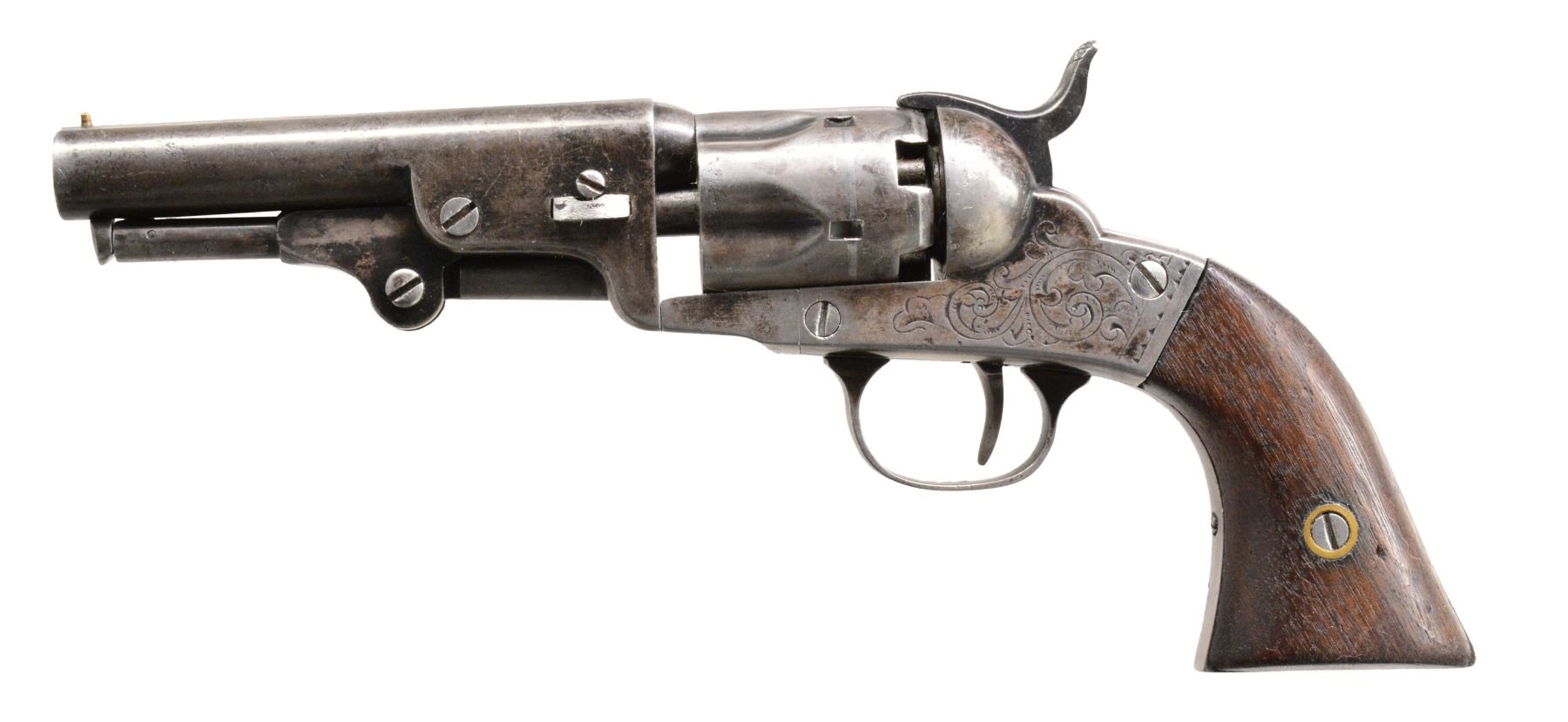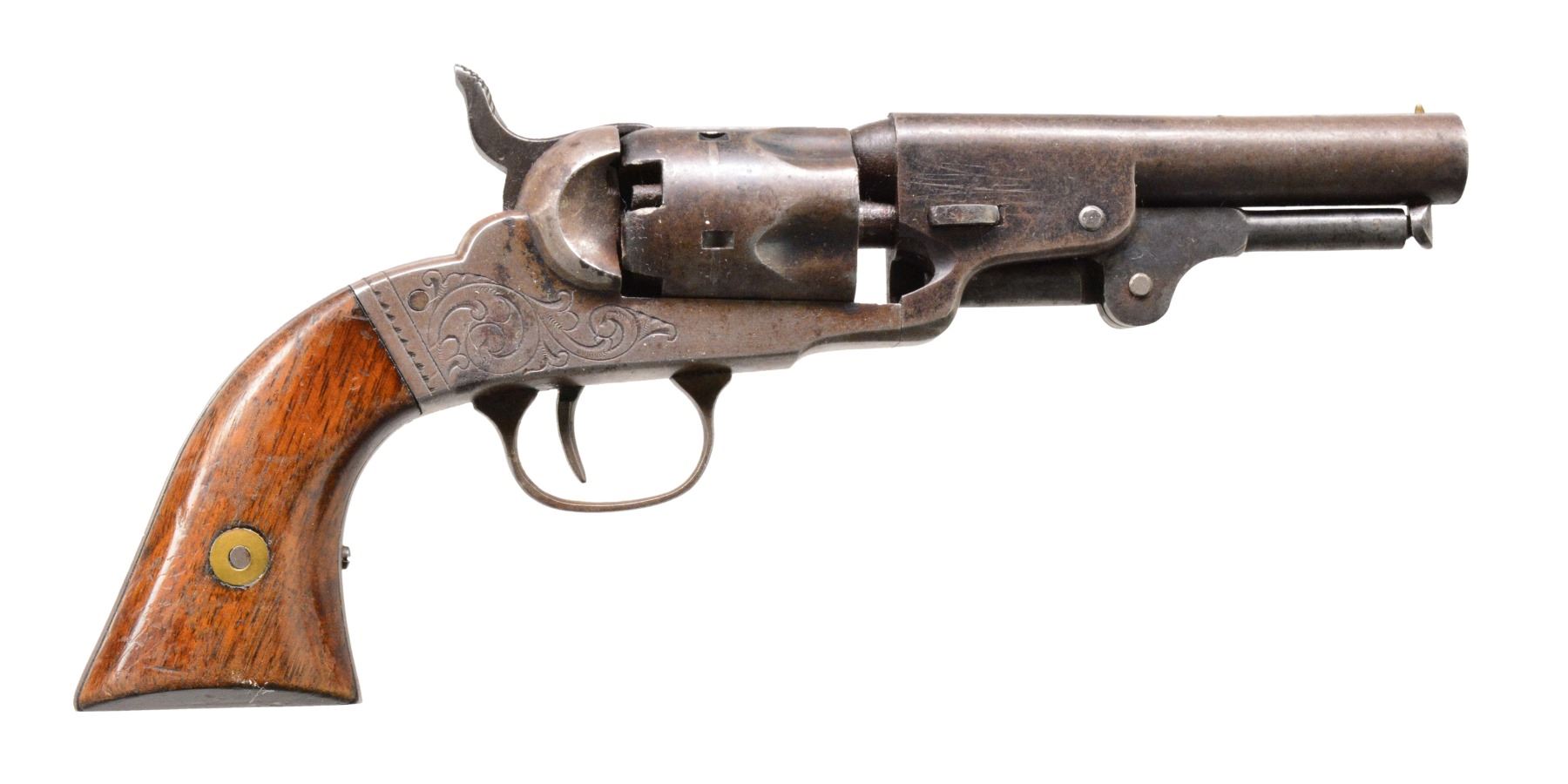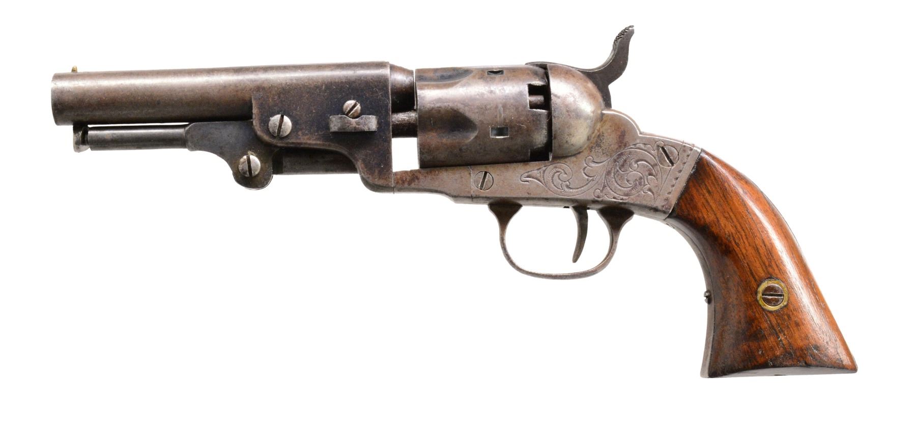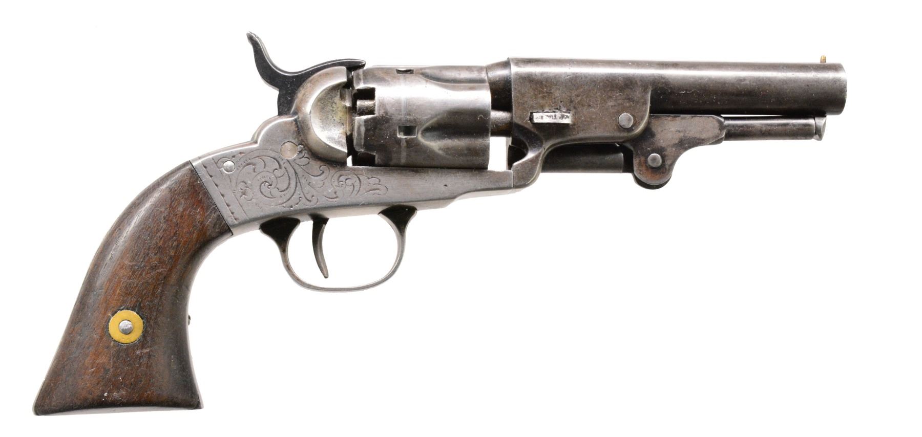 BOTH: cal. 31. Bbls. 4" rnd. w/ bead front sights. 5 Shot fluted cyls. Scroll engraved iron frames. 2 Piece checkered walnut grips. 1) S# 101. Trigger guard, bbl. & loading lever have matching numbers. CONDITION: metal finish is fading to mottled gray brown showing scattered spots of corrosion. Refinished grips show wear & handling marks. Bore has slightly darkened appearance w/ intact rifling & scattered spots of light pitting. (01-17051/DS). 2) S# 399. Trigger guard, bbl. & loading lever have matching numbers. CONDITION: metal finish shows traces of blue in protected areas w/ balance faded to a mottled gray brown showing sm. dents & spots of pitting. Replacement wedge. Grips show wear & handling marks. Bore retains strong rifling showing an area of pitting near muzzle. Cyl. timing is slow not allowing action to repeatedly cock & rotate properly. (01-17052/DS). BOTH ANTIQUE. $800-1,200.
