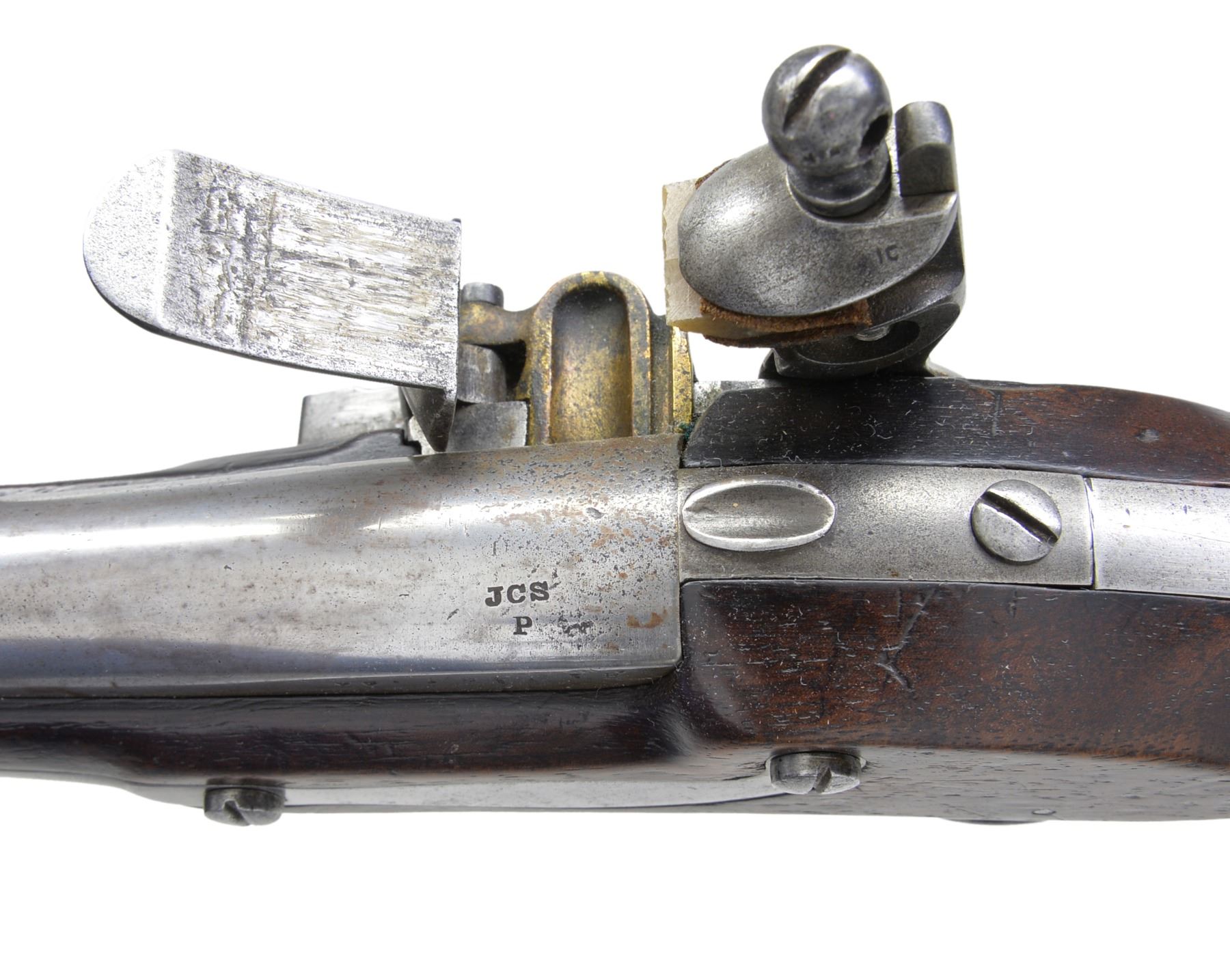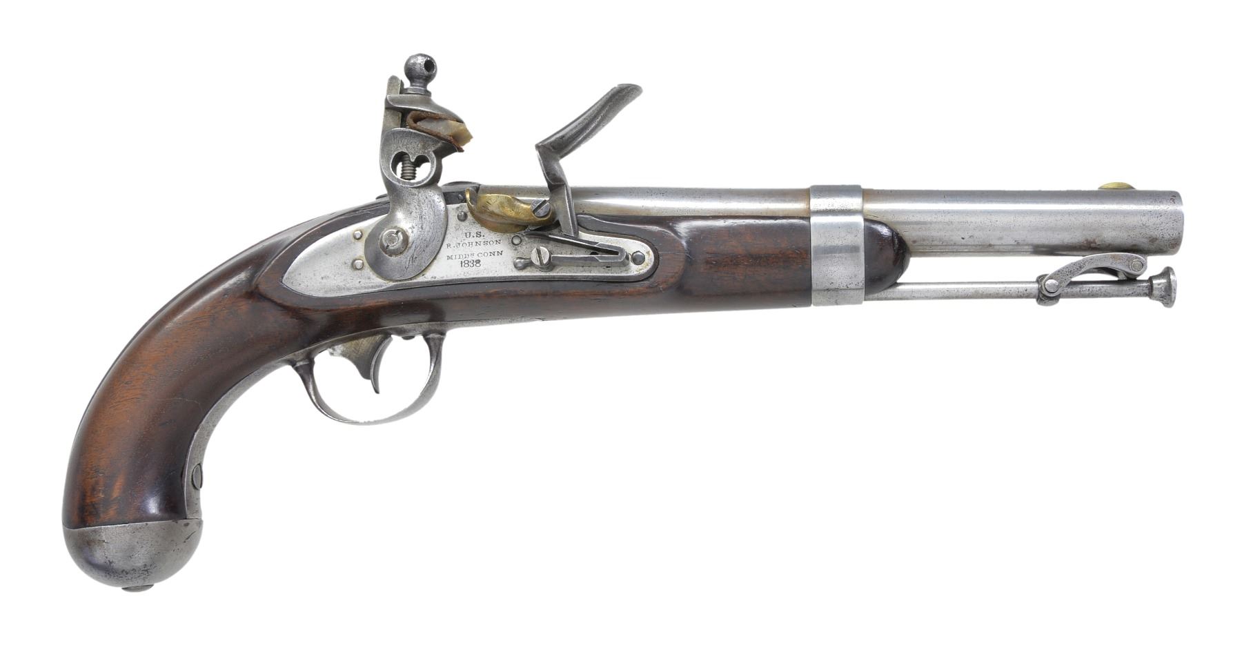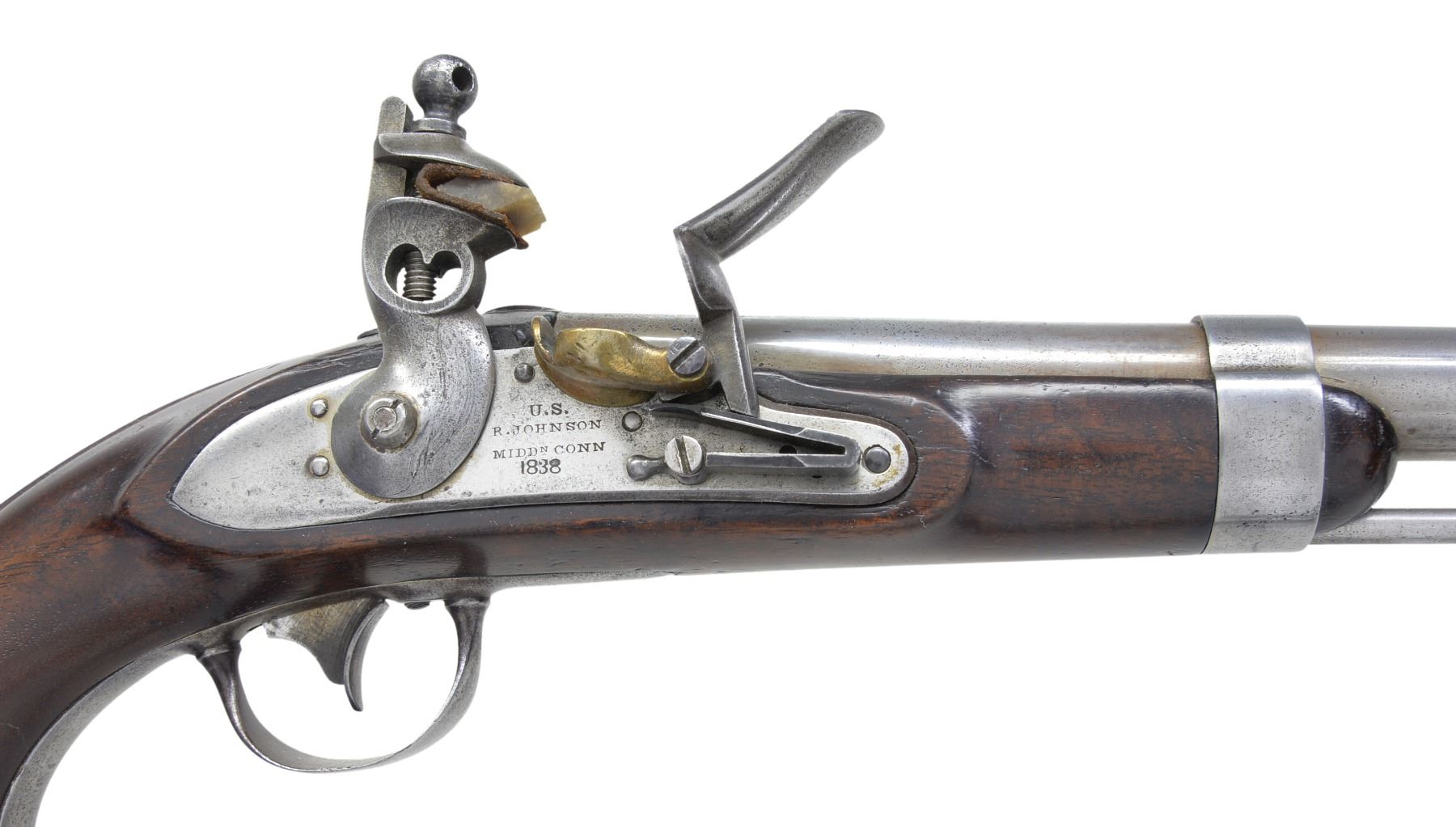 Cal. 54. NSN. Bbl. 8 1/2" rnd. w/ brass blade front sight & smooth bore. Top tang has oval shaped rear sight. Bbl. has inspectors marks "JCS / P". Lock is marked "U.S. / R. JOHNSON /MIDDn CONN / 1838". Walnut stock w/ iron bbl. band, sideplate, trigger guard, buttcap & back strap. Right ear of stock stamped "ORD." Button tip iron swivel ramrod. Estimated quantity 18,000 mfg 1836-1844. CONDITION: metal is cleaned bright showing scattered spots of light pitting. Refinished wood shows remnants of cartouche. Bore is dark showing areas of pitting. (01-17047/DS). ANTIQUE. $1,500-2,000.