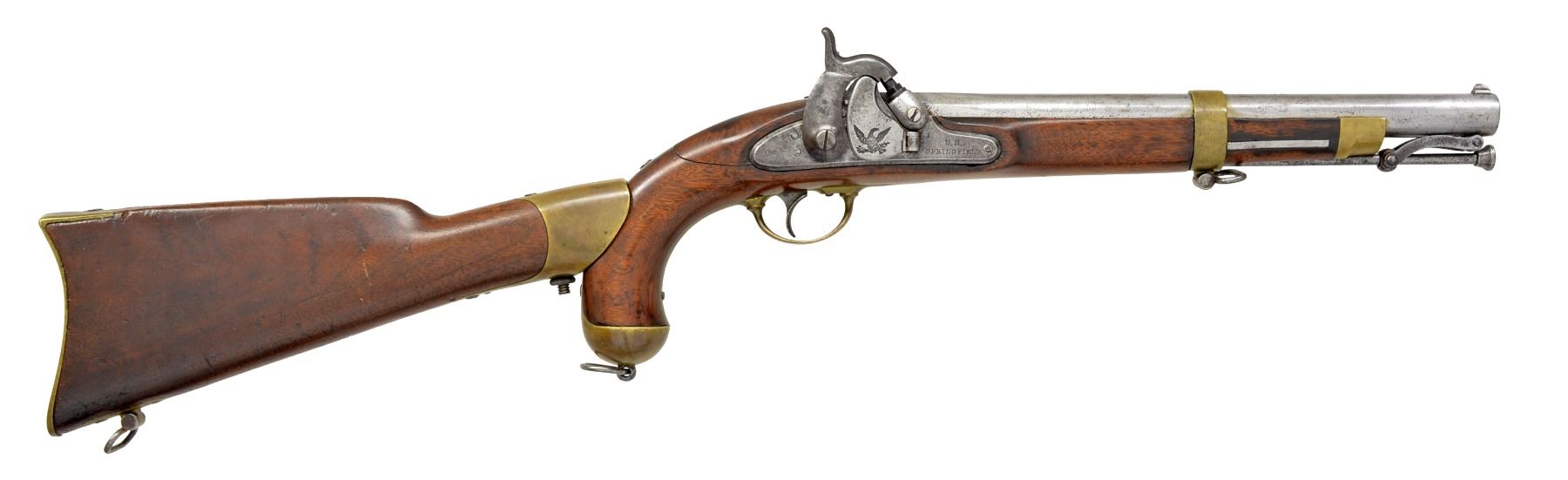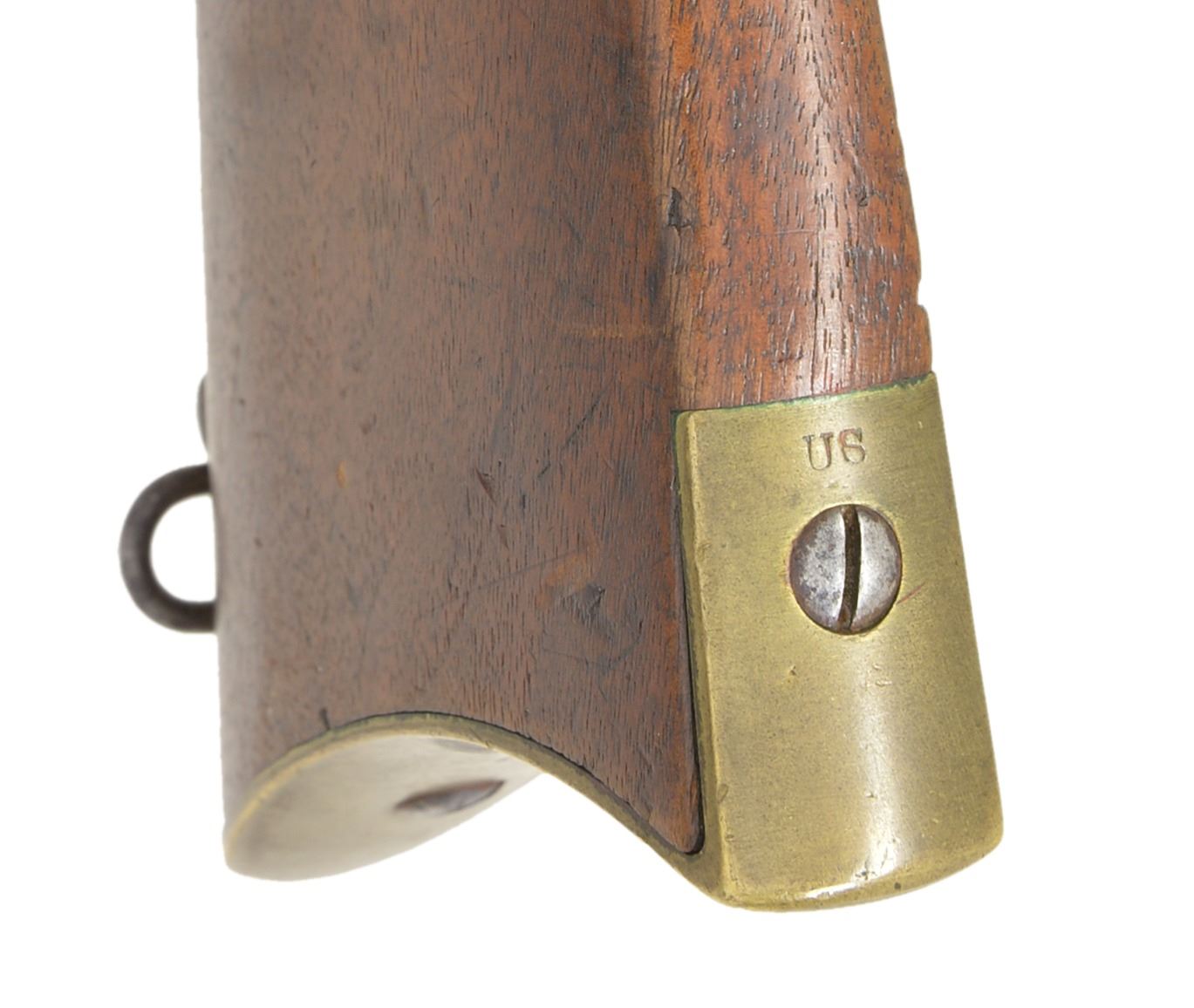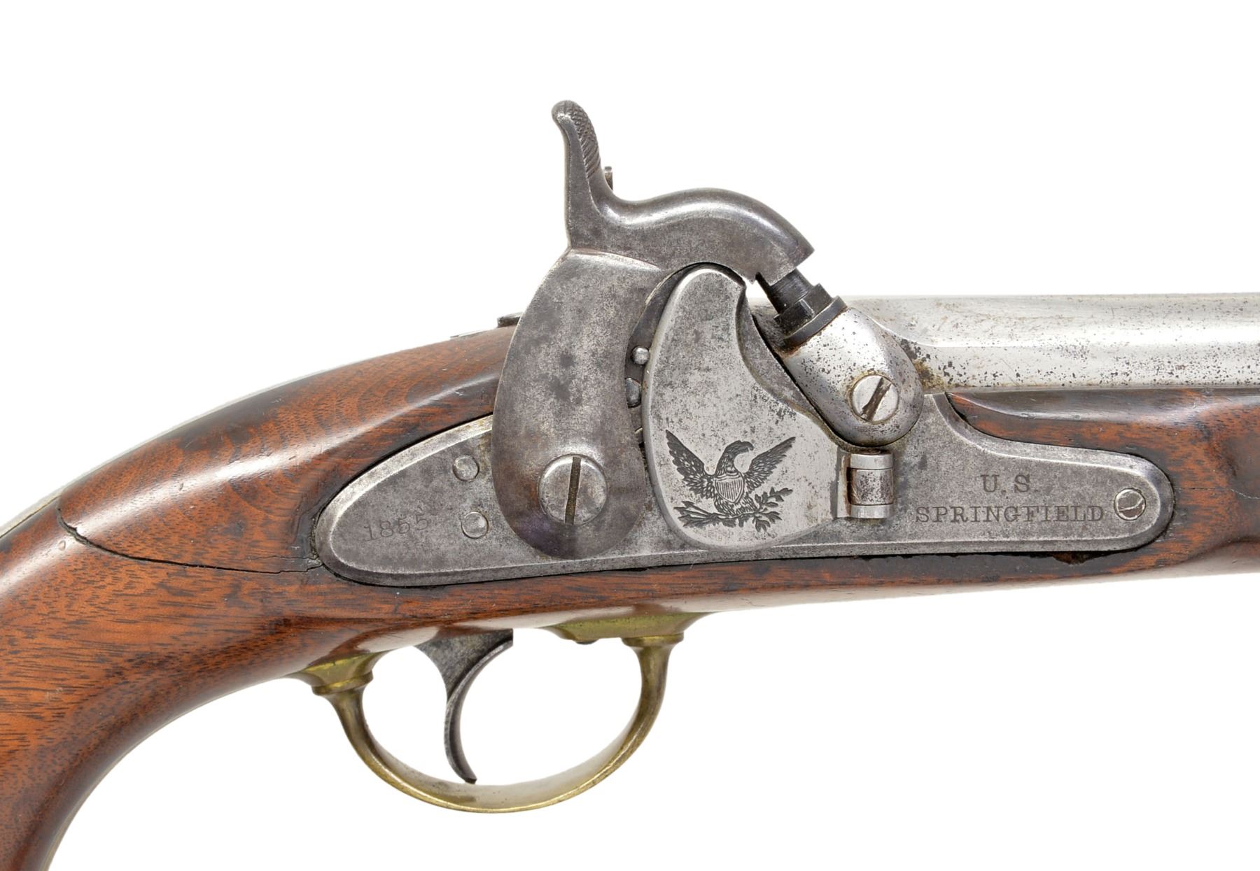 PERCUSSION PISTOL CARBINE WITH DETACHABLE STOCK. Cal. 58. NSN. This is a fine example of the unique & popular martial Civil War era pistol carbine. Conforms w/ other examples w/ rifled 12" rnd. to oct. bbl. marked at left breech "V/P" over eagle's head & dated "1855" on tang forward of folding 3 position 2 leaf sight. Lock marked on primer door w/ spread winged eagle & "U.S./SPRINGFIELD" in front of lock & dated "1855" behind the hammer. Walnut stock has inspector cartouche opposite lock, brass mountings on pistol & stock. Buttplate surcharged “US”. CONDITION: overall very good, markings all discernible. Bbl. & lock have gray/bright patina overall w/ staining & pin prick pitting. Adj. 2 leaf rear sight complete w/ good markings. Brass mountings on pistol & stock have medium mustard patina. Walnut stock on pistol is sound, though lg. hairline on wrist left side of pistol, refinished & varnished, inspector cartouche seen in outline only. Buttstock is sound w/ cosmetic storage dings & dents. Assembly number on stock is “12” & “15” on pistol. Mechanics are crisp including Maynard tape devise w/ well discerned rifling in bore. (01-17235/JS). ANTIQUE. $3,000-4,000.