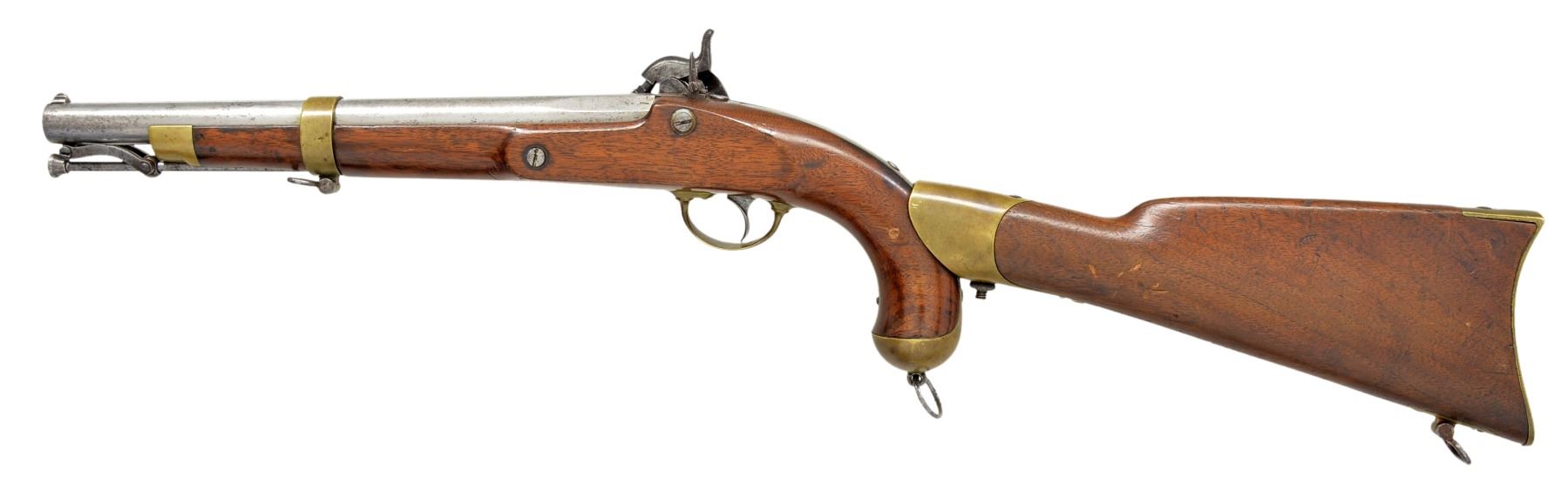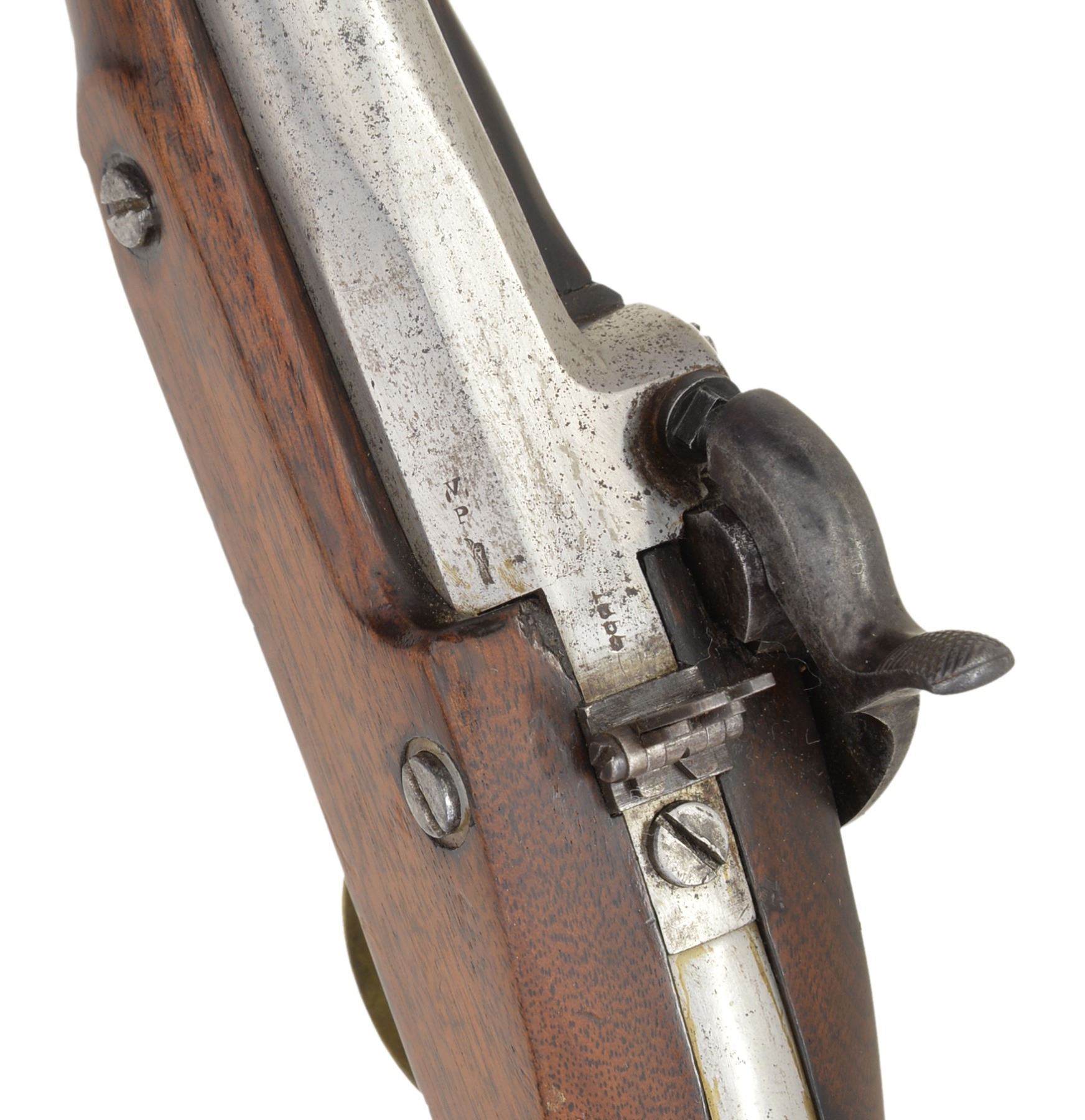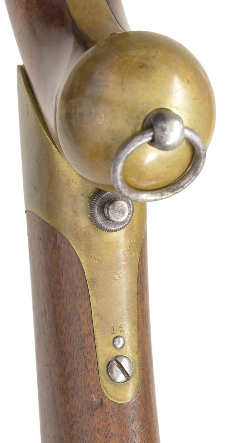 PERCUSSION PISTOL CARBINE WITH DETACHABLE STOCK. Cal. 58. NSN. This is a fine example of the unique & popular martial Civil War era pistol carbine. Conforms w/ other examples w/ rifled 12" rnd. to oct. bbl. marked at left breech "V/P" over eagle's head & dated "1855" on tang forward of folding 3 position 2 leaf sight. Lock marked on primer door w/ spread winged eagle & "U.S./SPRINGFIELD" in front of lock & dated "1855" behind the hammer. Walnut stock has inspector cartouche opposite lock, brass mountings on pistol & stock. Buttplate surcharged “US”. CONDITION: overall very good, markings all discernible. Bbl. & lock have gray/bright patina overall w/ staining & pin prick pitting. Adj. 2 leaf rear sight complete w/ good markings. Brass mountings on pistol & stock have medium mustard patina. Walnut stock on pistol is sound, though lg. hairline on wrist left side of pistol, refinished & varnished, inspector cartouche seen in outline only. Buttstock is sound w/ cosmetic storage dings & dents. Assembly number on stock is “12” & “15” on pistol. Mechanics are crisp including Maynard tape devise w/ well discerned rifling in bore. (01-17235/JS). ANTIQUE. $3,000-4,000.