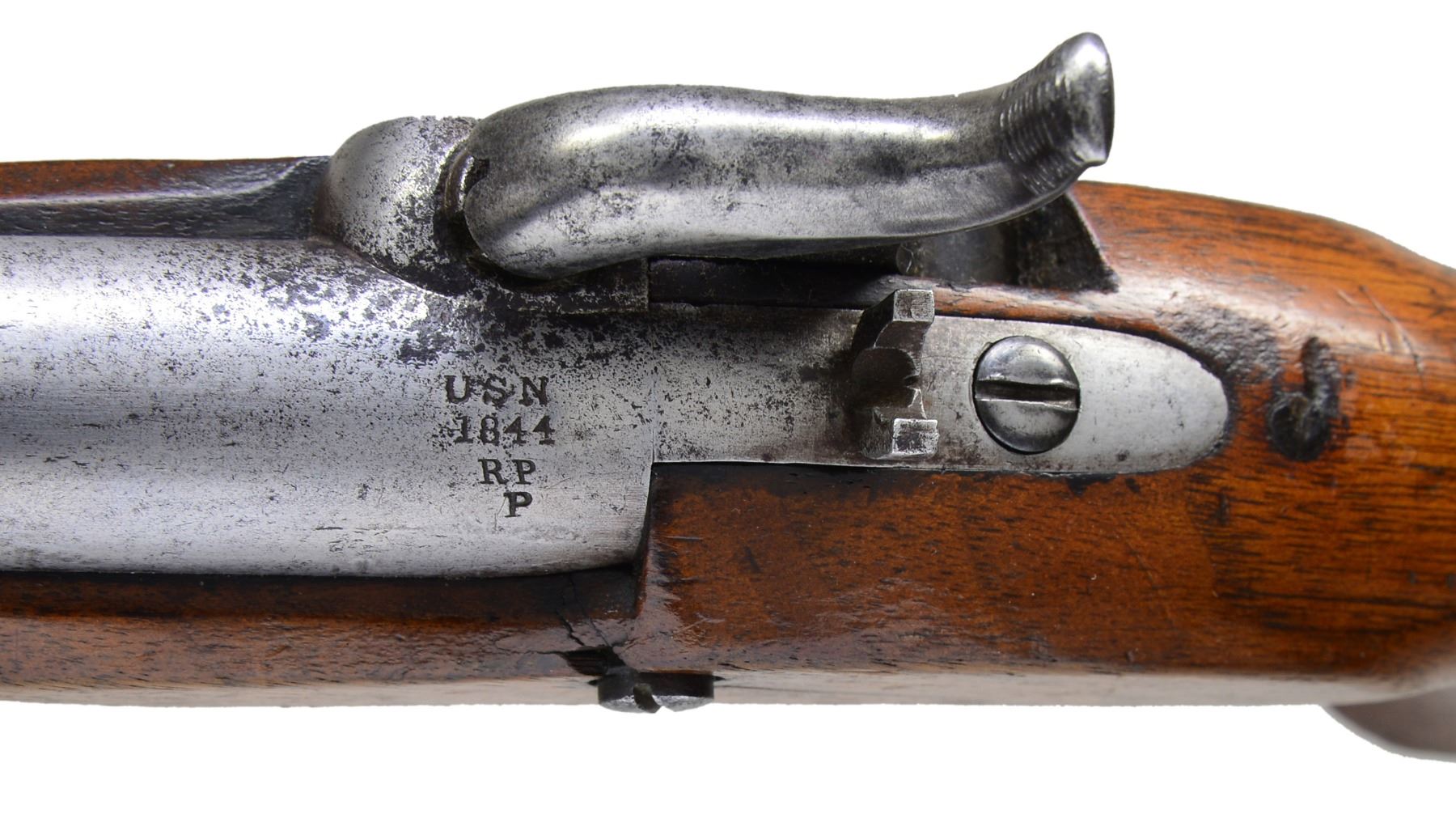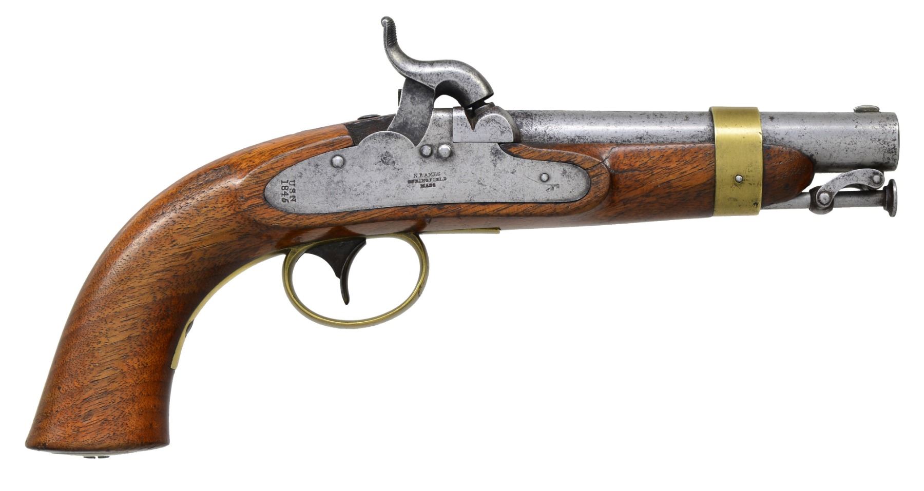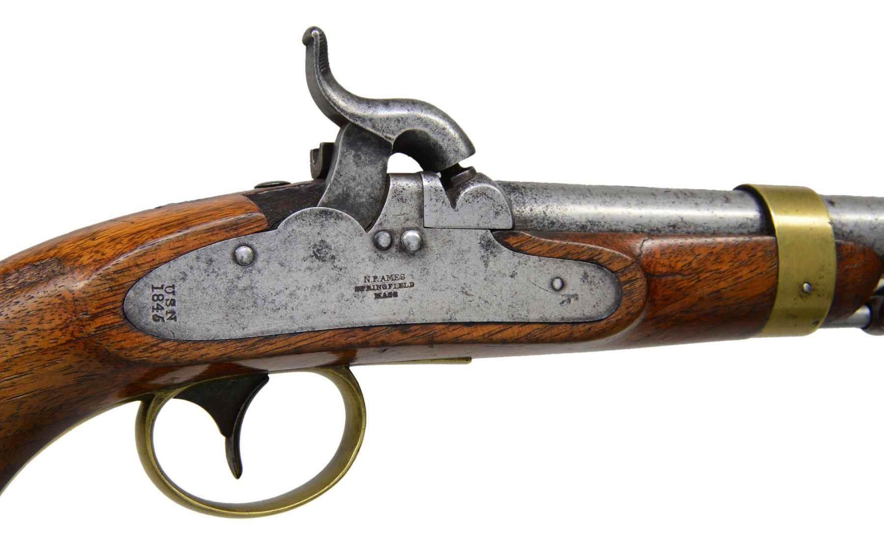 AMES. Cal. 54. NSN. Bbl. 6" rnd., marked at the breech "USN / 1844 / RP / P". Lock is marked below the hammer "N.P. AMES SPRINGFIELD MASS" & at the rear of the lockplate "USN 1846". Brass trigger guard, buttcap & bbl. band. Swivel type iron ramrod. CONDITION: metal has a light gray cleaned mottled finish. Brass has a mellow color & appears to have been lacquered. Lock holds both full & half cock. Stock has a heavy abrasion just behind the lockplate. There is a tight crack on the left side running through the screw. There is another sm. tight crack emanating from the front of the lockplate to the bbl. channel. Very good bore. (01-16063/BF). ANTIQUE. $1,000-1,500.
