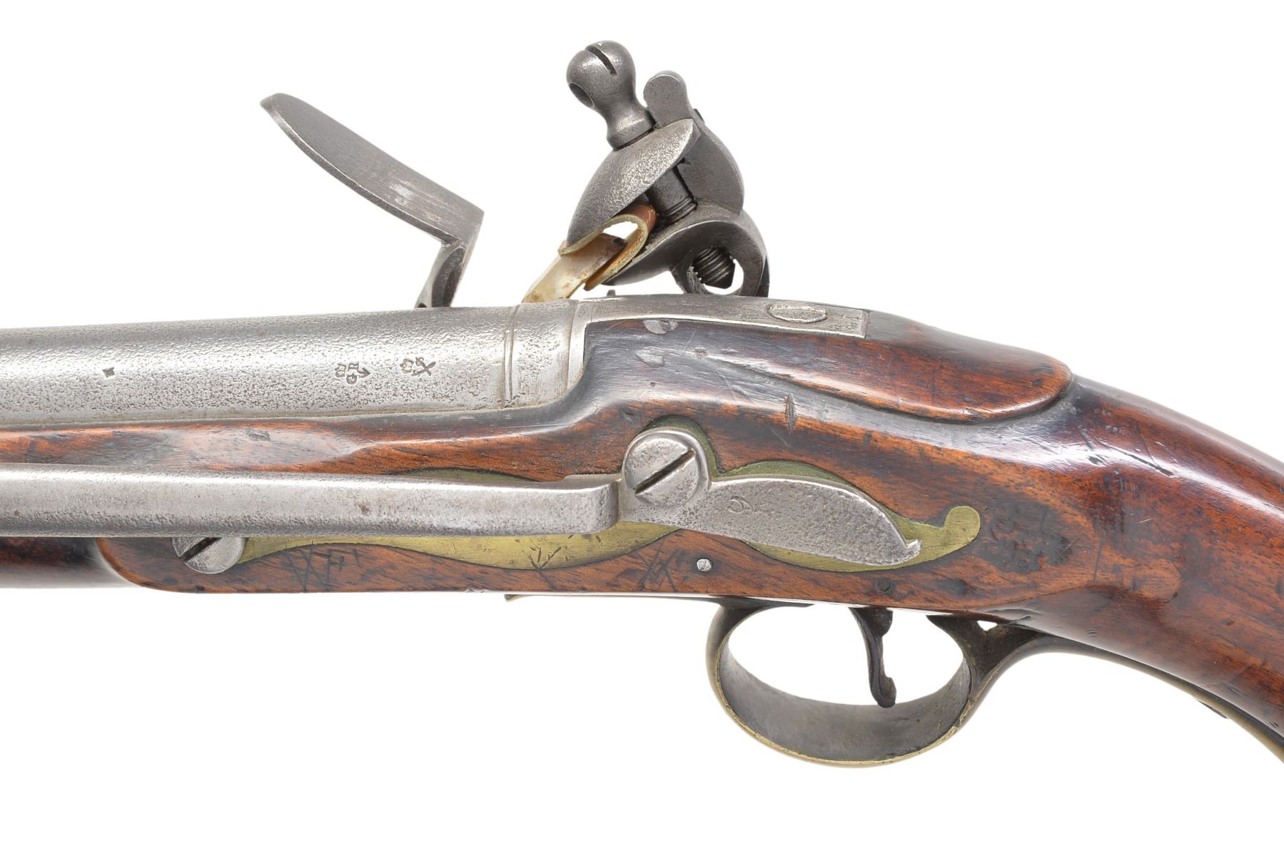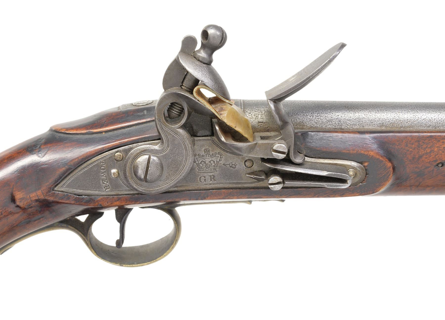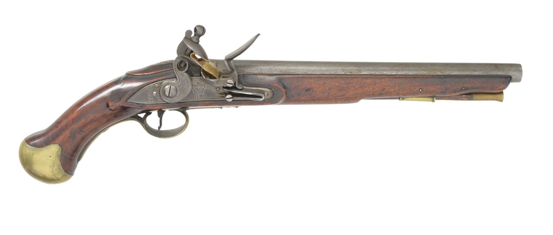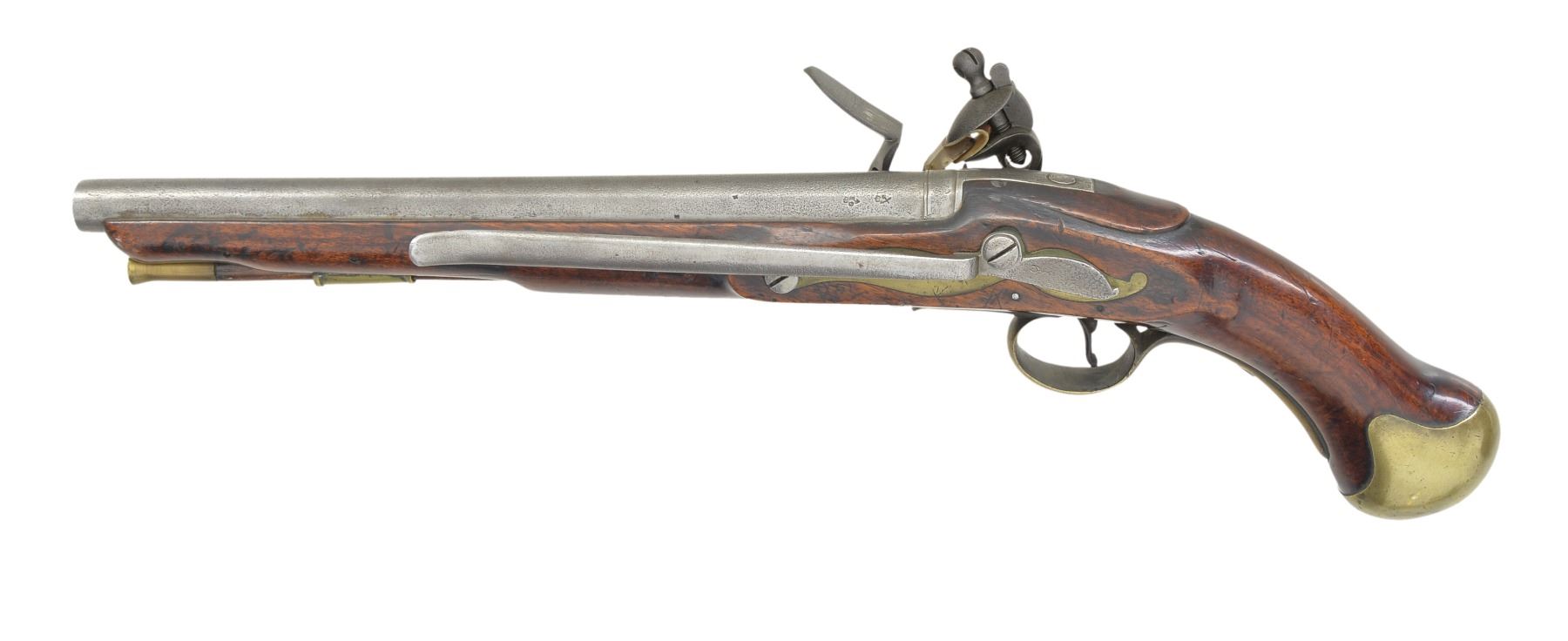 FLINTLOCK PISTOL. Cal. 28 Bore (approx. 55 cal.). NSN. This is among the more elegant patterns of Revolutionary War era military pistols. Long & sleek at 19" overall w/ 12" bbl. having British military proofs on left side of breech. Lock marked w/ crown & "GR" cypher w/ broad arrow proof forward of cock plus "TOWER" rear of cock. Sm. proofs also appear on stock, rear of bbl. tang & base of 8" belt hook. CONDITION: good to very good overall. Appears original & complete. Metal is overall gray patina w/ pitting. Stock is sound & solid, as are brass mts. w/ light mustard patina. Mechanically functional w/ clear smooth bore having pitting. (01-17098/JS). ANTIQUE. $2,000-3,000.