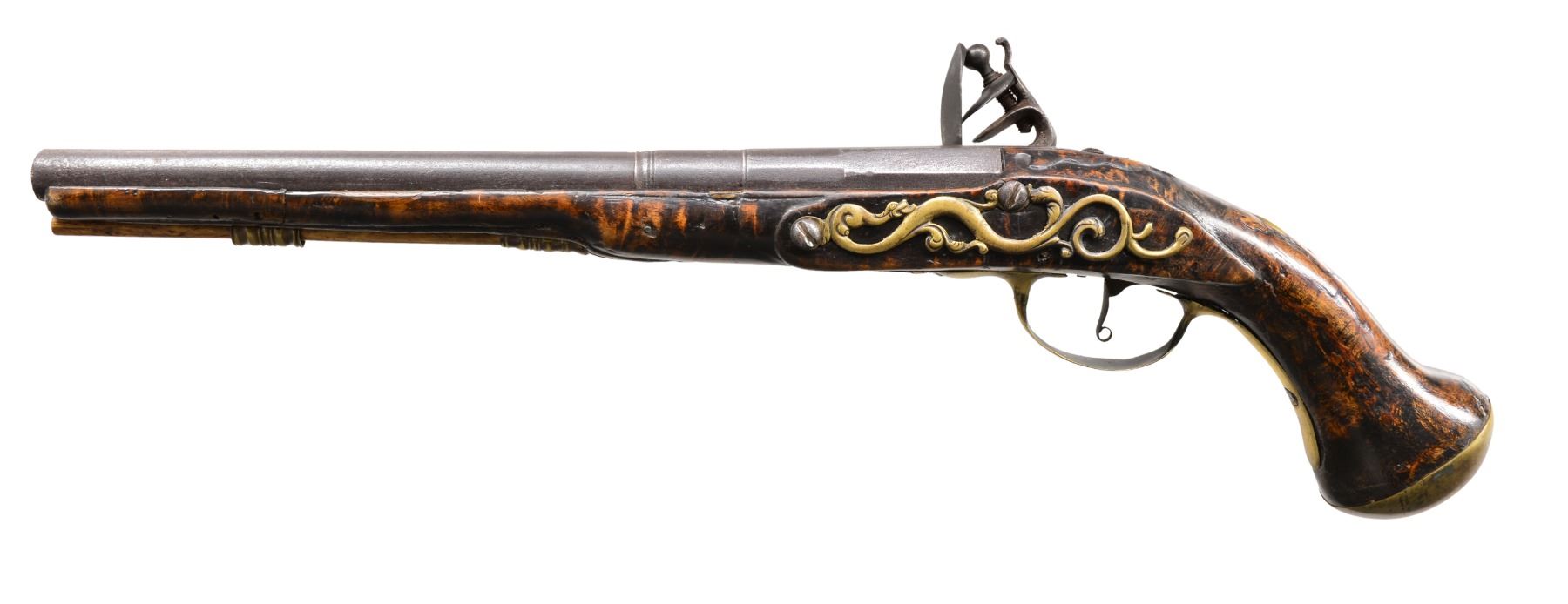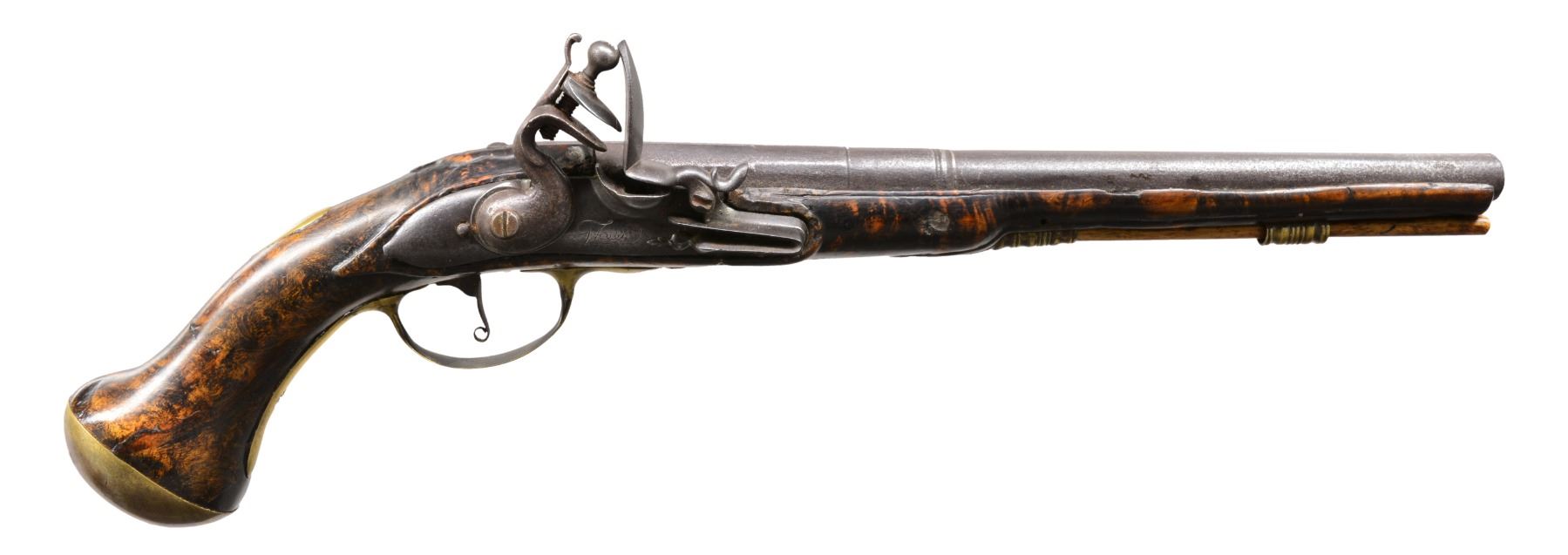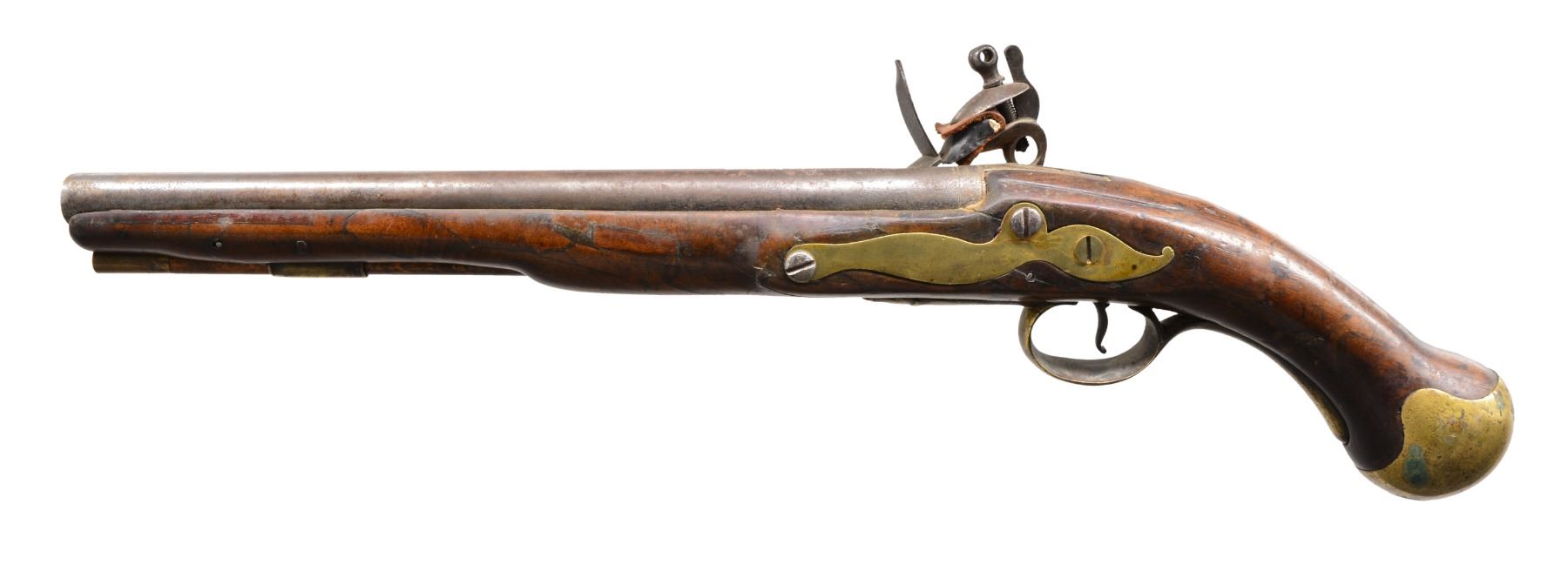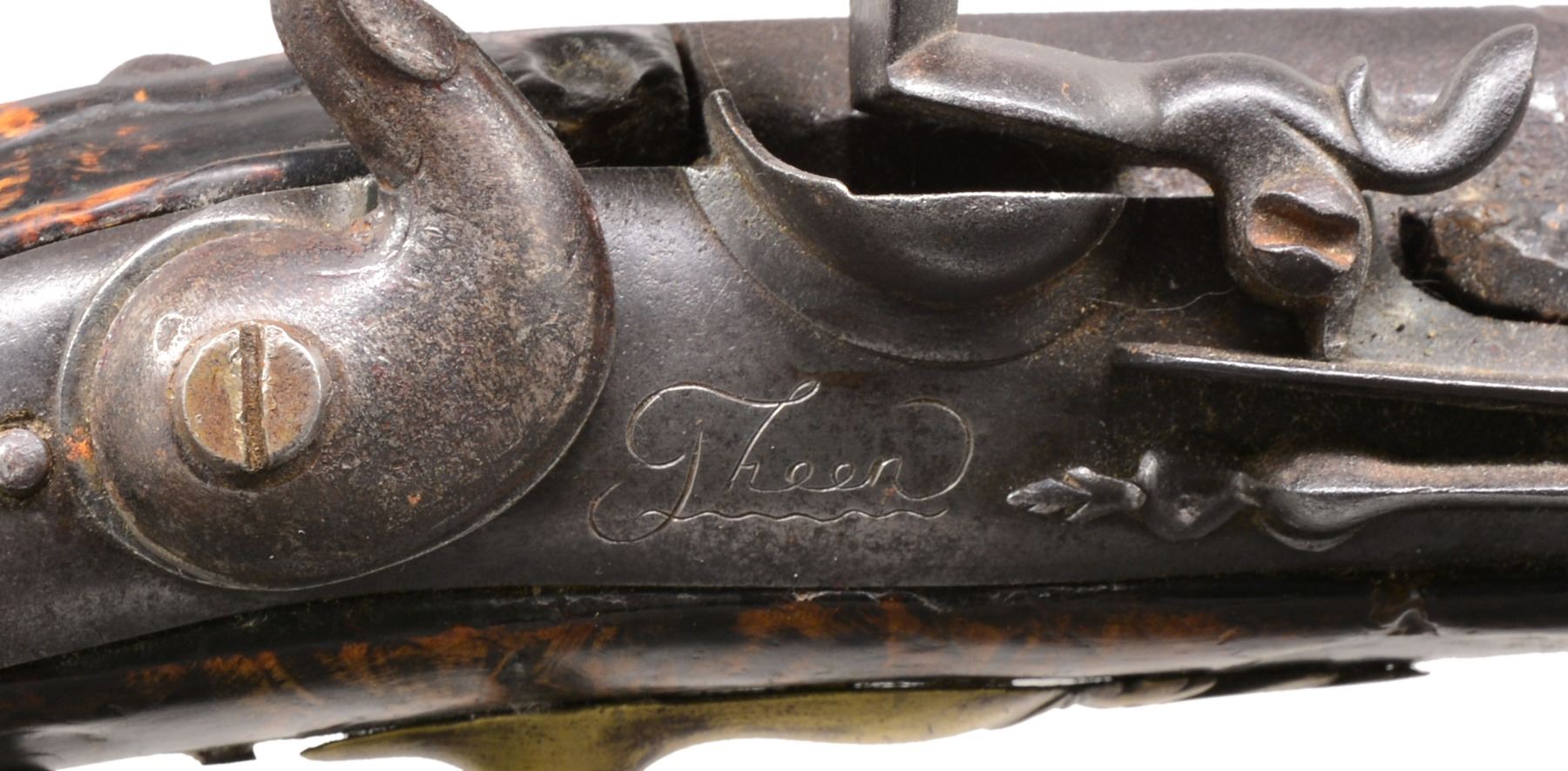 PISTOLS. 1) Cal. 58. NSN. Circa 1740 European flintlock. 18 1/2" Overall. Bbl. 12" oct to rnd. 4 stage. Lock is signed in script below pan "GREEN". Unbridled frizzen w/ high neck serpentine cock. Brass mounted on highly figured stock. Lock escutcheon is pierced w/ intertwined serpents. CONDITION: good overall. Metal is dark gray/brown patina w/ pitting. Top jaw & top jaw screw replaced. Stock has crack repair forward of trigger bow finial beneath lock. Last 4" of forestock has spliced repair. Mechanics are fine w/ pitted smooth bore. (01-17321/JS). 2) GEORGIAN ERA MILITARY STYLE PISTOL. Cal. 56. NSN. 19 1/2" Overall. Bbl. 12" rnd. CONDITION: appears to be a reconversion w/ several crack repairs to stock & several insets forward of lock on right side. "TOWER" marking on tail of lock is light & appears enhanced. There is one remnant of a British proof in stock behind sideplate, no other markings noted. There is a filled hole in sideplate that once held belt hook. Mechanically functional w/ smooth pitted bore. PROVENANCE: Estate Collection of Dan Poppen. (01-17322/JS). BOTH ANTIQUE. $2,000-3,000.