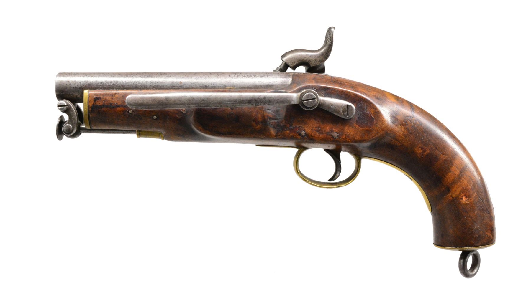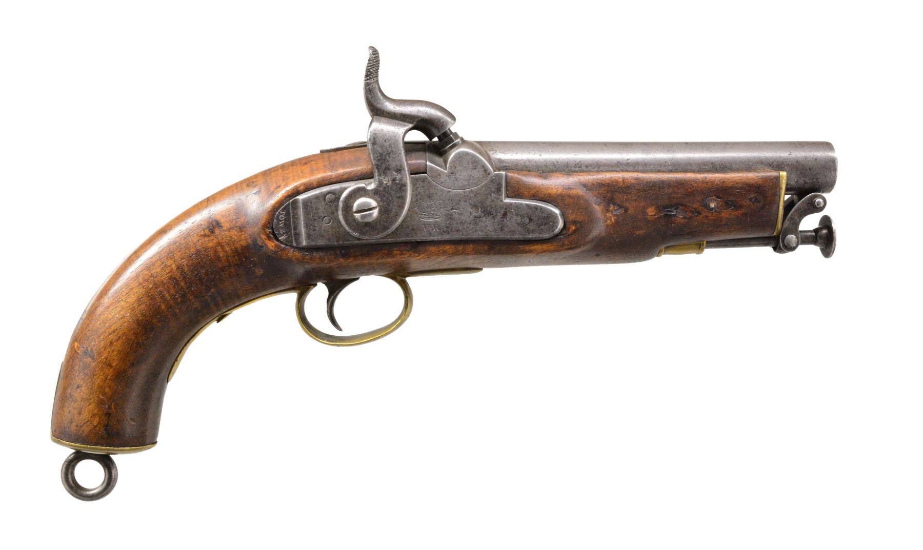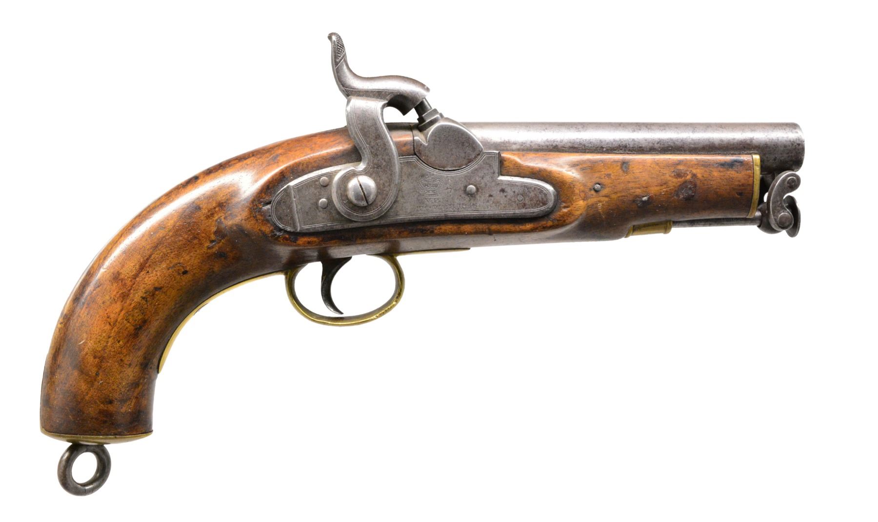 Both cal. about 56. NSN. Bbls. 6" w/ smooth bores. Pin fastened walnut stocks w/ brass fittings having iron lanyard loops at butts. Left sides have iron belt hooks. Button tipped iron swivel ramrods. 1) Breech end of bbl. has crown over "7" proofs w/ broad arrow acceptance marks & crown proofs on left side. Lock forward of hammer has crown "VR / TOWER" & 1846 date. Lock & hammer have dbl. line border engraving. Left side of stock at wrist shows a faint broad arrow over "30" acceptance mark. CONDITION: metal has cleaned gray appearance showing scattered light pitting. Stock has worn appearance w/ dents & handling marks having evidence of repair visible on left flat. Bore is dark w/ areas of pitting close to muzzle. Hammer will not hold in cocked position. 2) Breech end of bbl. has crown over "VR" as well as crown over crossed arrow "5" & "7" proof marks. Belt hook has crown over "X" proof. Lock forward of hammer has crown over "VR" followed by broad arrow acceptance mark. Lower back portion of lock is marked "TOWER". CONDITION: stock shows wear & handling marks w/ chips, cracks & spots of repair in forearm, lock & sideplate areas. Dark lightly pitted bore. (01-17097(2)/DS). ANTIQUE. $800-1,200.
