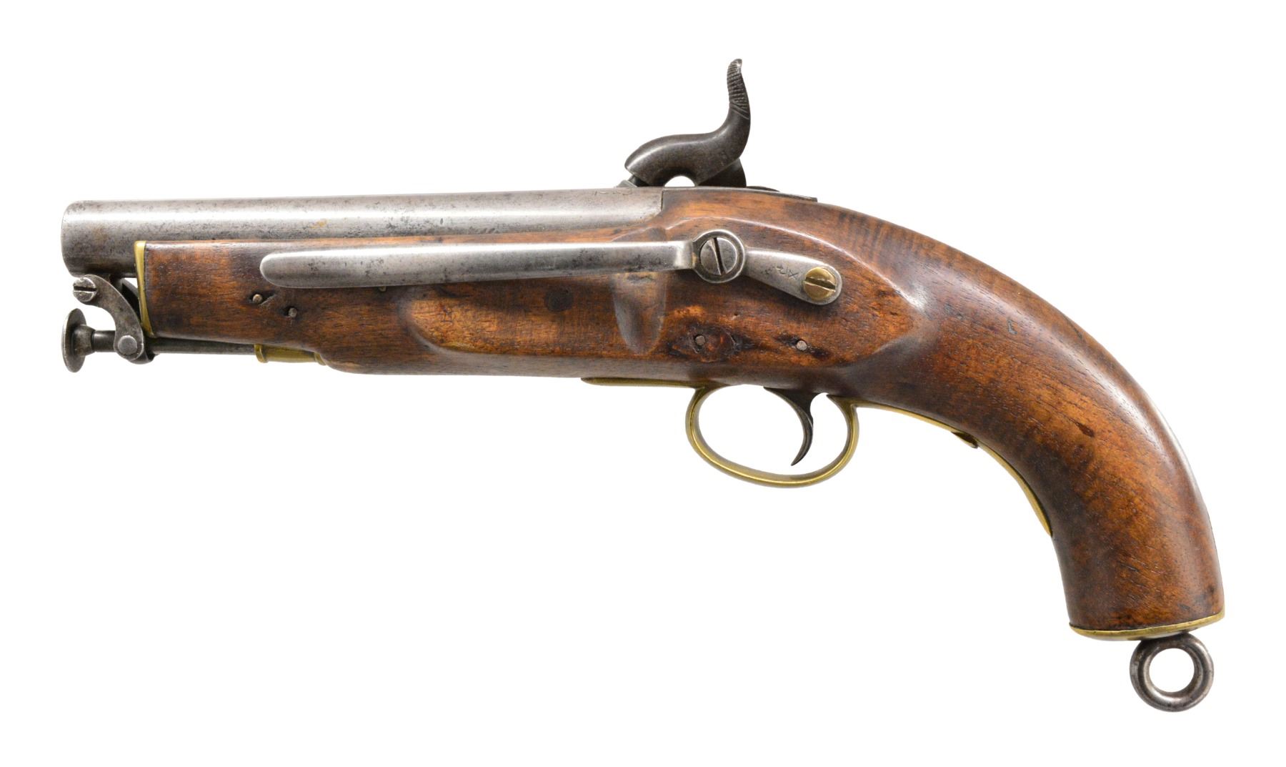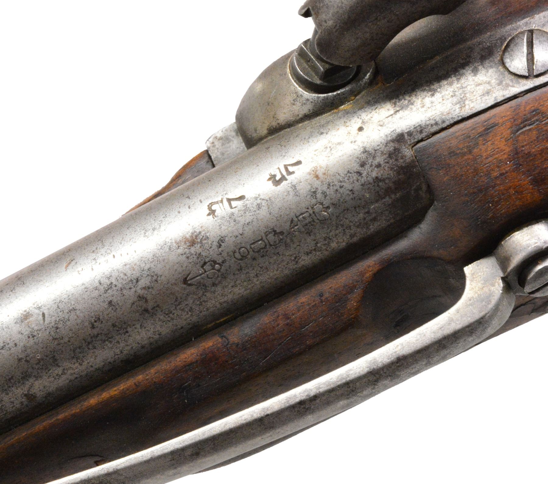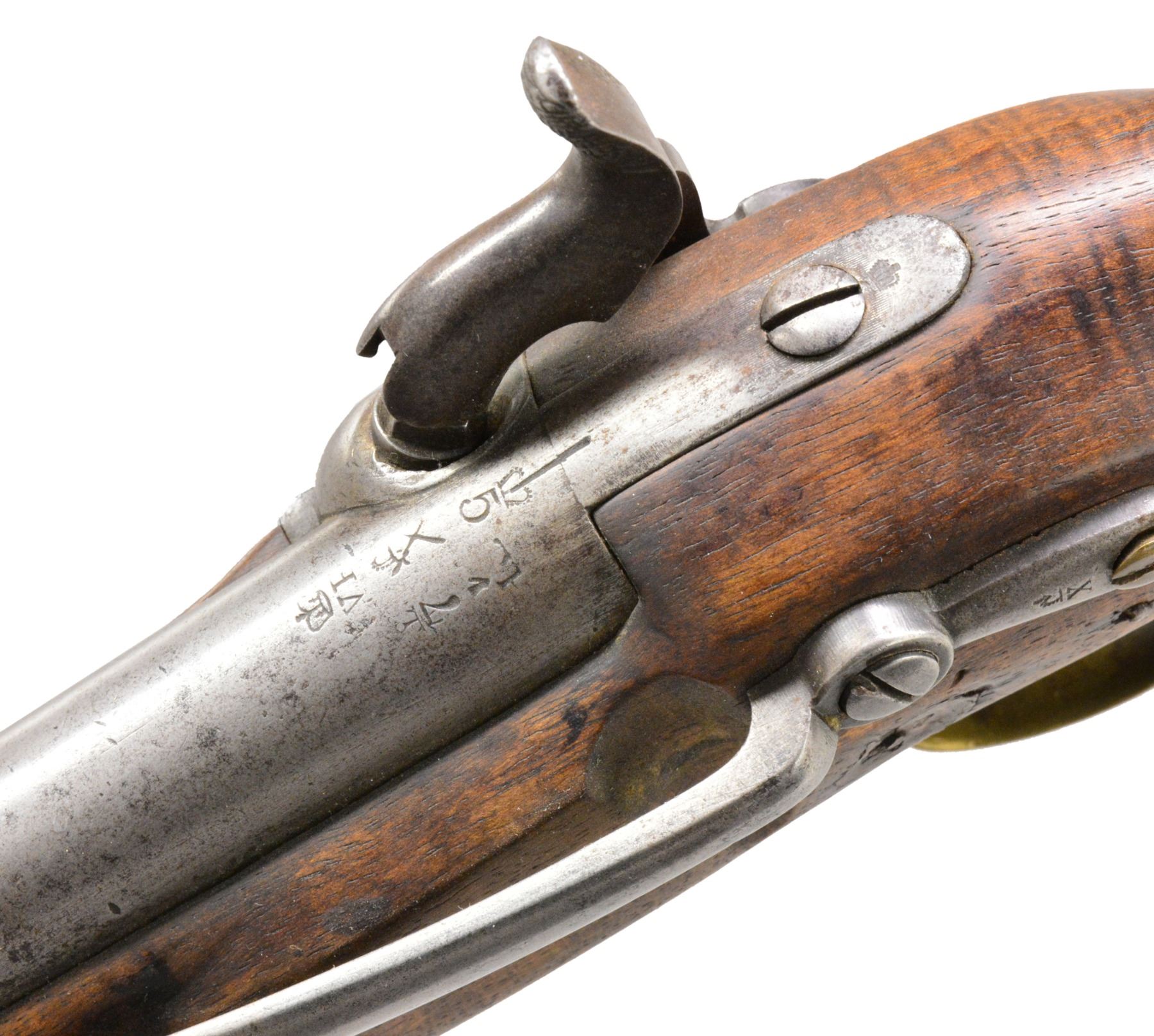 Both cal. about 56. NSN. Bbls. 6" w/ smooth bores. Pin fastened walnut stocks w/ brass fittings having iron lanyard loops at butts. Left sides have iron belt hooks. Button tipped iron swivel ramrods. 1) Breech end of bbl. has crown over "7" proofs w/ broad arrow acceptance marks & crown proofs on left side. Lock forward of hammer has crown "VR / TOWER" & 1846 date. Lock & hammer have dbl. line border engraving. Left side of stock at wrist shows a faint broad arrow over "30" acceptance mark. CONDITION: metal has cleaned gray appearance showing scattered light pitting. Stock has worn appearance w/ dents & handling marks having evidence of repair visible on left flat. Bore is dark w/ areas of pitting close to muzzle. Hammer will not hold in cocked position. 2) Breech end of bbl. has crown over "VR" as well as crown over crossed arrow "5" & "7" proof marks. Belt hook has crown over "X" proof. Lock forward of hammer has crown over "VR" followed by broad arrow acceptance mark. Lower back portion of lock is marked "TOWER". CONDITION: stock shows wear & handling marks w/ chips, cracks & spots of repair in forearm, lock & sideplate areas. Dark lightly pitted bore. (01-17097(2)/DS). ANTIQUE. $800-1,200.
