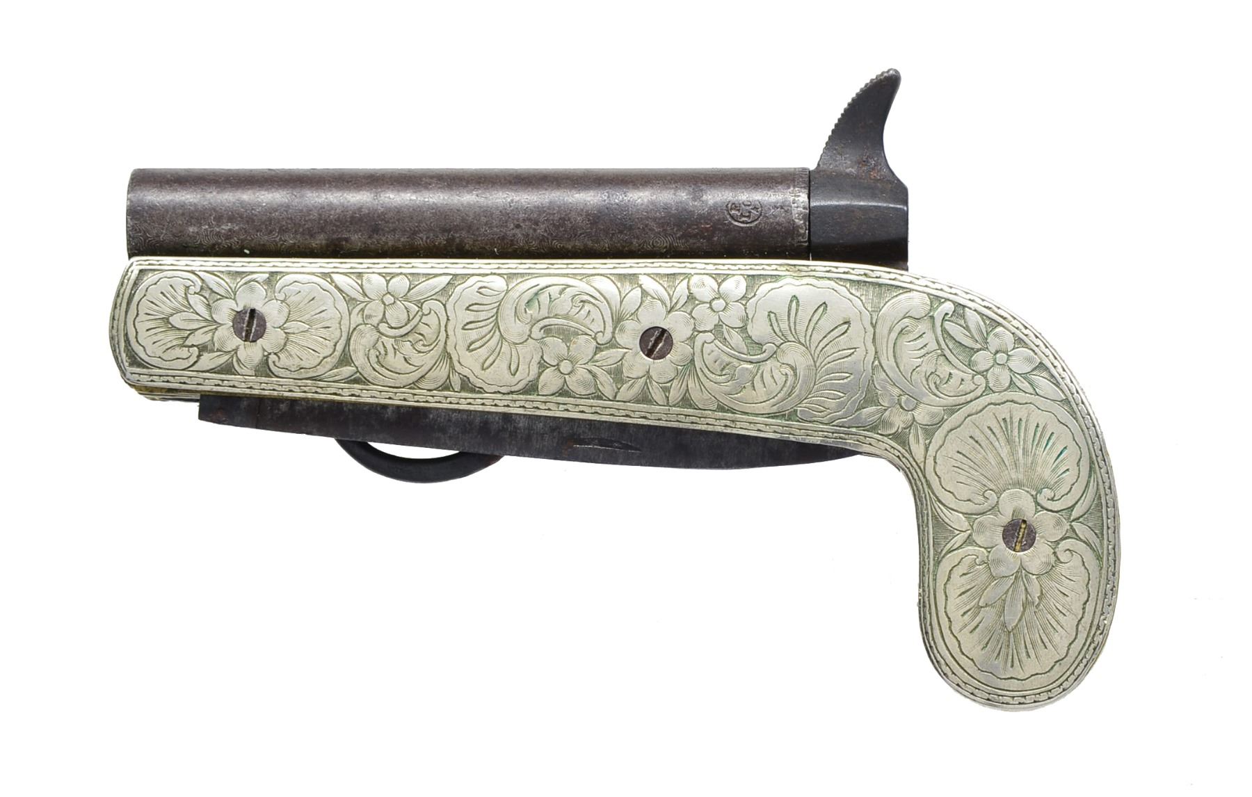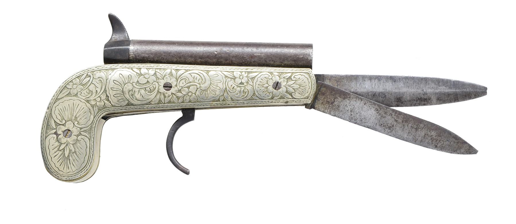 PERCUSSION KNIFE PISTOL. Cal. 37. NSN. This combination self defense weapon is fitted w/ 2 folding 3 1/2” steel blades, 1 dbl. edged for stabbing, the other single edge for cutting, which fold into pistol shaped body. Damascus percussion bbl. is at top. Fired by hammer w/ tall spur. Upon cocking, trigger folds out of its home between knife blades. German silver scales are nicely engraved in floral & foliate pattern w/in rope engraved borders. Belgian proof on left side of bbl. CONDITION: good. Iron & steel parts are mostly brown patina w/ scattered light pitting. German silver attractively toned & w/ light wear. Mechanically good. Tip of dbl. edged blade is missing. (01-17447/MGM137). ANTIQUE. $2,000-3,000.
