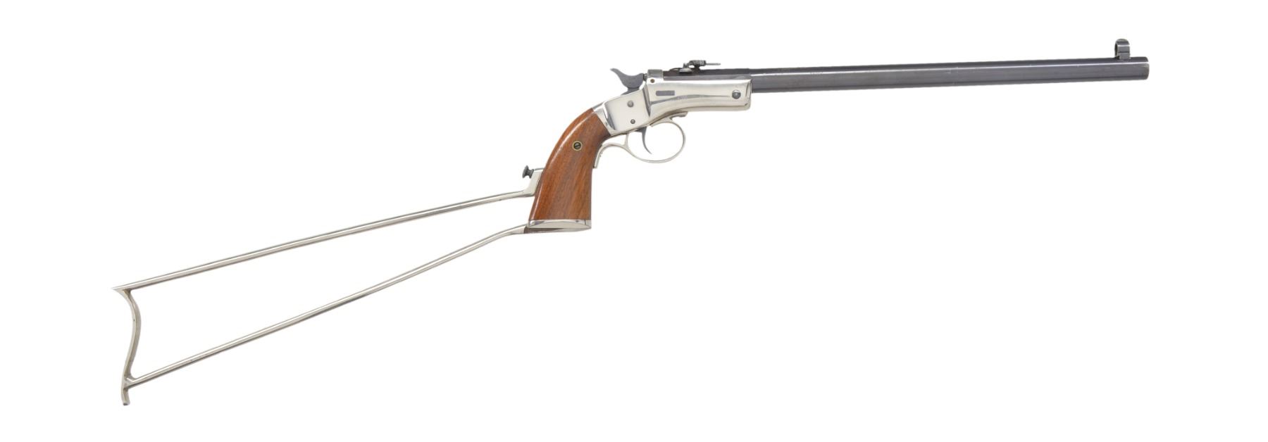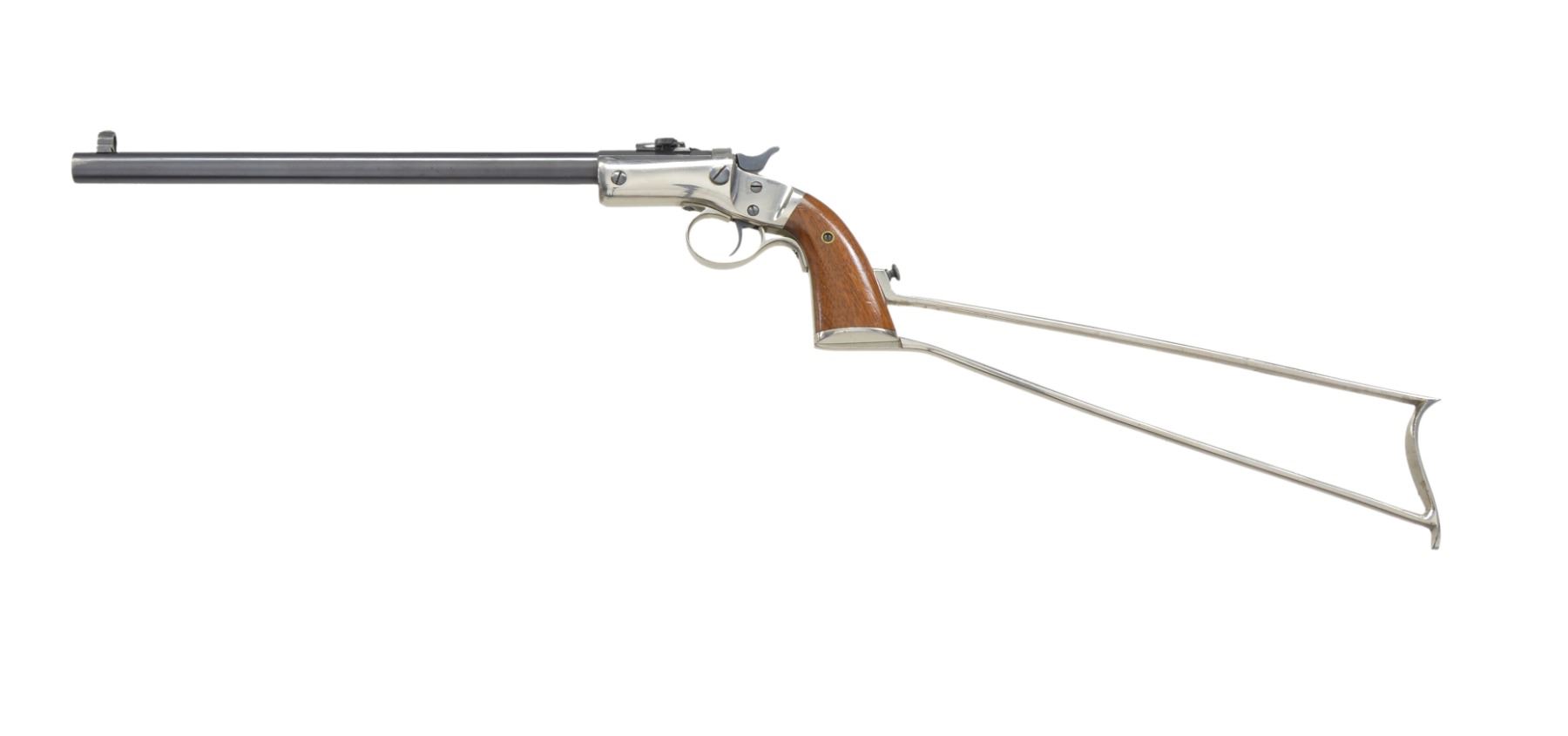 Cal. 22 RF. S# 22343. Bbl. 12" rnd. w/ oct. shank. Combination globe front sight & adj. combination folding leaf rear sight. Blue finish bbl. w/ nickel finished action. Action features cast iron trigger guard, mushroom shaped release button. Linkage operated extractor, non bushed firing pin & butt cap slotted for stock attachment. 2 Piece walnut grips. Estimated production 15,000, 1896-1915. UNATTACHED ACCESSORIES: nickel finished 11 1/2" iron shoulder stock w/ matching S#. CONDITION: over 90% bbl. blue showing light muzzle wear w/ area of loss on top of bbl. Frame & stock retain over 95% nickel w/ bright appearance. Grips have good finish w/ scattered marks. Bore has slightly darkened appearance w/ worn rifling showing scattered spots of pitting. (19-5672/DS). CURIO. $800-1,200.