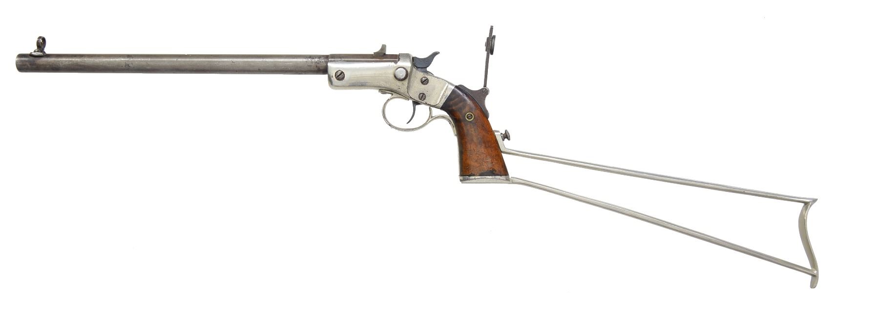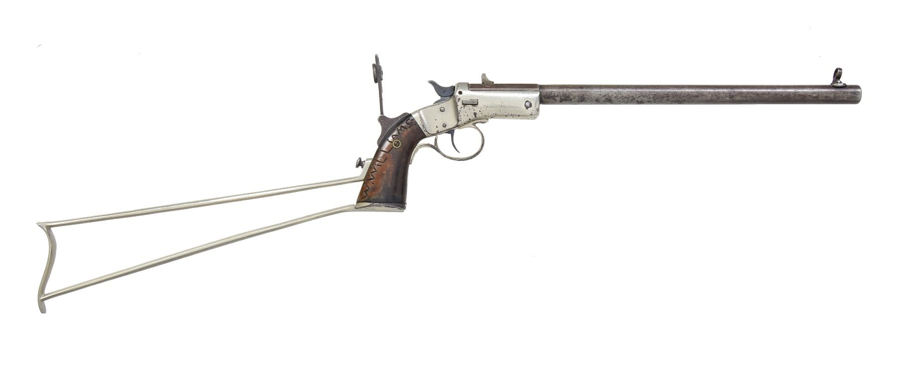 Cal. 22 LR. S# 23735. Bbl. 12" rnd. w/ oct. shank. Combination front sight, fixed V notch replacement rear sight & Vernier peep tang sight. Nickel finished iron frame. 2 Piece walnut grips, right grip has hand carved name "W.WILLIAMS". UNATTACHED ACCESSORIES: non matching nickel finished detachable shoulder stock w/ S# removed. CONDITION: bbl. blue is fading to gray showing spots of corrosion & light pitting. Frame retains 75% nickel showing lg. areas of blistering. Grips have dark worn appearance showing scratches & marks. Shoulder stock retains over 95% nickel. Dark pitted bore w/ worn rifling. (20-1074/DS). CURIO. $900-1,350.