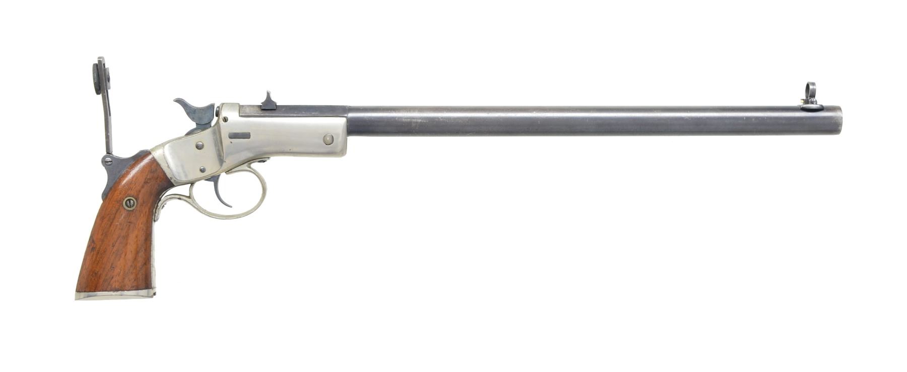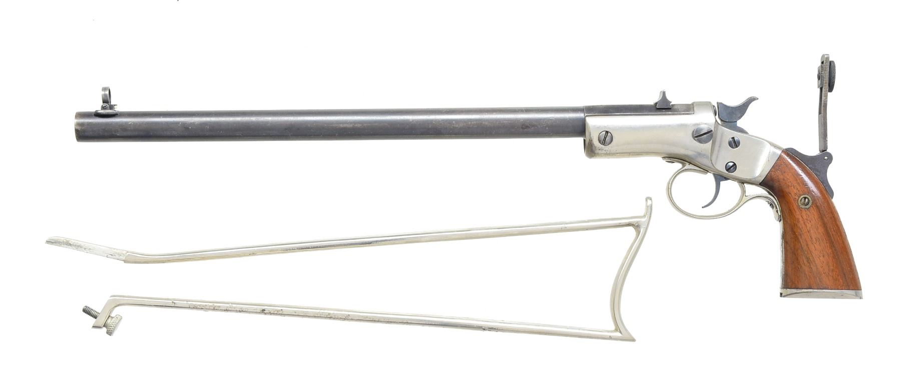 Cal. 22 LR. S# 19706. Bbl. matching numbered 12" w/ standard V notch sight at rear & Beech Combination front. Mfg. 1896-1915 (approx. 2,500 units) w/ scarce factory supplied vernier tang sight. Skeleton stock assembly numbered 17762. Nickel plated frame & stock having blued bbl. & walnut grips. CONDITION: good plus overall appearance w/ flaking of nickel in grip area. Thinning bluing & slight peppery oxidation at muzzle. Slight bend to tang of vernier sight. Very good front sight. Light handling marks on grips. Stock fits well in dovetail but attachment screw aspect needs attention. Slight bubbling of finish w/ loss near grip at top. Good bore w/ slight traces of faint pitting. (20-757/NW). CURIO. $550-800.