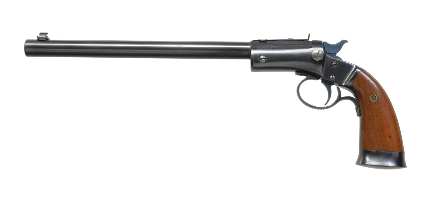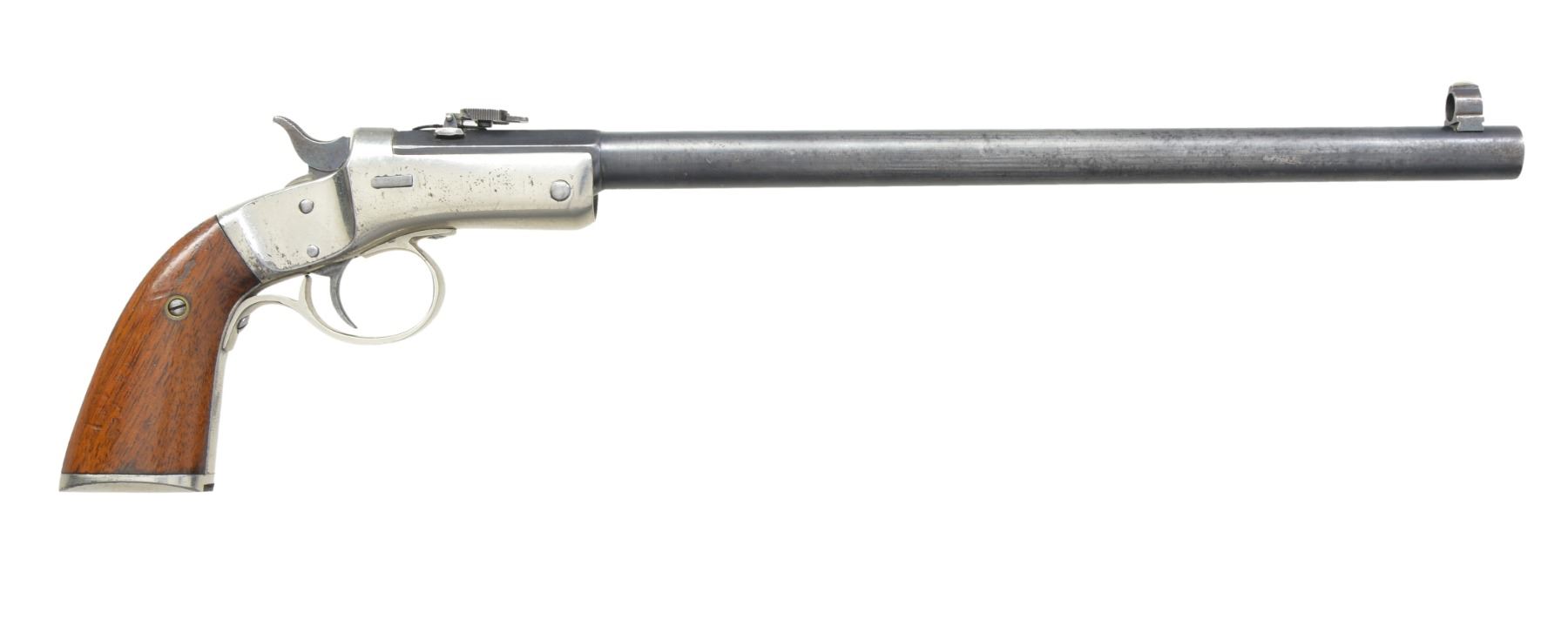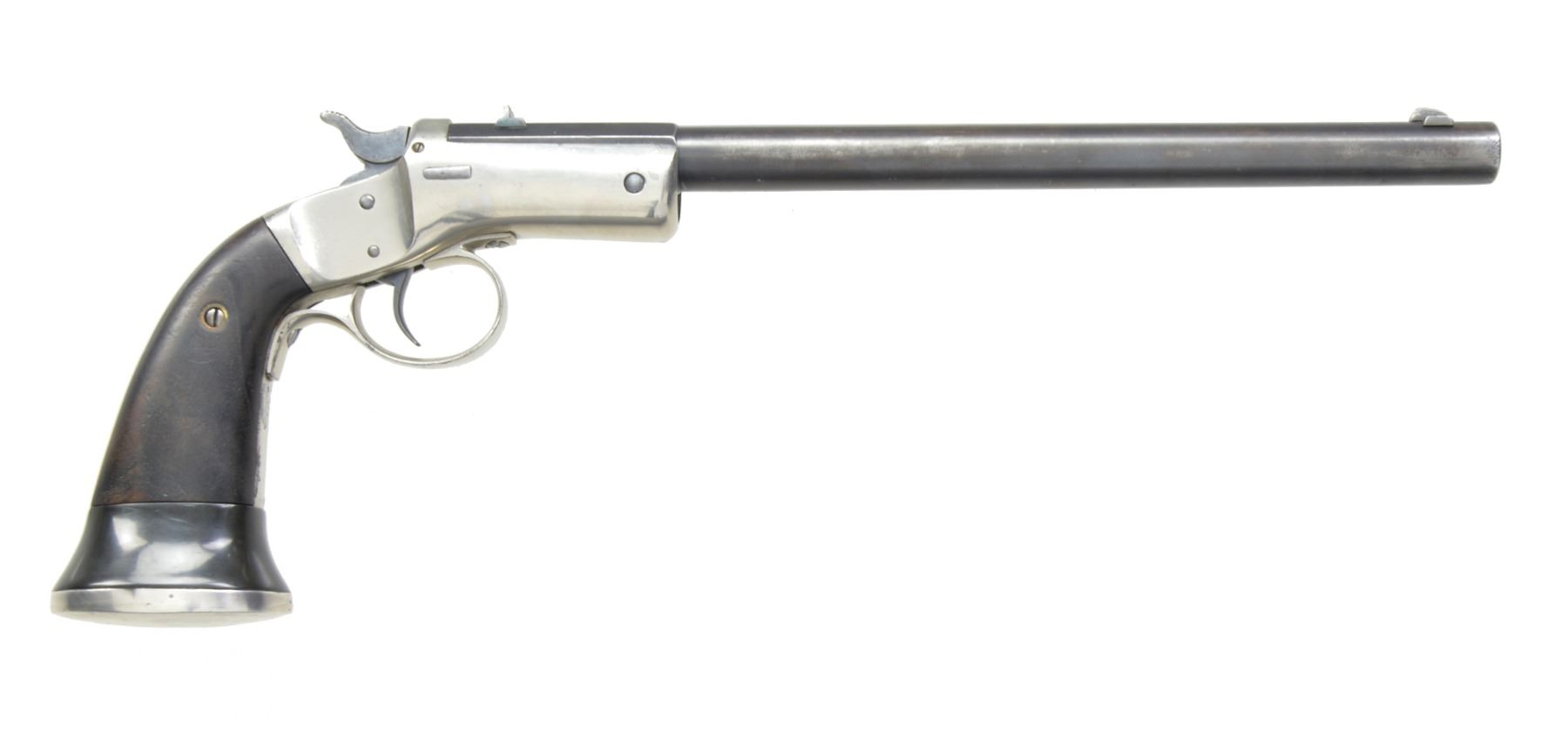 1) J STEVENS OFFHAND NO. 35 SINGLE SHOT PISTOL. Cal. 22 LR. S# 25748. Bbl. 10". Mfg. 1923-1942. Fixed dovetailed sights; silver blade front & notched rear. Matching numbered bbl. Flared Gutta Percha grip extension w/ silver plated cap rather than usual metal extension. Nickel plated iron frame having firing pin installed w/out bushing plus backstrap drilled & tapped for stock attachment. Blued sm. parts & bbl. Smooth rosewood grips. CONDITION: good overall appearance w/ wear & cleaned areas of bbl. Light marks & spotty peeling of nickel finish; very noticeable on backstrap & under trigger guard of front strap. Light marks & dull appearance of silver cap. Light marks on grips appearing void of finish. Fair to good bore w/ wear & even frosting. (19-5497/NW). 2) J STEVENS OFFHAND TARGET NO. 35 SINGLE SHOT PISTOL. Cal. 22 LR. S# 55045. Bbl. 10". Mfg. 1907-1916 in uncommon blued finish having weighted metal grip extension. Matching numbered bbl. & walnut grips. Elevation adj. rear sight & dovetail bead front. Niter blued trigger & hammer. CONDITION: very good plus original finish w/ occasional sm. spots of oxidation plus cleaned muzzle face. Breech end of bbl. & bore are near excellent as is original finish of grips. Bright Niter blue. Very fine example of collector quality. (19-5499/NW). 3) STEVENS NEW MODEL POCKET RIFLE No. 40 PISTOL. Cal. 22 LR. S# 16314. Bbl. 12" blued w/ combination front sight & flip up sliding rear. Firing pin retained in frame by bushing. Nickel plated iron frame w/ walnut grips having matching numbered cap dovetailed for attachment of shoulder stock (also utilizes drilled & tapped hole in backstrap). Matching numbers on grip cap, bbl., left side of frame under grip & on butt under cap. CONDITION: good general appearance w/ flaking nickel, cleaned bbl. oxidation & light marks. Good plus grips w/ light marks. Fair worn & even light pitting of bore. Tight action. (19-5500/NW). ALL CURIO. $800-1,200.