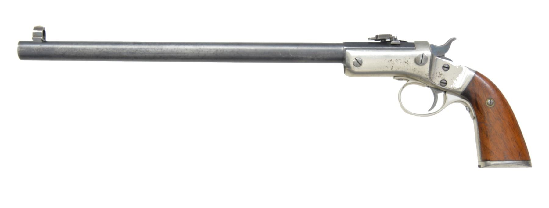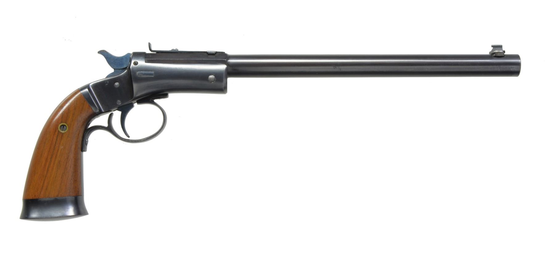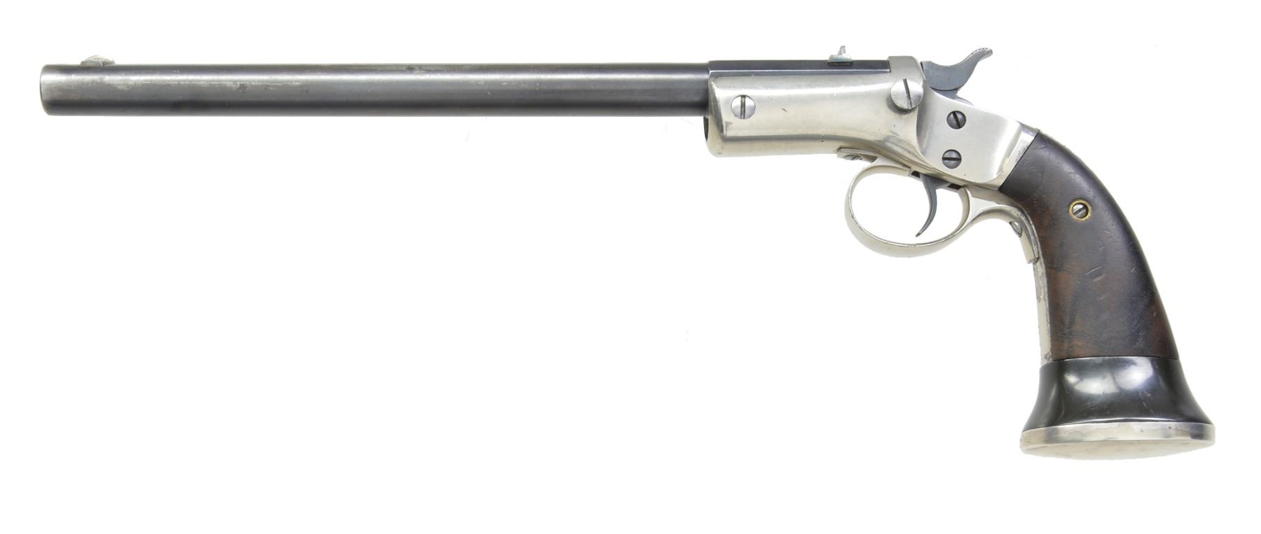 1) J STEVENS OFFHAND NO. 35 SINGLE SHOT PISTOL. Cal. 22 LR. S# 25748. Bbl. 10". Mfg. 1923-1942. Fixed dovetailed sights; silver blade front & notched rear. Matching numbered bbl. Flared Gutta Percha grip extension w/ silver plated cap rather than usual metal extension. Nickel plated iron frame having firing pin installed w/out bushing plus backstrap drilled & tapped for stock attachment. Blued sm. parts & bbl. Smooth rosewood grips. CONDITION: good overall appearance w/ wear & cleaned areas of bbl. Light marks & spotty peeling of nickel finish; very noticeable on backstrap & under trigger guard of front strap. Light marks & dull appearance of silver cap. Light marks on grips appearing void of finish. Fair to good bore w/ wear & even frosting. (19-5497/NW). 2) J STEVENS OFFHAND TARGET NO. 35 SINGLE SHOT PISTOL. Cal. 22 LR. S# 55045. Bbl. 10". Mfg. 1907-1916 in uncommon blued finish having weighted metal grip extension. Matching numbered bbl. & walnut grips. Elevation adj. rear sight & dovetail bead front. Niter blued trigger & hammer. CONDITION: very good plus original finish w/ occasional sm. spots of oxidation plus cleaned muzzle face. Breech end of bbl. & bore are near excellent as is original finish of grips. Bright Niter blue. Very fine example of collector quality. (19-5499/NW). 3) STEVENS NEW MODEL POCKET RIFLE No. 40 PISTOL. Cal. 22 LR. S# 16314. Bbl. 12" blued w/ combination front sight & flip up sliding rear. Firing pin retained in frame by bushing. Nickel plated iron frame w/ walnut grips having matching numbered cap dovetailed for attachment of shoulder stock (also utilizes drilled & tapped hole in backstrap). Matching numbers on grip cap, bbl., left side of frame under grip & on butt under cap. CONDITION: good general appearance w/ flaking nickel, cleaned bbl. oxidation & light marks. Good plus grips w/ light marks. Fair worn & even light pitting of bore. Tight action. (19-5500/NW). ALL CURIO. $800-1,200.
