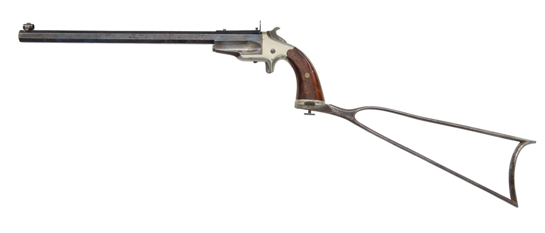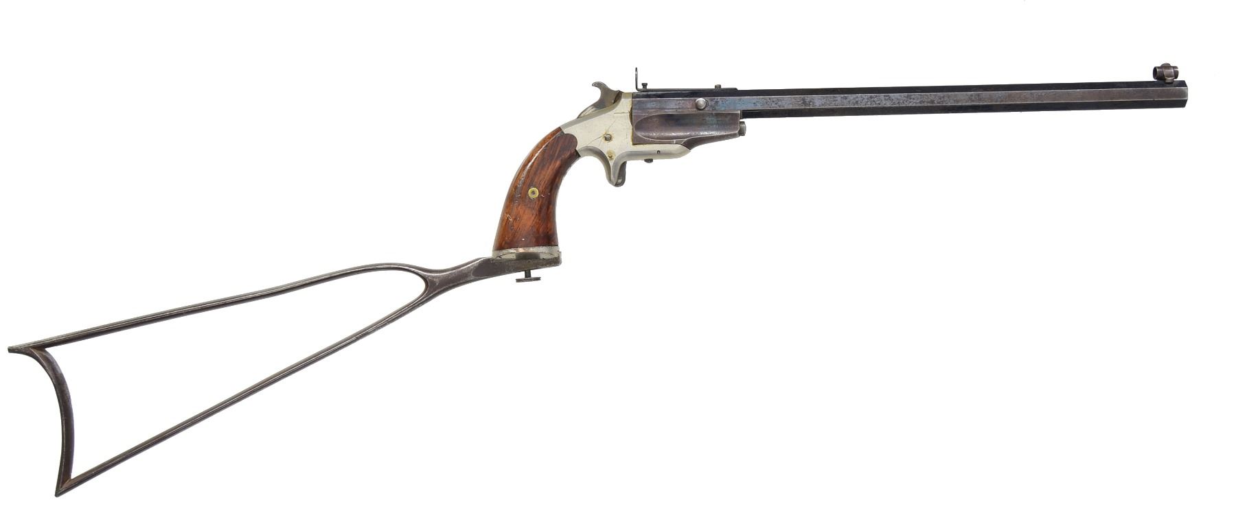 Cal. 32 RF. S# 369. Bbl. 12" oct. w/ combination front sight & elevation adj. peep rear sight. Nickel finished frame w/ spur trigger. 2 Piece walnut grips. Estimated production of 5,000 mfg. 1870-1893. UNATTACHED ACCESSORIES: nickel finished detachable iron shoulder stock having mismatched S# "1090". CONDITION: bbl. retains 60% blue w/ blending w/ spots of finish loss & corrosion. Frame retains 80% nickel showing sm. scratches & spots of finish loss w/ series of dents at butt. Shoulder stock retains a sm. amount of nickel finish. Grips have lightly worn finish showing numerous dents & scratches. Bore is generally bright w/ sound rifling showing some light pitting. Front sight missing internal post. Mechanically sound. (01-17619/DS). ANTIQUE. $800-1,200.