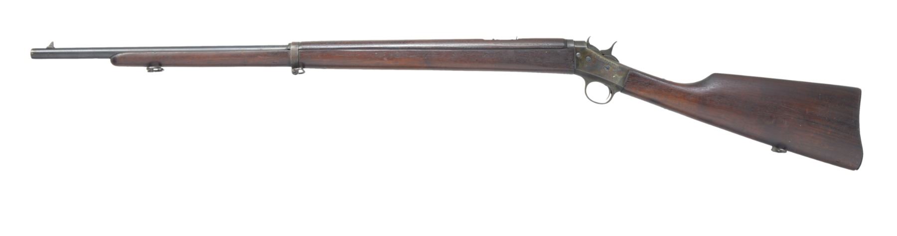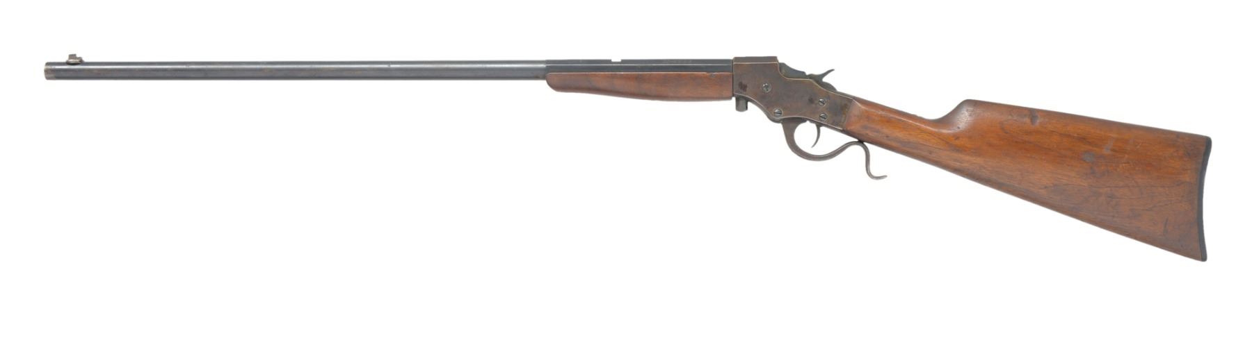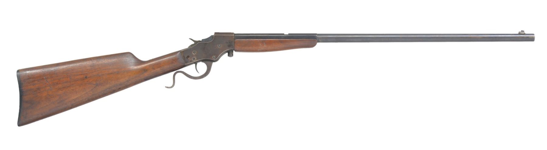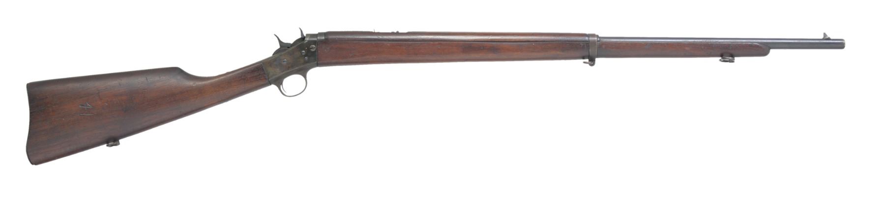 1) STEVENS FAVORITE RIFLE. Cal. 25 Stevens RF. S# J795. Bbl. 24" oct. to rnd. Dovetail mounted front sight w/ broken bead, rear sight is removed. Single shot falling block action. Walnut forearm & straight grip stock w/ dished checkered hard rubber buttplate. CONDITION: 70% dull faded bbl. blue. Action finish is fading to mottled patina showing spots of corrosion. Wood has worn finish w/ dents, gouges & handling marks. Stock has crack extending from lower tang. Bore retains moderately worn rifling. (19-5819/DS). 2) REMINGTON NO.4S MILITARY MODEL ROLLING BLOCK. Cal. 22 S & L. S# 4289. Bbl. 28" rnd. Case colored rolling block action. Left side is marked "MILITARY MODEL". Musket length band fastened walnut forearm & straight grip walnut stock having steel buttplate along w/ sling & stacking swivels. Right side of stock has hand cut numbers "41". Mfg. 1913-1923. CONDITION: exposed part of bbl. retains 90% dull lightly faded blue showing spots of freckling. Action has dark lightly faded case colors showing spots of finish loss. Stock has dark original finish showing scattered dents, scratches & marks. Bore is generally bright w/ lightly worn rifling & spots of pitting near muzzle. (19-5820/DS). BOTH CURIO. $600-900.