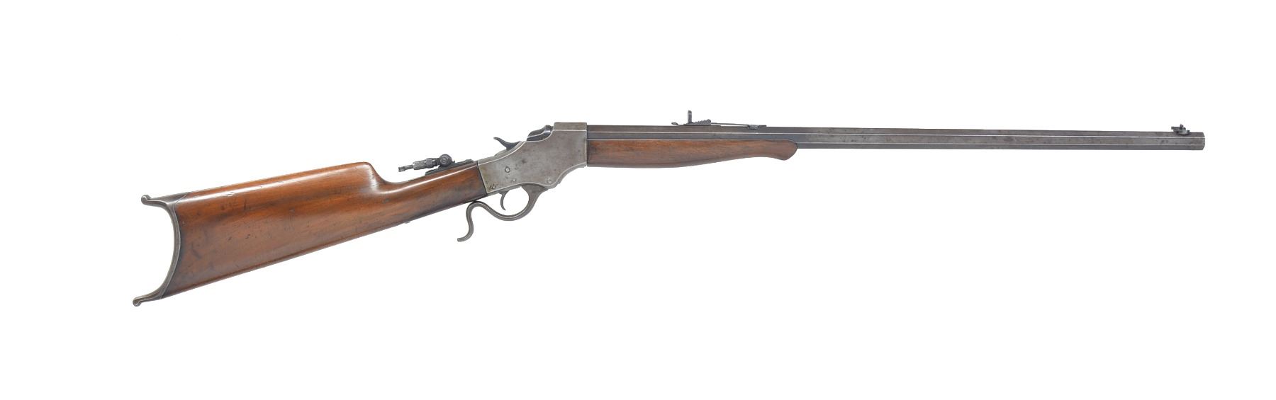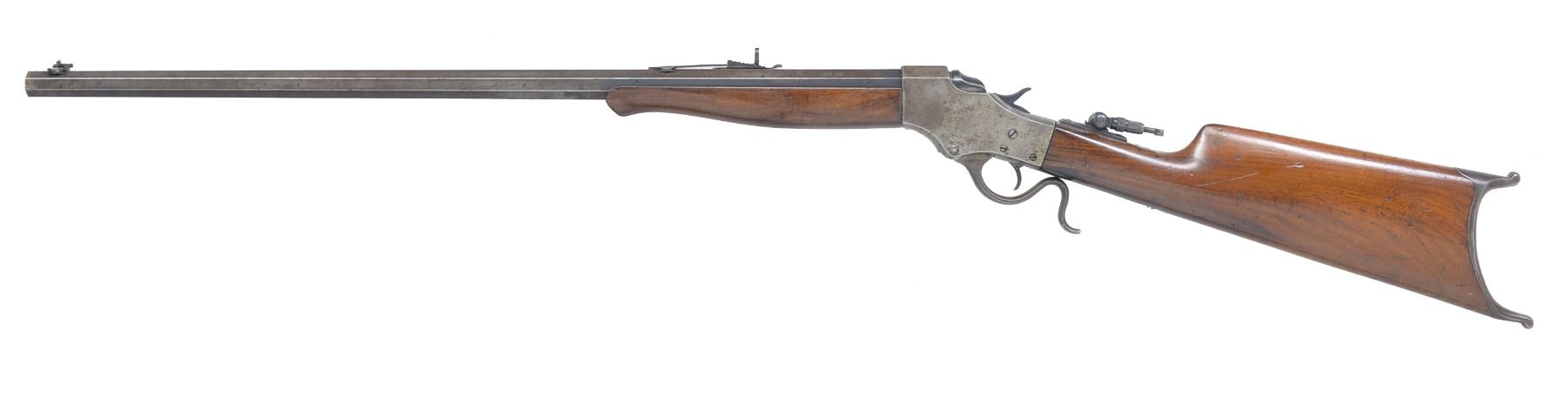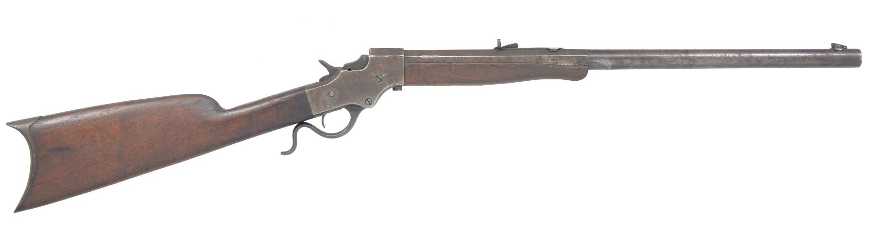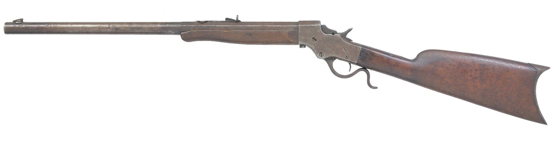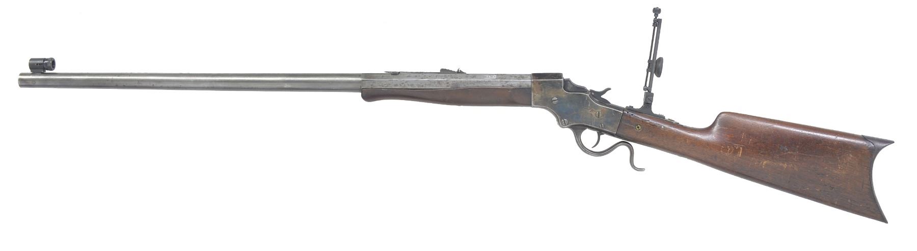 1) NO. 44 1/2 IDEAL. Cal. 25-25 Stevens. S# 721. Bbl. 26" oct. Combination front sight, Marbles sporting rear sight & Marbles combination tang sight. Case colored action. Schnabel tipped forearm & straight grip walnut stock w/ steel Schuetzen buttplate. CONDITION: bbl. retains 30% dull blue fading to brown showings spots of corrosion. Action finish has faded to gray showing scattered light corrosion. Wood has worn finish showing numerous scratches, dents & handling marks. Dark pitted bore w/ partially intact rifling. (20-1103/DS). 2) NO. 44 IDEAL. Cal. 25-20 Single Shot. S# 45741. Bbl. 21 1/2" oct. to rnd. German silver blade front sight w/ sporting rear sight. Right side of action is stamped w/ several letters that appear to include "M", "E" & "P". Walnut forearm & straight grip stock w/ crescent steel buttplate. CONDITION: metal finish has faded to mottled patina showing pitting w/ several areas of dents on bbl. & receiver. Forearm has dark worn appearance w/ handing marks & gouges missing chip near tip. Stock has dark worn appearance showing dents & handling marks. Stock is reshaped in the comb area w/ cracks & chips around top tang. Bore has darkened appearance w/ worn rifling. (20-1109/DS). 3) NO. 44 IDEAL. Cal. rebored to 32-20 & remarked. S# 6244. Bbl. 26" oct. to rnd. Modern globe front sight w/ sporting rear sight & modern mid-range Vernier tang sight. Schnabel tipped walnut forearm & straight grip stock w/ crescent steel buttplate. CONDITION: bbl. has clean gray appearance w/ scattered pitting & corrosion. Action finish retains dull blue finish showing surface corrosion. Forearm is worn w/ handling marks missing chips along both sides of bbl. Stock has dark worn appearance w/ cracks, chips & extra holes around action & both tangs. Wrist has a brass bolt repair. Tang screws are brass replacements. Rebored bbl. is bright w/ strong riling, muzzle end has a dished target crown. (20-1143/DS). ALL CURIO. $700-1,000.