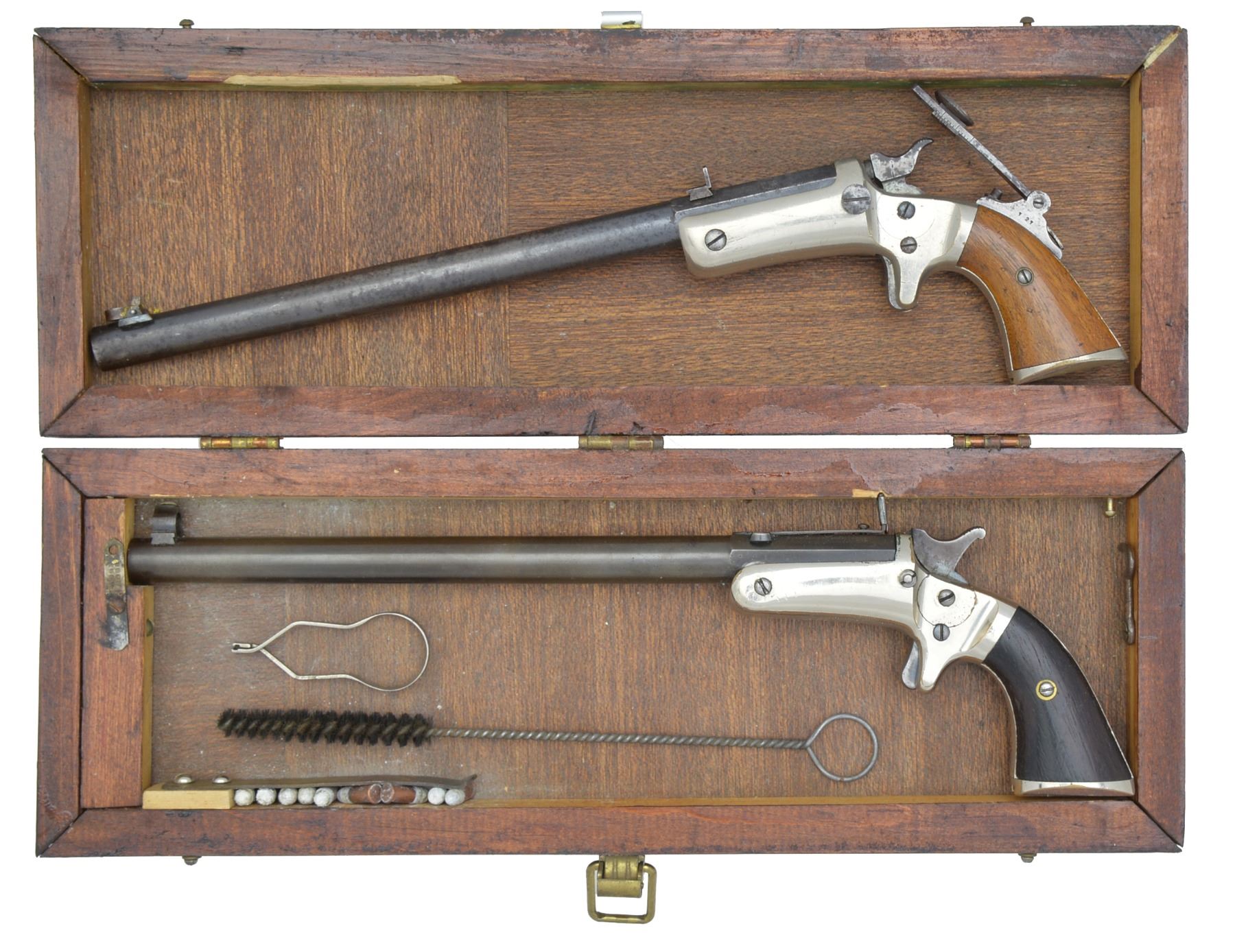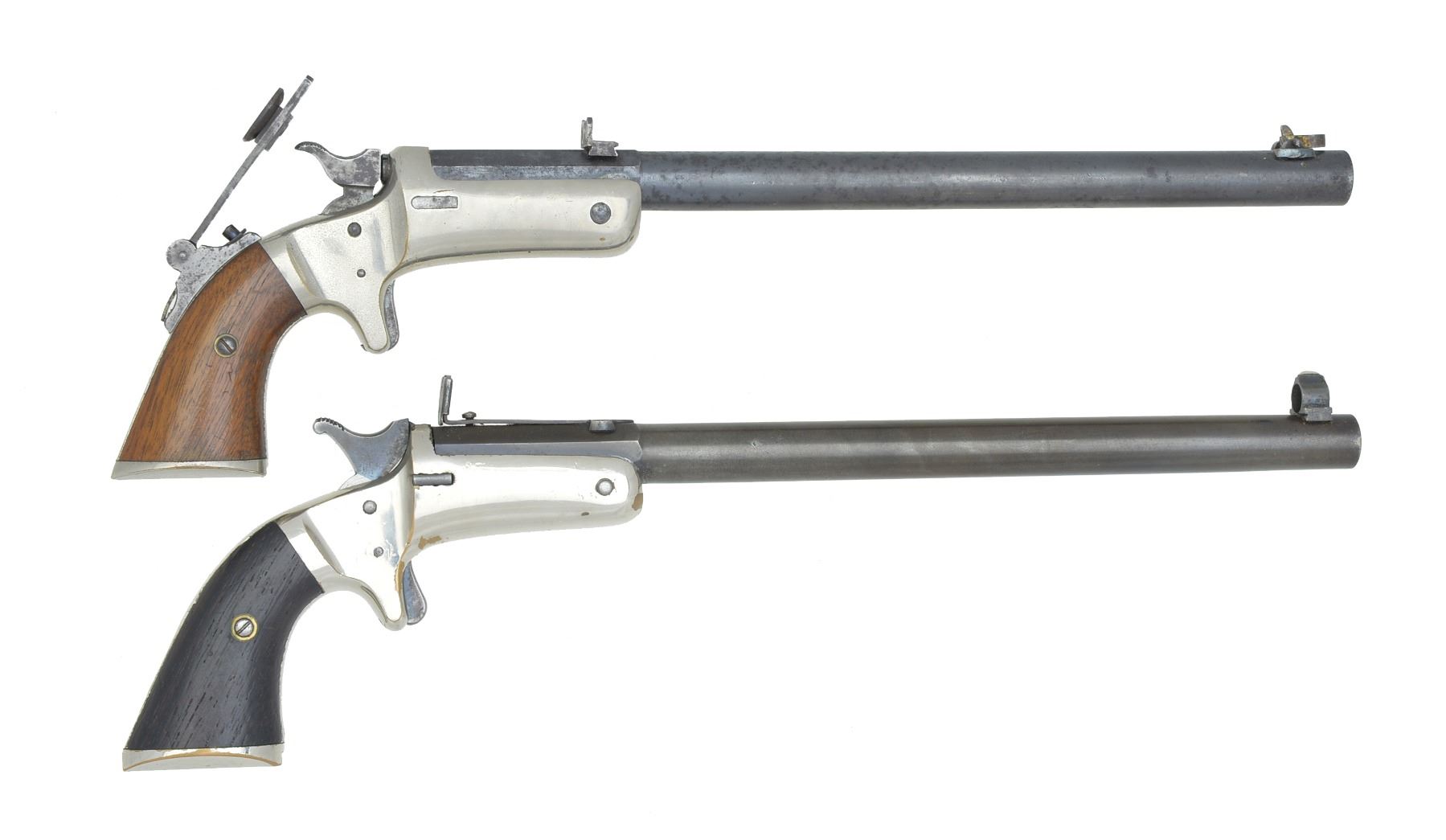 BOTH: cal. 22 RF. 1) VERNIER. S# 11727. Bbl. 10" w/ oct. shank. Globe front sight w/ globe finished ring, fixed V notch rear sight & Vernier sight on rear grip strap. Nickel finished medium frame w/ sideplate, spur trigger, bushed firing pin, mushroom shaped release button & linkage operated extractor. 2 Piece walnut grips. Butt of frame is cut for shoulder stock attachment, stock is not present. Frame, bbl. & vernier sight have matching numbers. Estimated production of 1,500 (1884-1886). CONDITION: 90% nickel showing light marks & spots of freckling. Bbl. retains 60% dull faded blue showing dark spots & light pitting. Grips show finish wear w/ scattered handling marks. Bore is dark w/ worn rifling & light pitting. (01-17015/DS). 2) FIRST ISSUE. S# 1424. Bbl. 10" rnd. w/ oct. shank & blue finish. Bbl. has non matching number "2459". Combination globe front sight w/ elevation adj. rear peep sight. Medium weight frame w/ nickel finish, sideplate, spur trigger, straight style release button, firing pin on hammer & spring operated extractor. 2 Piece rosewood grips. Butt is cut for shoulder stock attachment, stock is not present. Estimated production 8,000, (1872-1875). UNATTACHED ACCESSORIES: home made wooden storage box containing cleaning brush & 11 rds. early copper cased 22 Short ammo. CONDITION: frame retains 90% nickel showing sm. dents & scratches. Bbl. retains 80% dull lightly faded blue. Grips have dark worn appearance w/ handling marks. Extractor is non functioning replacement. Dark pitted bore w/ traces of rifling remaining. (01-17046/DS). BOTH ANTIQUE. $700-1,000.