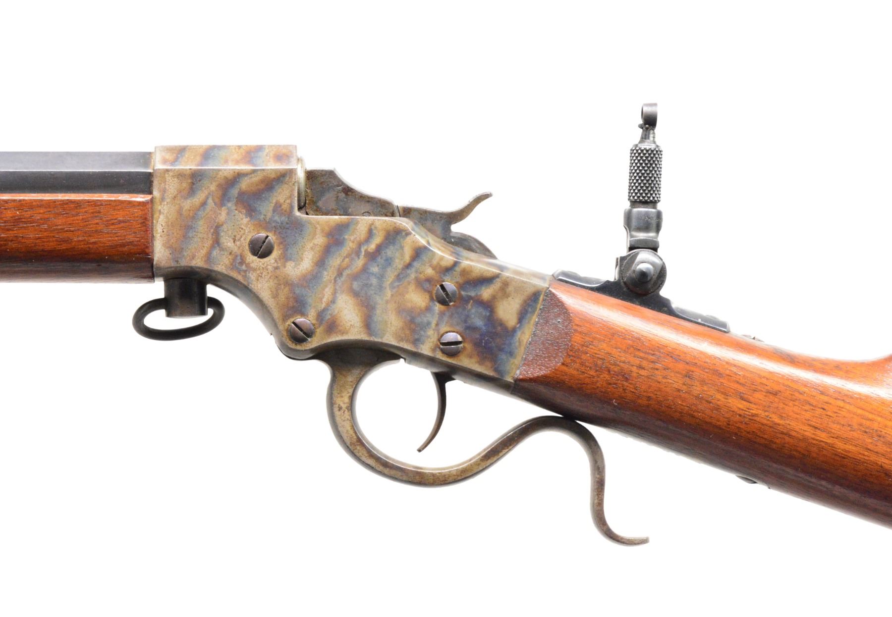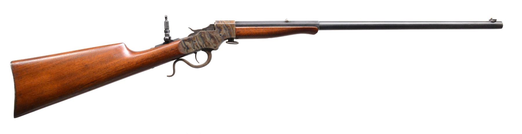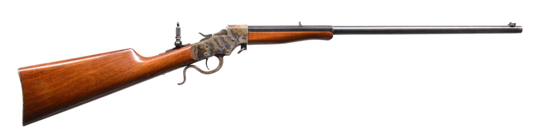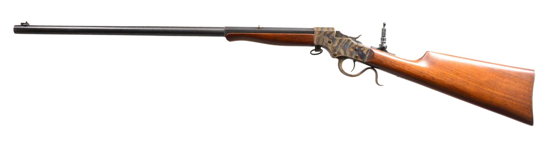 BOTH: cal. 25 RF. Bbls. 20" oct. to rnd. Fixed rear sights w/ aftermarket combination front sights & folding tang sights. Both case colored takedown style actions. Both have Schnabel tipped walnut forearms & straight grip stocks w/ crescent steel buttplates. 1) S# 11734. CONDITION: receiver retains over 90% vivid blue showing spots of very fine pitting. Lever retains some case colors w/ general surface corrosion. Buttplate retains light faded case colors. Bbl. retains 90% blue showings spots of freckling. Very good original wood finish showing light scattered scratches & marks. Bore is bright w/ strong rifling. (19-5758/DS). 2) S# 20131. CONDITION: action retains 90% case colors showing light fading. Lever has fading colors turning dark. Buttplate retains 70% case colors. Bbl. has 90% dull lightly faded blue. Wood has lightly worn wood finish showing scratches & marks. Bore is bright w/ strong rifling. (19-5760/DS). BOTH CURIO. $600-900.