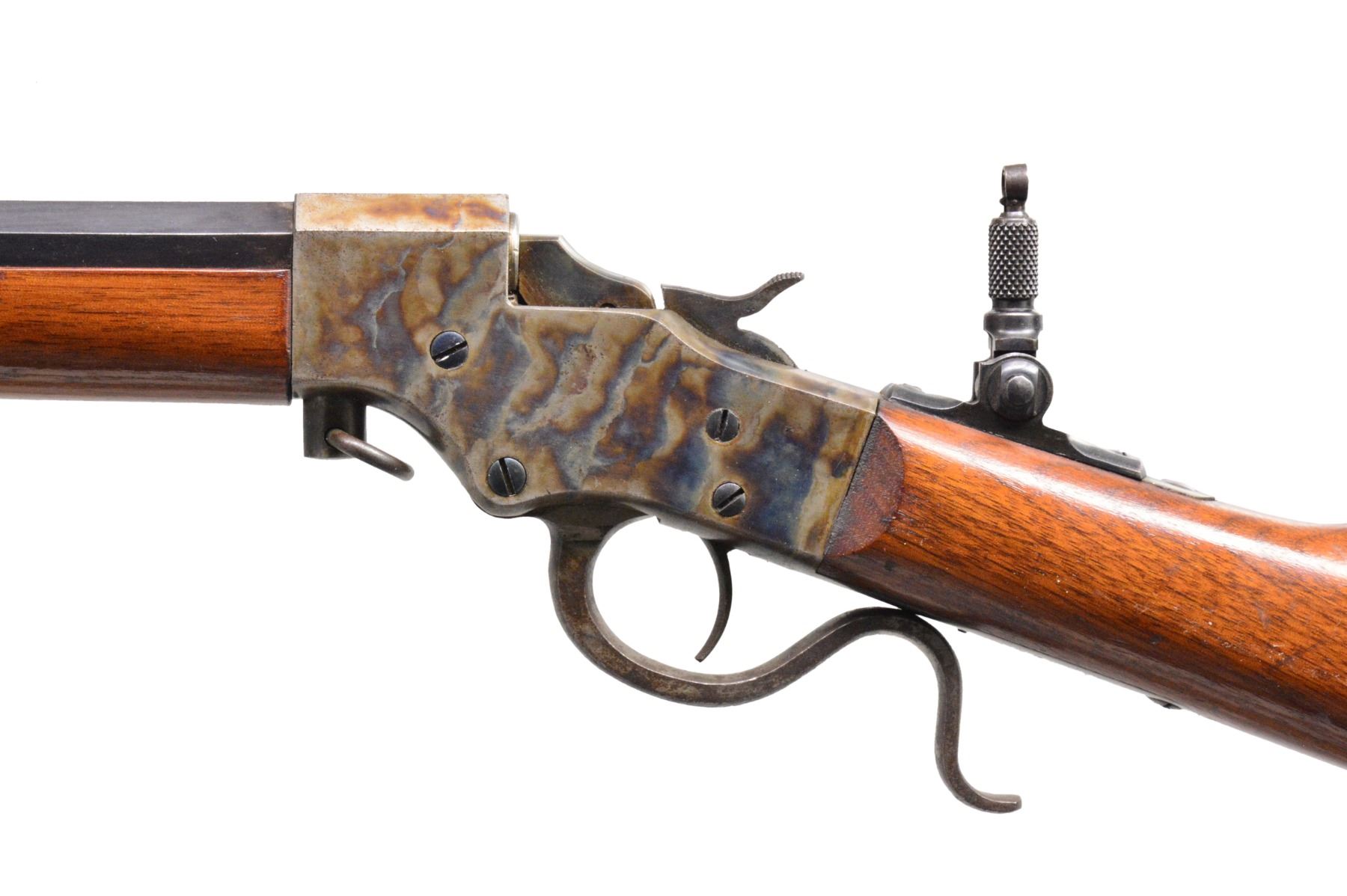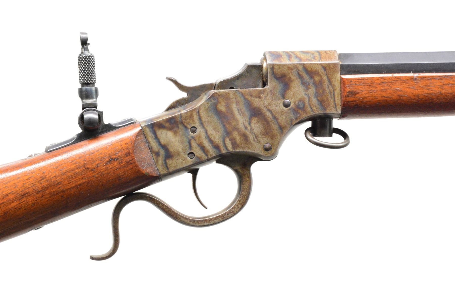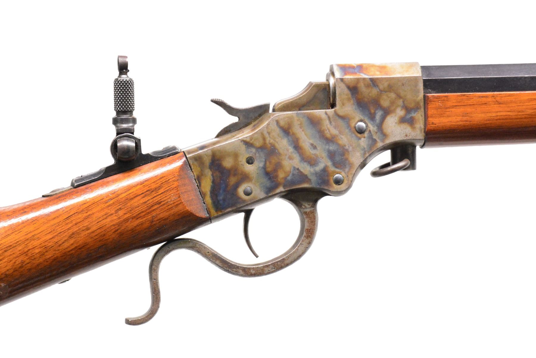 BOTH: cal. 25 RF. Bbls. 20" oct. to rnd. Fixed rear sights w/ aftermarket combination front sights & folding tang sights. Both case colored takedown style actions. Both have Schnabel tipped walnut forearms & straight grip stocks w/ crescent steel buttplates. 1) S# 11734. CONDITION: receiver retains over 90% vivid blue showing spots of very fine pitting. Lever retains some case colors w/ general surface corrosion. Buttplate retains light faded case colors. Bbl. retains 90% blue showings spots of freckling. Very good original wood finish showing light scattered scratches & marks. Bore is bright w/ strong rifling. (19-5758/DS). 2) S# 20131. CONDITION: action retains 90% case colors showing light fading. Lever has fading colors turning dark. Buttplate retains 70% case colors. Bbl. has 90% dull lightly faded blue. Wood has lightly worn wood finish showing scratches & marks. Bore is bright w/ strong rifling. (19-5760/DS). BOTH CURIO. $600-900.