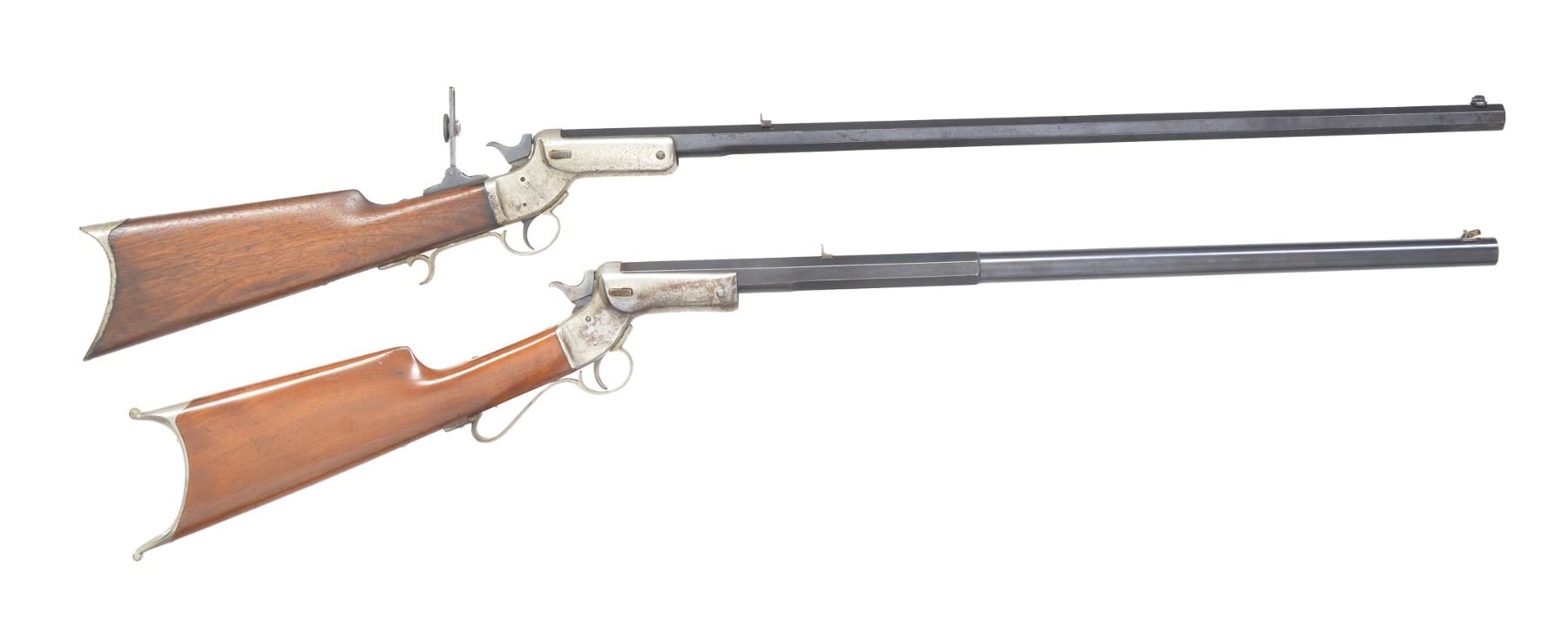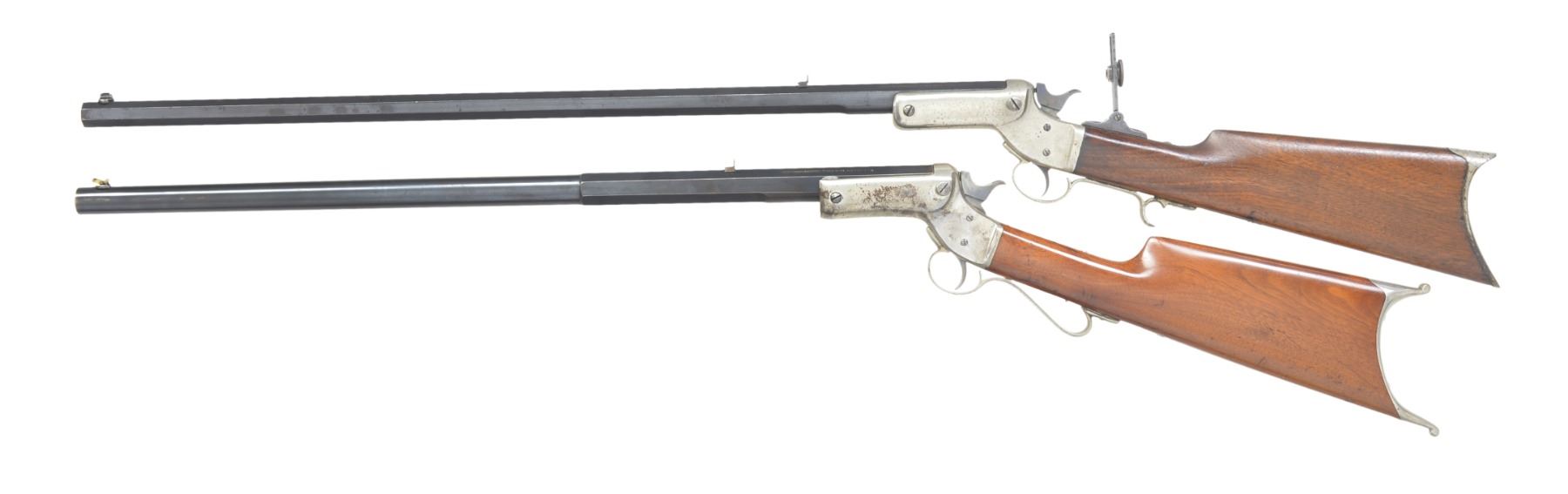 1) NO. 5. Cal. 25 Stevens RF. S# 5512. Bbl. 28" heavy oct. Fixed flat top V notch rear sight, dovetail mounted front sight having broken bead & Stevens vernier tang sight. Nickel plated action, trigger guard & crescent steel buttplate. Straight hand walnut stock. CONDITION: bbl. retains 80% lightly worn blue finish showing spots of fading & freckling. Action & buttplate retain 70% nickel. Showing spots of blistering, peeling & light corrosion. Stock has light coat of added varnish over scratches & marks having sm. chips around buttplate. Dark bore has worn rifling. (01-17056/DS). 2) Cal. 32 Extra Long RF. S# 23826. Bbl. 25 7/8" oct. to rnd. Combination front sight w/ gold ring w/ fixed V notch rear sight. Nickel finished action & finger curl trigger guard. Walnut stock w/ nickel finished brass Schuetzen buttplate. CONDITION: 80% dull lightly worn blue. Action retains 50% nickel blending w/ spots of flaking. Buttplate retains 80% nickel. Original stock finish shows scattered scratches, sm. dents & handling marks. Action sticks when opening. Bore has lightly darkened appearance retaining largely intact rifling. (01-17058/DS). BOTH ANTIQUE. $600-1,000.