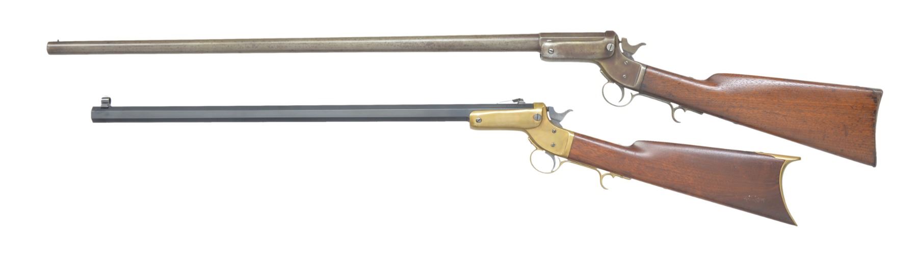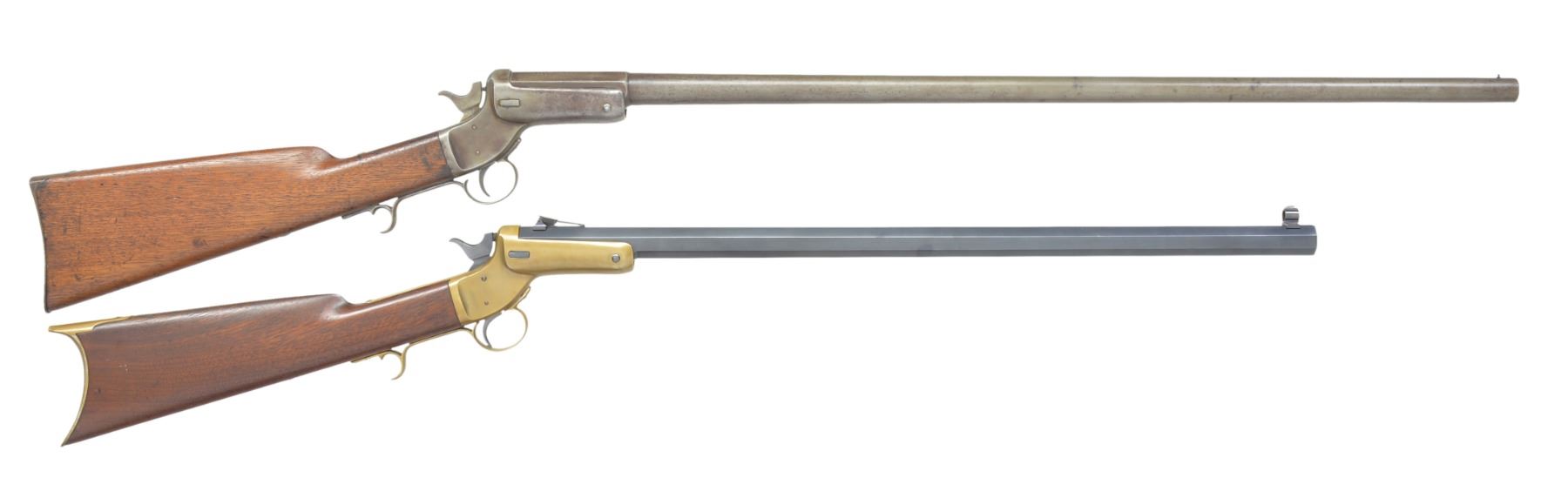 1) SHOTGUN. Cal. 12 Ga. S# 2802. Bbl. 30 5/8" w/ cyl. bore. Walnut stock w/ steel buttplate. CONDITION: metal has a gray/brown appearance from cold blue touch up over scattered spots of freckling & very light pitting. Stock is sanded w/ an open pored refinish showing numerous handling marks, chips at toe & sm. crack at bottom of right side of action. Bore is dark & pitted w/ a faint ring bulge near the front sight. (01-17055/DS). 2) RIFLE. Cal. 38 CF, converted from RF. S# 266. Bbl. 24 1/8" heavy oct.. Combination globe front sight w/ Stevens Hunter's Pet style combination rear sight. Brass frame, trigger guard & crescent buttplate originally had nickel finish. Walnut stock. CONDITION: bbl., sights hammer & trigger retain 98% reblued finish. Frame & other brass parts show traces of nickel finish in protected areas w/ exposed brass having acquired a mild pleasing patina. Refinished stock shows scattered handling marks. Bore has darkened appearance retaining generally sound rifling & showing spots of light pitting. (01-17064/DS). BOTH ANTIQUE. $500-750.