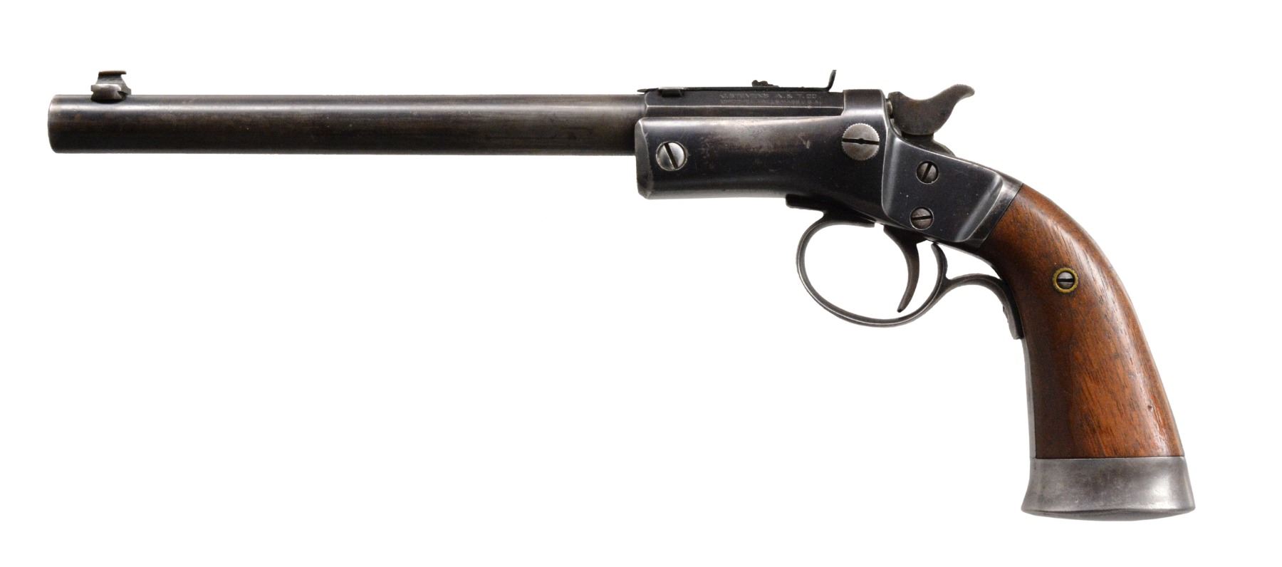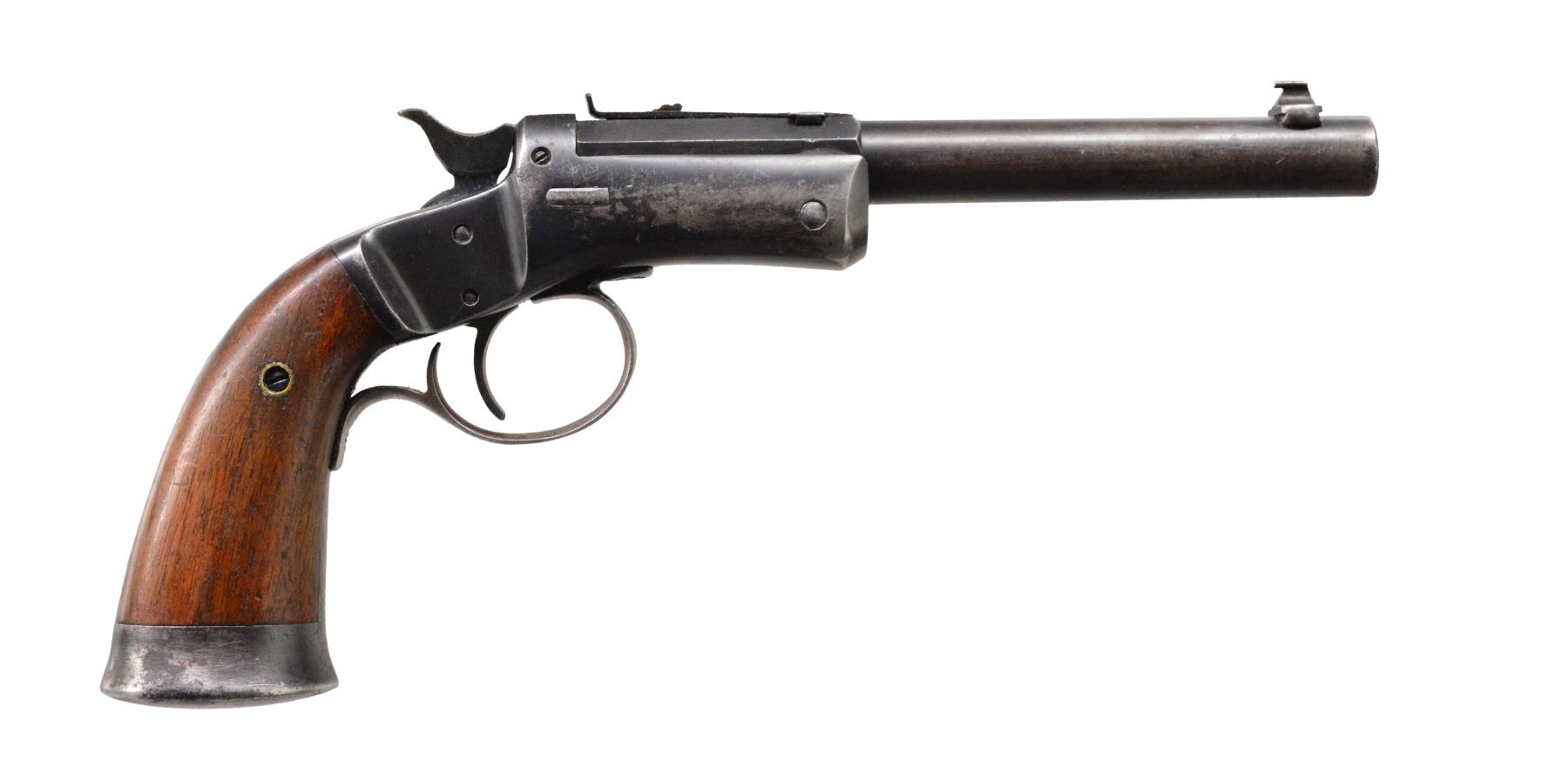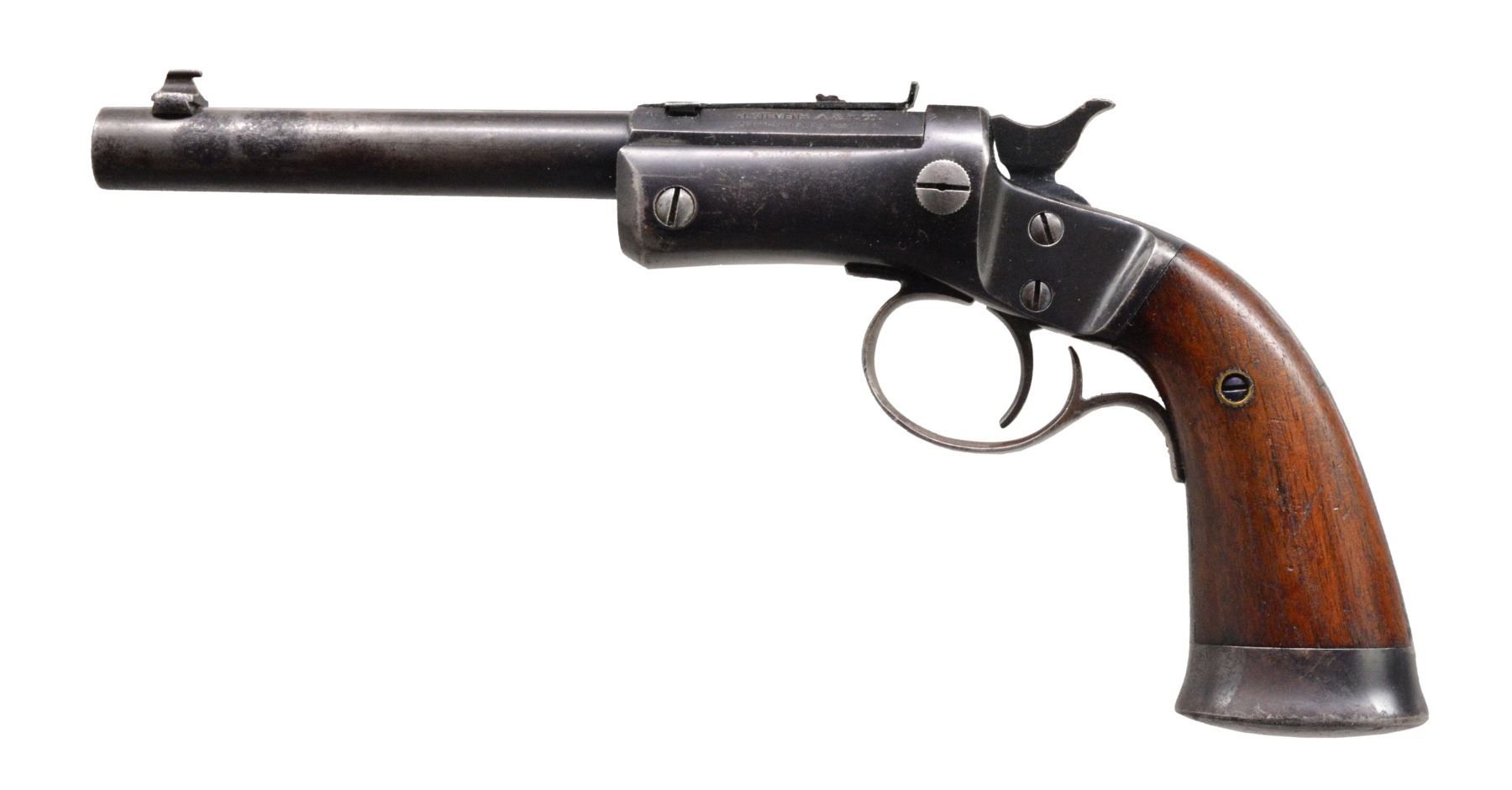 ALL: full blue finish. Iron frames w/ mushroom shaped release buttons, conventional triggers, linkage operated extractors, frame mounted firing pins, iron buttcaps & 2 piece walnut grips. 1) OFFHAND TARGET. Cal. 25 RF. S# 48710. Bbl. 6" rnd. w/ oct. shank. Bead front sight w/ elevation adj. U notch rear sight. Cast iron trigger guard. Checkered hammer extension. CONDITION: 60% worn blue showing scattered spots of pitting. Grips have worn finish w/ scratches & marks. Bore has dark appearance w/ worn rifling & light pitting. (19-5689/DS). 2) OFFHAND TARGET. Cal. 22 RF. S# 53358. Bbl. 8" rnd. w/ oct. shank. Bead front sight w/ elevator adj. U notch rear sight. Cast iron trigger guard. Checkered hammer spur. Offhand target models were mfg. 1907-1916. CONDITION: 60% dull & fading blue showing scratches. Grips have worn finish w/ handling marks. Bore is dark w/ light pitting retaining intact rifling. (19-5695/DS). 3) OFFHAND. Cal. 22 RF. S# 38089. Bbl. 6" rnd. w/ oct. shank. Bead front sight w/ elevator adj. U notch rear sight. Stamped sheet metal trigger guard as used after 1929. Hammer has grooved spur. CONDITION: bbl. & action have 60% lightly faded blue showing wear on backstrap & buttcap. Sanded & refinished grips show dents & handling marks. Bore is bright w/ strong rifling. (19-5697/DS). ALL CURIO. $750-1,200.