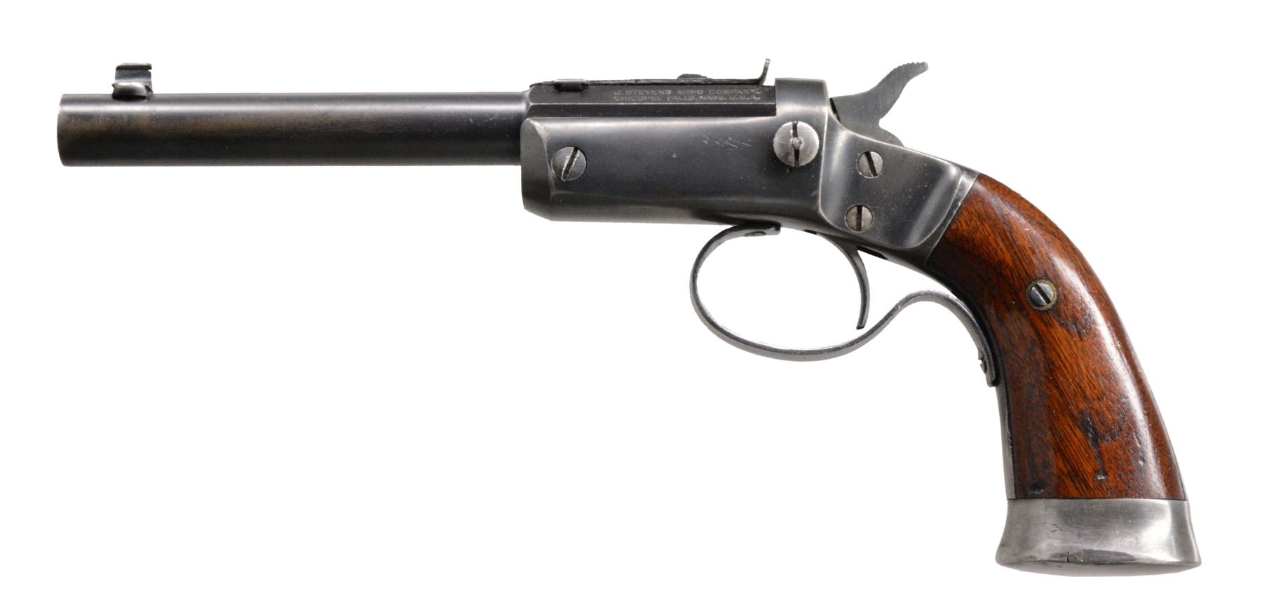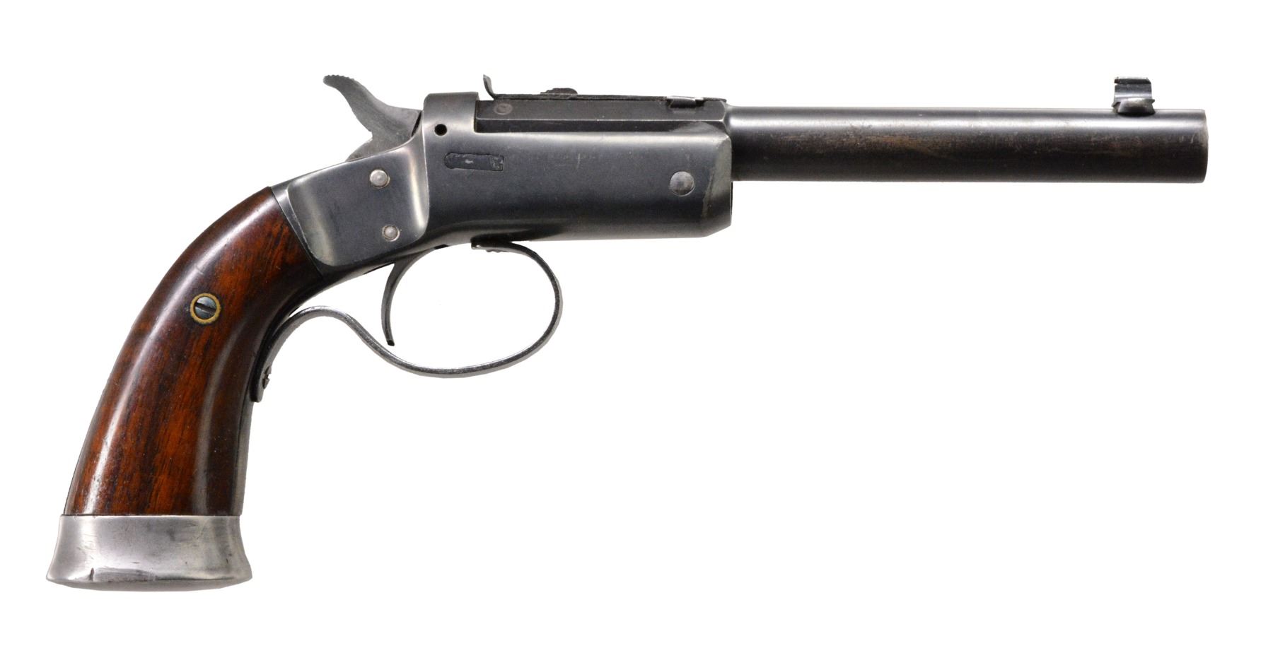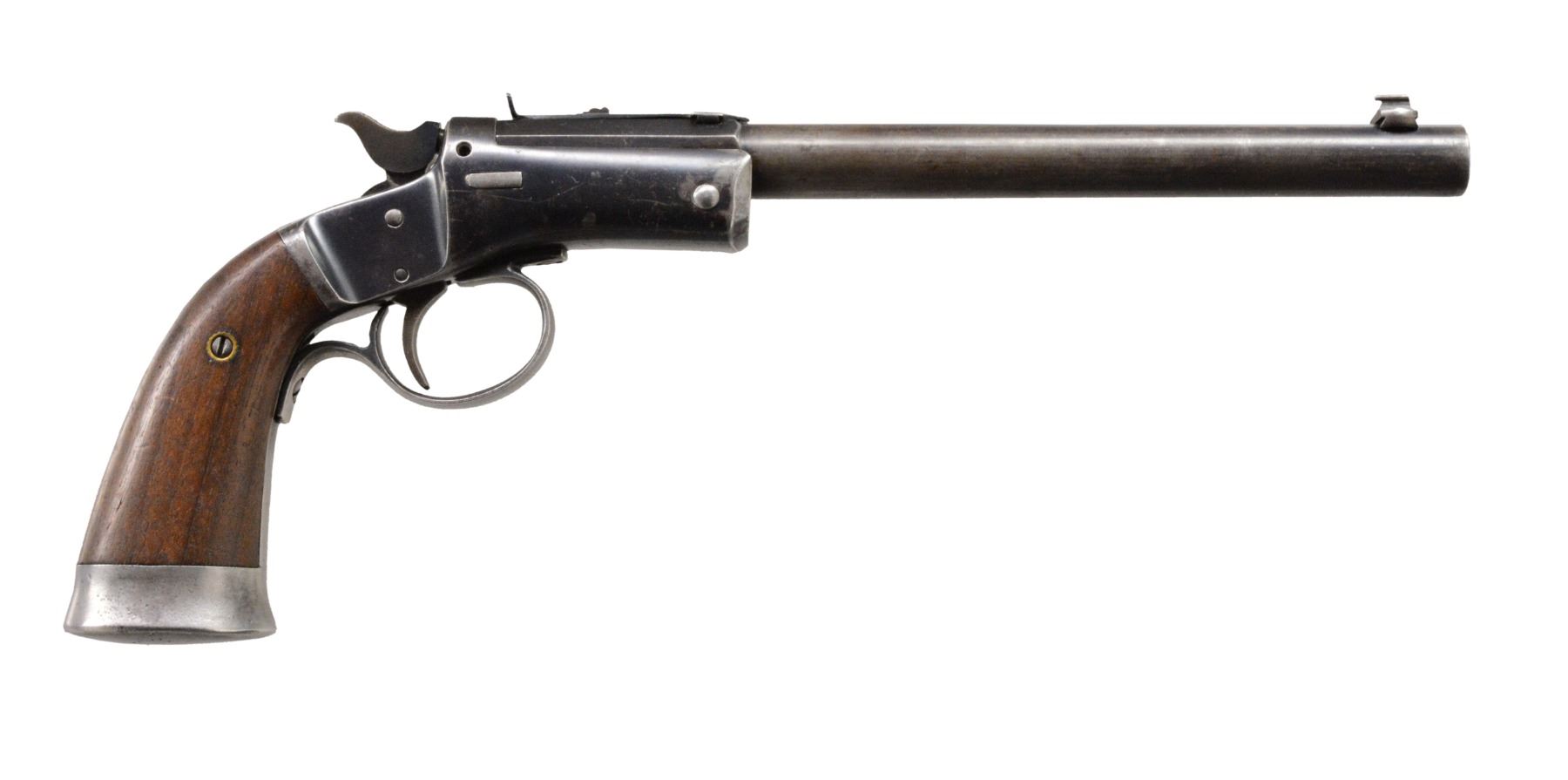 ALL: full blue finish. Iron frames w/ mushroom shaped release buttons, conventional triggers, linkage operated extractors, frame mounted firing pins, iron buttcaps & 2 piece walnut grips. 1) OFFHAND TARGET. Cal. 25 RF. S# 48710. Bbl. 6" rnd. w/ oct. shank. Bead front sight w/ elevation adj. U notch rear sight. Cast iron trigger guard. Checkered hammer extension. CONDITION: 60% worn blue showing scattered spots of pitting. Grips have worn finish w/ scratches & marks. Bore has dark appearance w/ worn rifling & light pitting. (19-5689/DS). 2) OFFHAND TARGET. Cal. 22 RF. S# 53358. Bbl. 8" rnd. w/ oct. shank. Bead front sight w/ elevator adj. U notch rear sight. Cast iron trigger guard. Checkered hammer spur. Offhand target models were mfg. 1907-1916. CONDITION: 60% dull & fading blue showing scratches. Grips have worn finish w/ handling marks. Bore is dark w/ light pitting retaining intact rifling. (19-5695/DS). 3) OFFHAND. Cal. 22 RF. S# 38089. Bbl. 6" rnd. w/ oct. shank. Bead front sight w/ elevator adj. U notch rear sight. Stamped sheet metal trigger guard as used after 1929. Hammer has grooved spur. CONDITION: bbl. & action have 60% lightly faded blue showing wear on backstrap & buttcap. Sanded & refinished grips show dents & handling marks. Bore is bright w/ strong rifling. (19-5697/DS). ALL CURIO. $750-1,200.